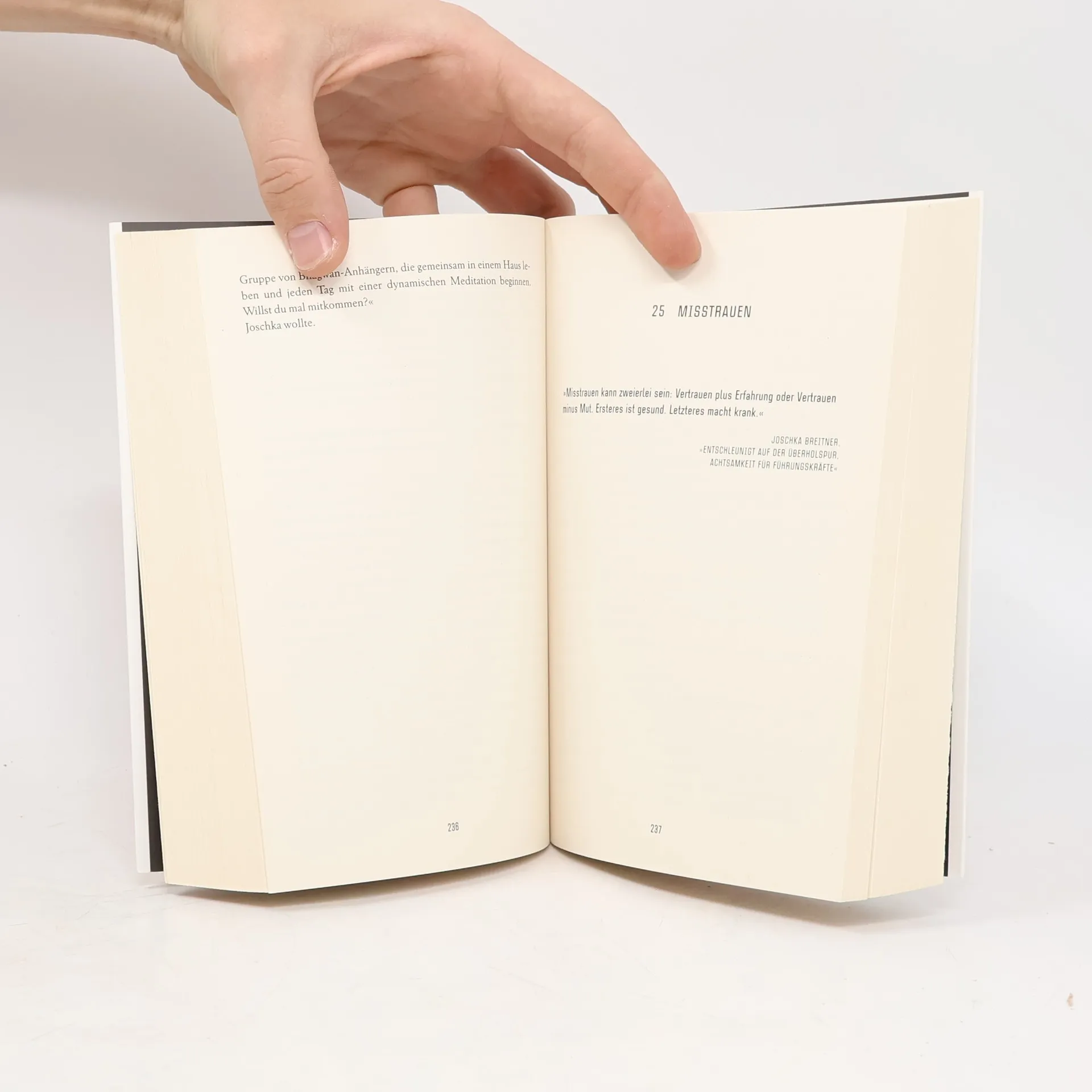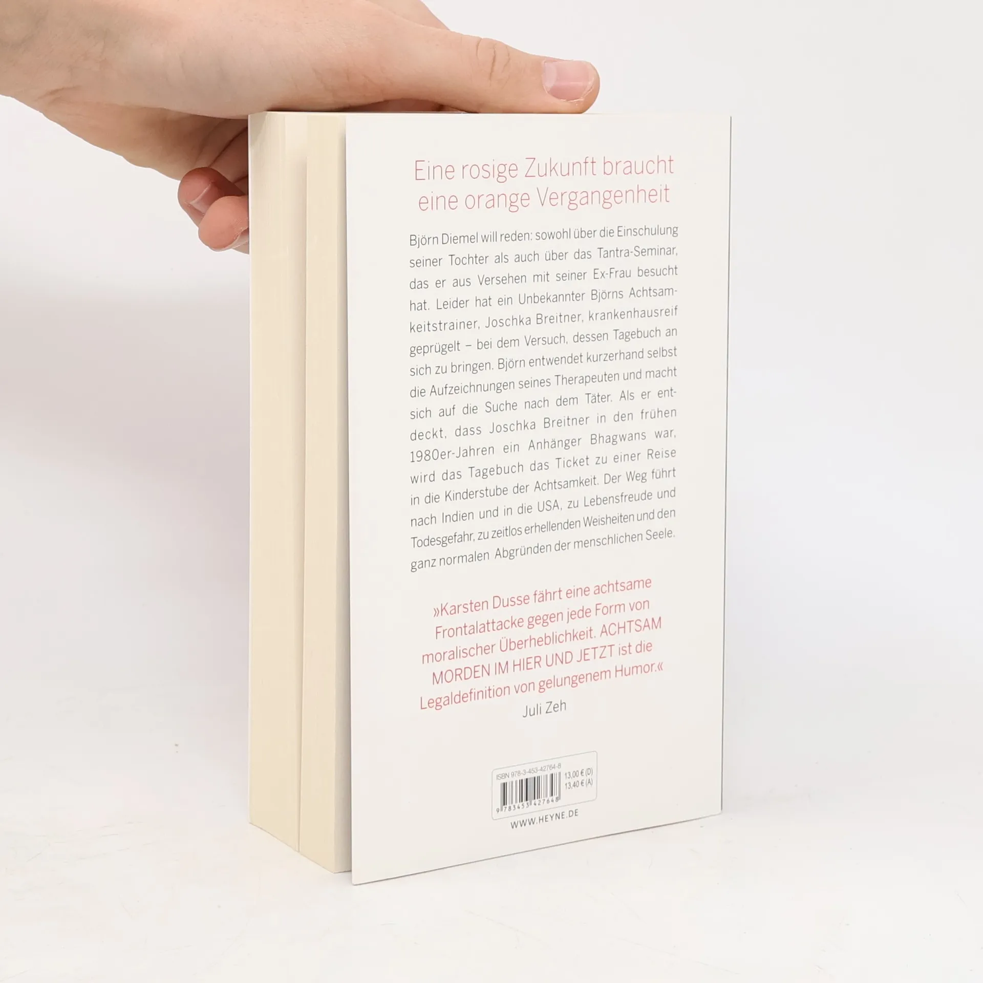 Wenn die Vergangenheit deines Therapeuten deiner Zukunft im Weg steht, ist es Zeit, im Hier und Jetzt zu leben Björn Diemel will reden: sowohl über die Einschulung seiner Tochter als auch über das Tantra-Seminar, das er aus Versehen mit seiner Ex-Frau besucht hat. Leider hat ein Unbekannter Björns Achtsamkeitstrainer, Joschka Breitner, krankenhausreif geprügelt – bei dem Versuch, dessen Tagebuch an sich zu bringen. Björn entwendet kurzerhand selbst die Aufzeichnungen seines Therapeuten und macht sich auf die Suche nach dem Täter. Als er entdeckt, dass Joschka Breitner in den frühen 1980er Jahren ein Anhänger Bhagwans war, wird das Tagebuch das Ticket zu einer Reise in die Kinderstube der Achtsamkeit. Der Weg führt nach Indien und in die USA, zu Lebensfreude und Todesgefahr, zu zeitlos erhellenden Weisheiten und den ganz normalen Abgründen der menschlichen Seele.