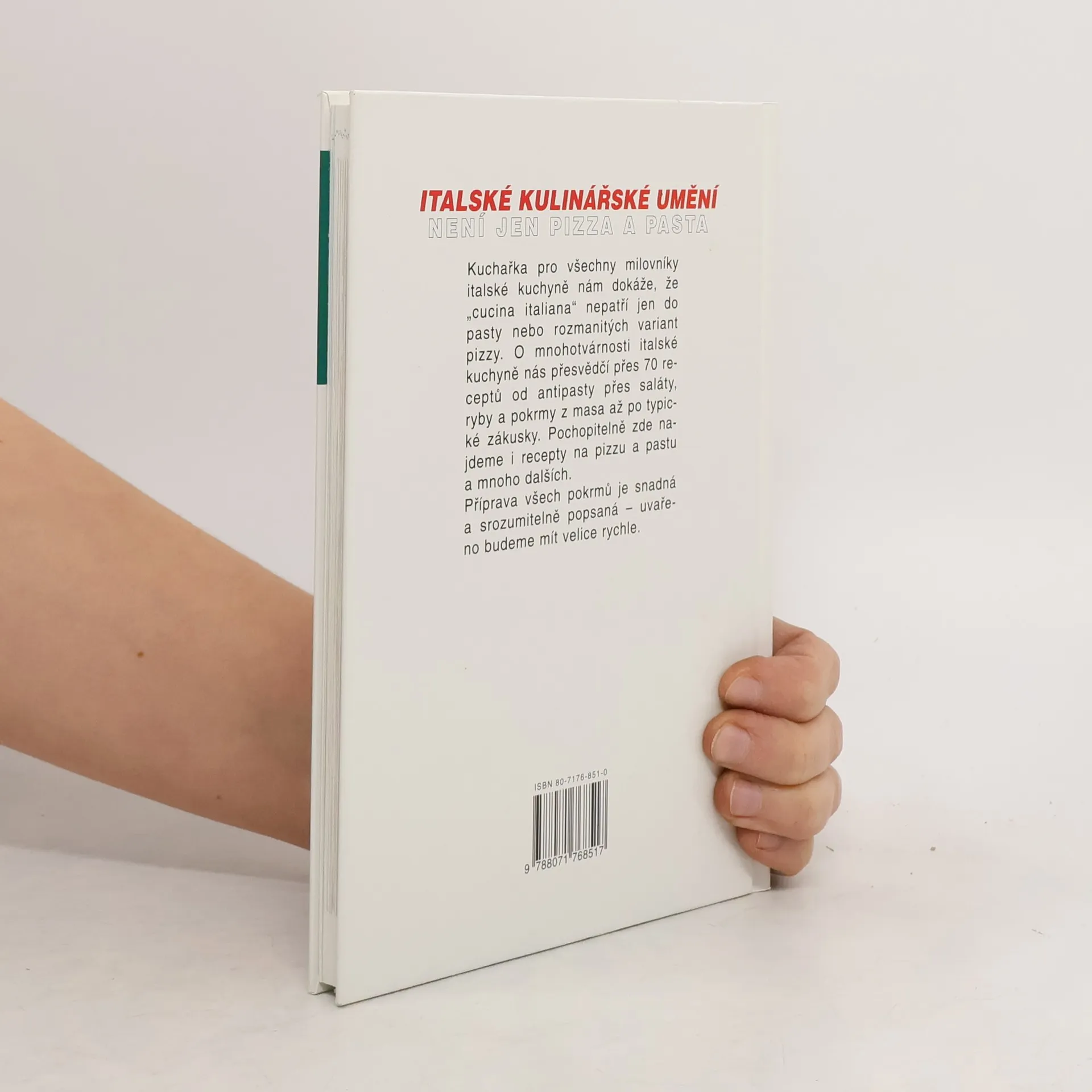 Kuchařka pro všechny milovníky italské kuchyně nám dokáže, že "cucina italiana" nepatří jen do pasty nebo rozmanitých variant pizzy. O mnohotvárnosti italské kuchyně nás přesvědčí přes 70 receptů od antipasty přes saláty, ryby a pokrmy z masa až po typické zákusky. Pochopitelně zde najdeme i recepty na pizzu a pastu a mnoho dalších. Příprava všech pokrmů je snadná a srozumitelně popsaná - uvařeno budete mít velice rychle.