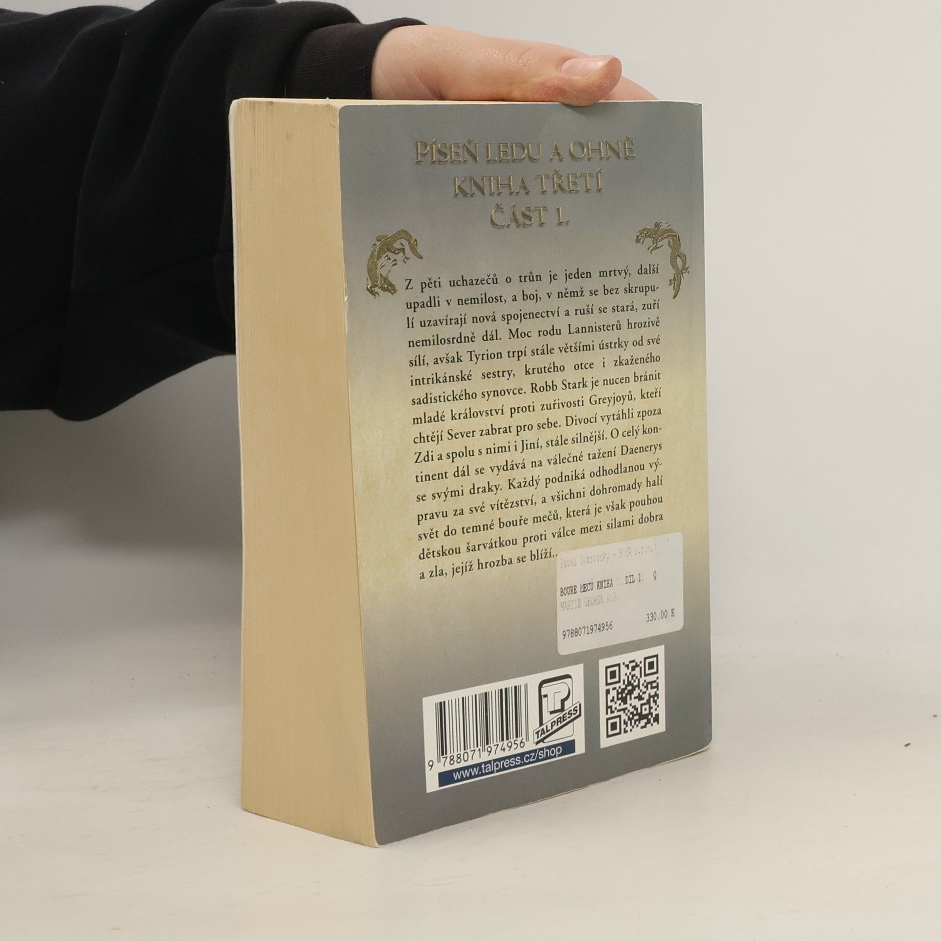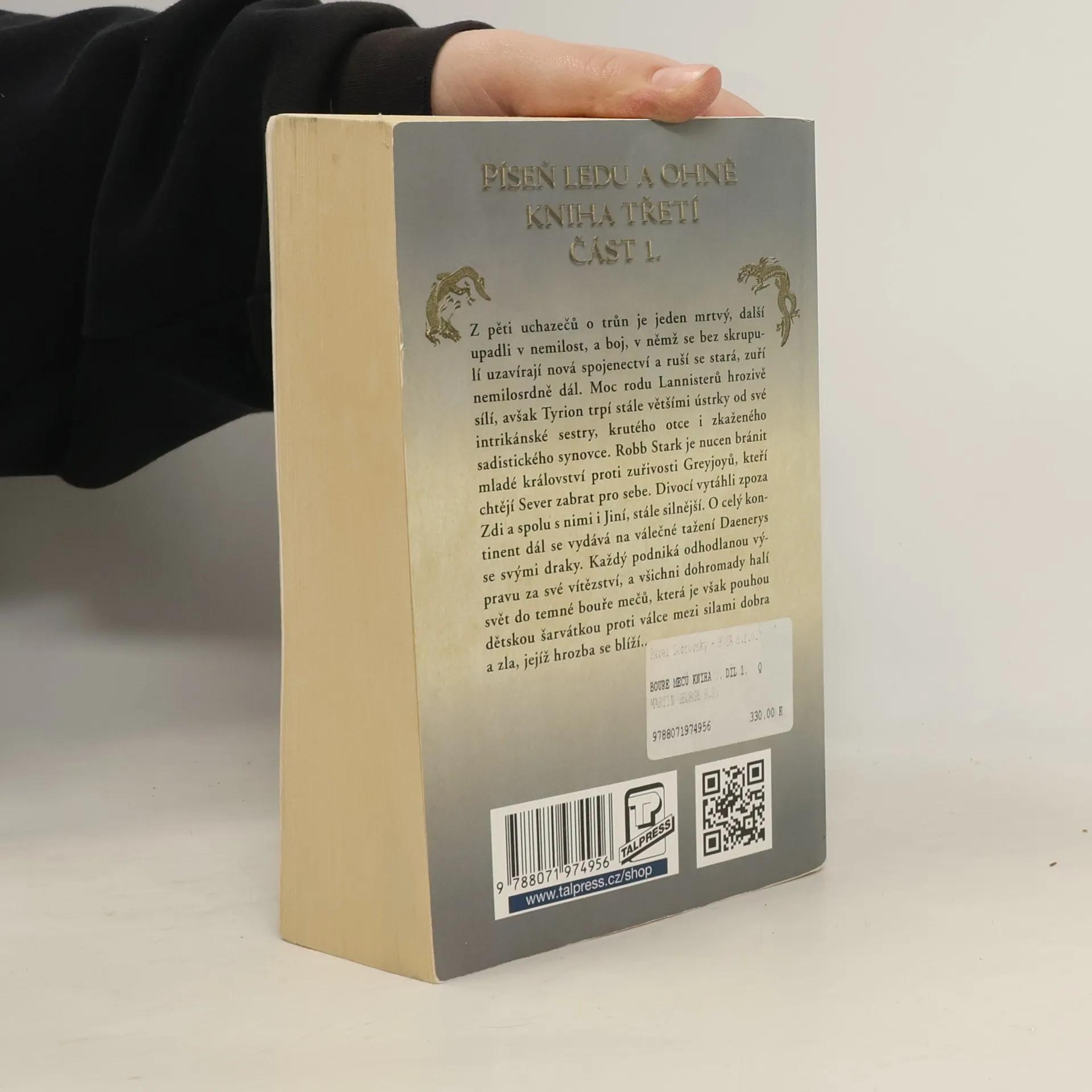 Z pěti uchazečů o trůn je jeden mrtvý, další upadli v nemilost, a boj, v němž jsou bez skrupulí uzavírána nová spojenectví a rušena stará, zuří nemilosrdně dál. Moc rodu Lannisterů hrozivě sílí, avšak Tyrion trpí stále většími ústrky od své intrikánské sestry, krutého otce i zkaženého sadistického synovce. Robb Stark je nucen bránit mladé království proti zuřivosti Greyjoyů, kteří si chtějí Sever zabrat pro sebe. Divocí vytáhli zpoza Zdi a spolu s nimi nabývají na síle Jiní. O celý kontinent dál se vydává na válečné tažení Daenerys a její draci nebezpečně rostou. Každý podniká odhodlanou výpravu za své vítězství, a všichni dohromady halí svět do temné bouře mečů, která je však pouhou dětskou šarvátkou ve srovnání s válkou mezi silami dobra a zla, jejíž hrozba se blíží… Druhé vydání. -- zdroj: www.legie.info --
