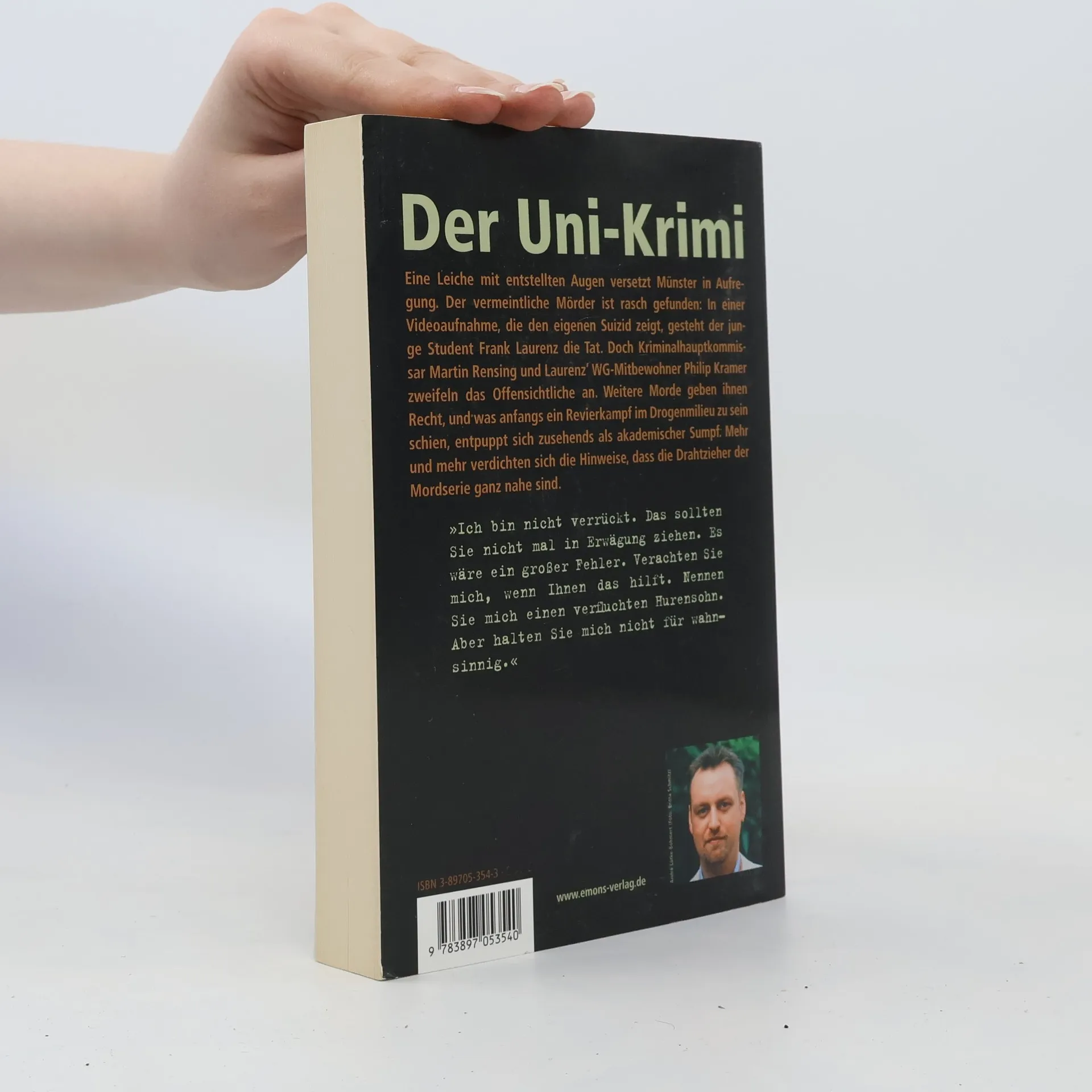 Philip Kramers Leben gerät aus den Fugen. In einer Videoaufnahme, die den eigenen Suizid zeigt, gesteht sein Freund und WG-Mitbewohner Frank Laurenz den Mord an einem angesehen Chirurgen des Münsteraner Universitätsklinikums. Was hatte Frank nur dazu getrieben, seinem Opfer die Augen auszustechen? Was war in den letzten Tagen seines Lebens geschehen, dass er sich in seinem Zimmer verbarrikadierte und niemanden mehr an sich ran ließ? Alle Spuren führen zur Wilhems-Universität, hinter deren altehrwürdiger Fassade ein Abgrund aus Drogen, Gewalt und Intrigen lauert. Doch Philip ist nicht der Einzige, der nach Antworten sucht. Auch Hauptkommissar Martin Rensing zweifelt das Offensichtliche an - wenn auch aus anderen Grü Warum hatte der Selbstmörder seine Videobotschaft mit philosophischen Zitaten gespickt? Und warum versuchen Laurenz´ Professoren Einfluss auf die polizeilichen Ermittlungen zu nehmen? Student und Polizist stechen in ein akademisches Wespennest.Und das Morden geht weiter ...