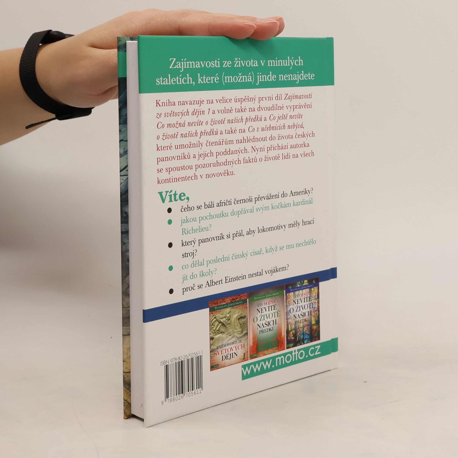 Zajímavosti ze života v minulých staletích, které (možná) jinde nenajdete Kniha navazuje na velice úspěšný první díl Zajímavosti ze světových dějin 1 a volně také na dvoudílné vyprávění Co možná nevíte o životě našich předků a Co ještě nevíte o životě našich předků také naCo v učebnicích nebývá 2, které přinášely řadu zajímavostí ze života českých panovníků a jejich poddaných. Nyní přichází autorka se spoustou zajímavých informací o životě lidí na všech kontinentech v novověku. Víte, čeho se báli afričtí černoši převážení do Ameriky? Jakou pochoutku dopřával svým kočkám kardinál Richelieu? Který panovník si přál, aby lokomotivy měly hrací stroj? Co dělal poslední čínský císař, když se mu nechtělo jít do školy? Proč se Albert Einstein nestal vojákem?