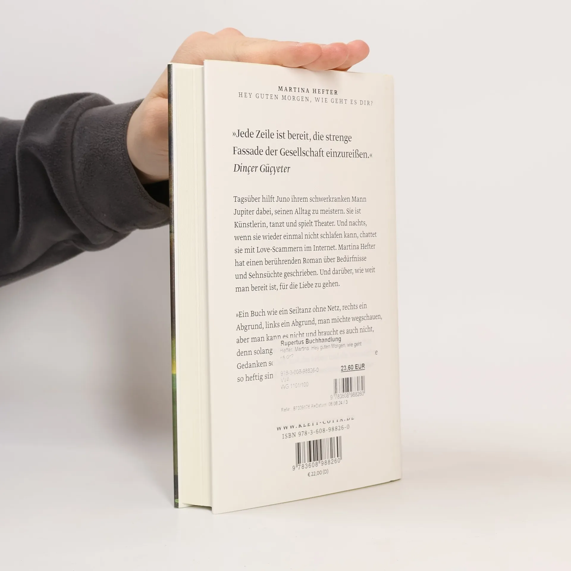 Tagsüber hilft Juno ihrem schwerkranken Mann Jupiter dabei, seinen Alltag zu meistern. Außerdem ist sie Künstlerin, tanzt und spielt Theater. Und nachts, wenn sie wieder einmal nicht schlafen kann, chattet sie mit Love-Scammern im Internet. Martina Hefter hat einen berührenden Roman über Bedürfnisse und Sehnsüchte im Leben geschrieben. Und darüber, wie weit man bereit ist, für die Liebe zu gehen.Juno schreibt online mit Männern, die Frauen online ihre Liebe gestehen und so versuchen, sie um ihr Geld zu bringen. Doch statt darauf hereinzufallen, werden genau diese Männer zu einer Form von Freiheit für Juno. In den Gesprächen kann sie sein, wer sie will und sagen, was sie will – und das vermeintlich ohne Konsequenzen. Ganz im Gegensatz zu ihrem sonstigen Leben, in dem sie immer unterwegs, immer besorgt um Jupiter, immer beschäftigt und eingebunden ist. Also flüchtet Juno ab und zu vor ihrem Alltag ins Internet und spielt dort Spielchen mit Männern, die sie anlügen. Sie selbst wird zur Lügnerin. Aber ist es nicht so, dass man sich beim Lügen zuallererst selbst belügt? Eines Tages trifft Juno auf Benu, der ihre Behauptungen ebenso durchschaut wie sie seine. Und trotz der Entfernung zwischen ihnen entsteht eine Verbindung. »Hey guten Morgen, wie geht es dir« ist ein tiefgehender Roman, aber so leichtfüßig wie eine Komödie.