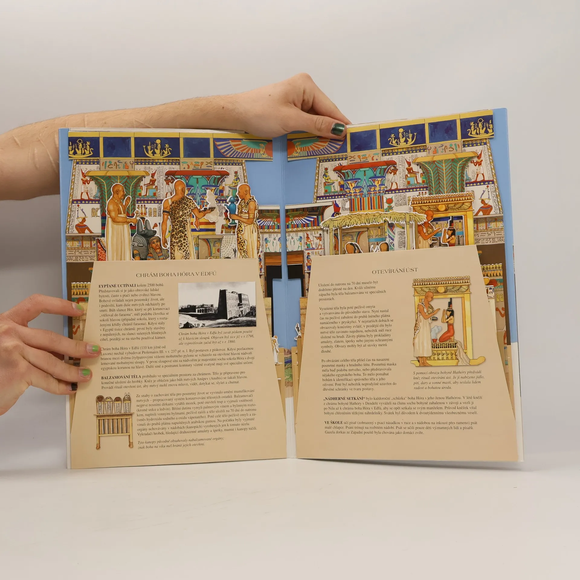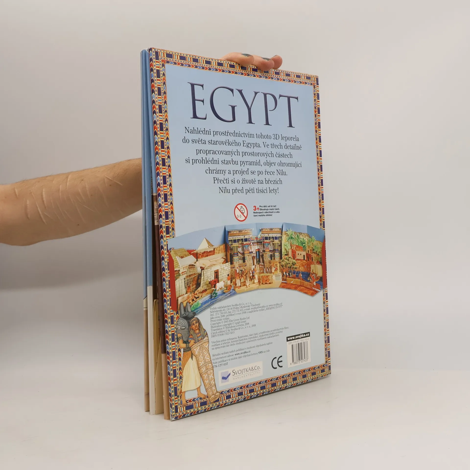 Prostřednictvím tohoto fascinujícího rozkládacího leporela vstoupíte do světa starověkého Egypta. Ve třech detailně propracovaných prostorových částech si prohlédnete stavbu pyramid, objevíte ohromující chrámy a projedete se po řece Nilu. Dozvíte se i mnoho zajímavých informací o životě v Egyptě před 3000 lety. Postavte si část této starověké civilizace přímo u vás doma!
