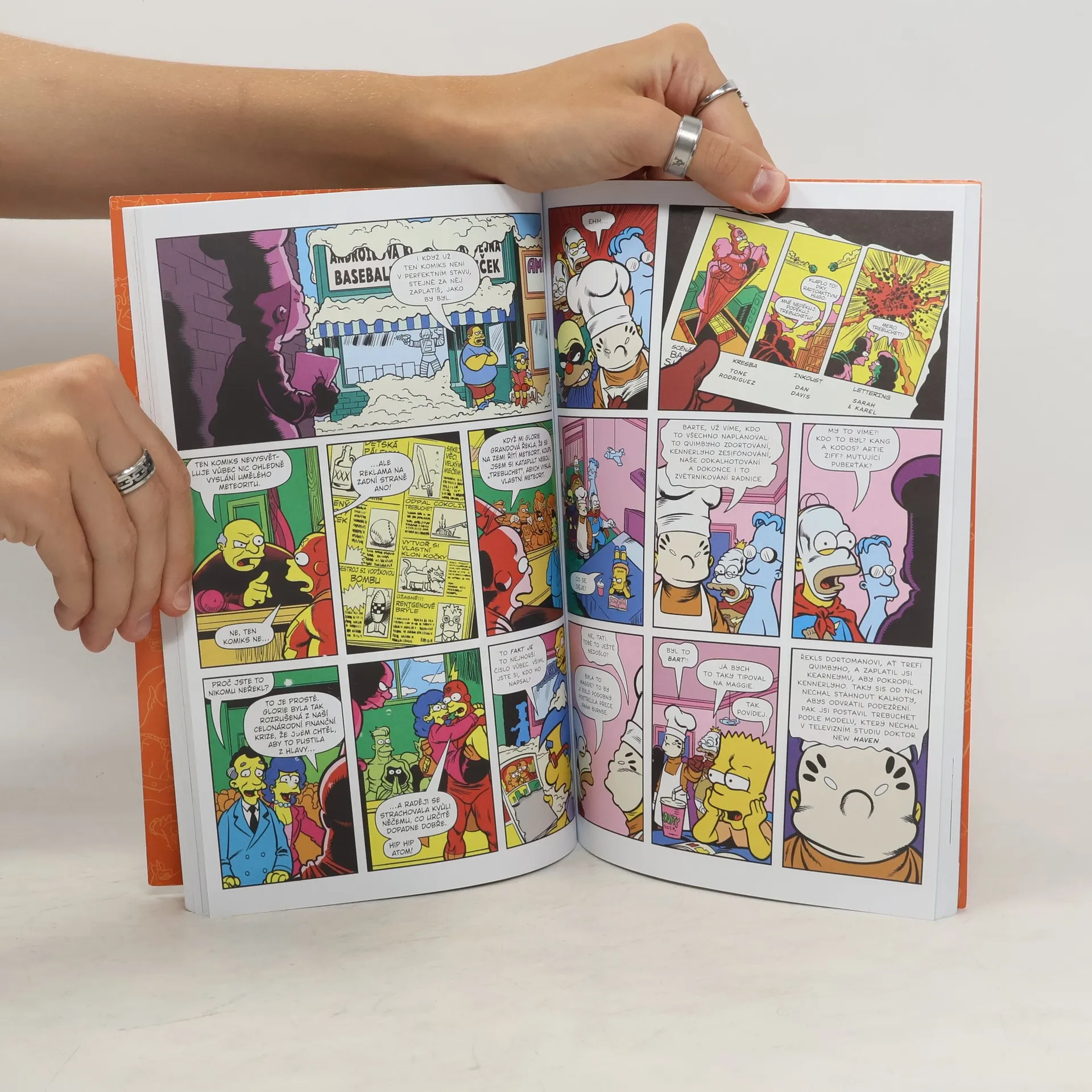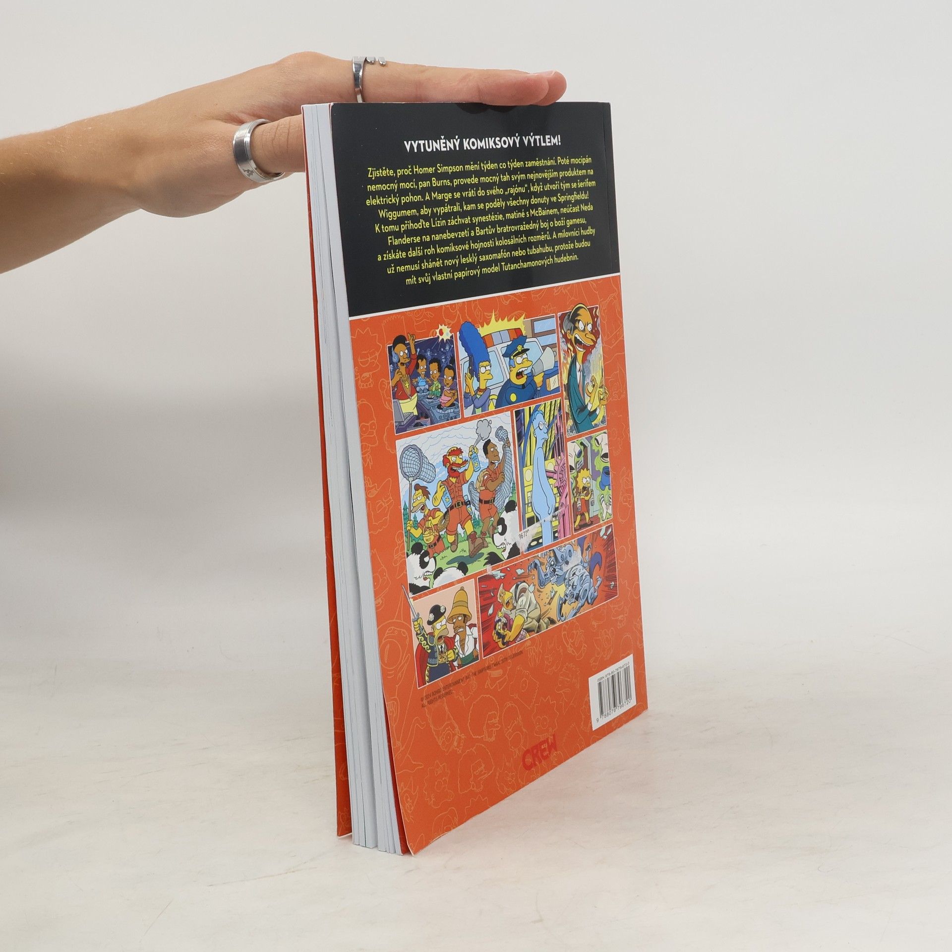 Další ze souborů humorných komiksových příběhů na motivy animovaného televizního seriálu ze života "takové normální americké rodinky" Simpsonových. Zjistěte, proč Homer Simpson mění týden co týden zaměstnání. Poté mocipán nemocný mocí, pan Burns, provede mocný tah svým nejnovějším produktem na elektrický pohon. A Marge se vrátí do svého "rajónu", když utvoří tým se šerifem Wiggumem, aby vypátrali, kam se poděly všechny donuty ve Springfieldu! K tomu přihoďte Lízin záchvat synestézie, matiné s McBainem, neúčast Neda Flanderse na nanebevzetí a Bartův bratrovražedný boj o boží gamesu, a získáte další roh komiksové hojnosti kolosálních rozměrů. A milovníci hudby už nemusí shánět nový lesklý saxomafón nebo tubahubu, protože budou mít svůj vlastní papírový model Tutanchamonových hudebnin. Nakladatelská anotace.