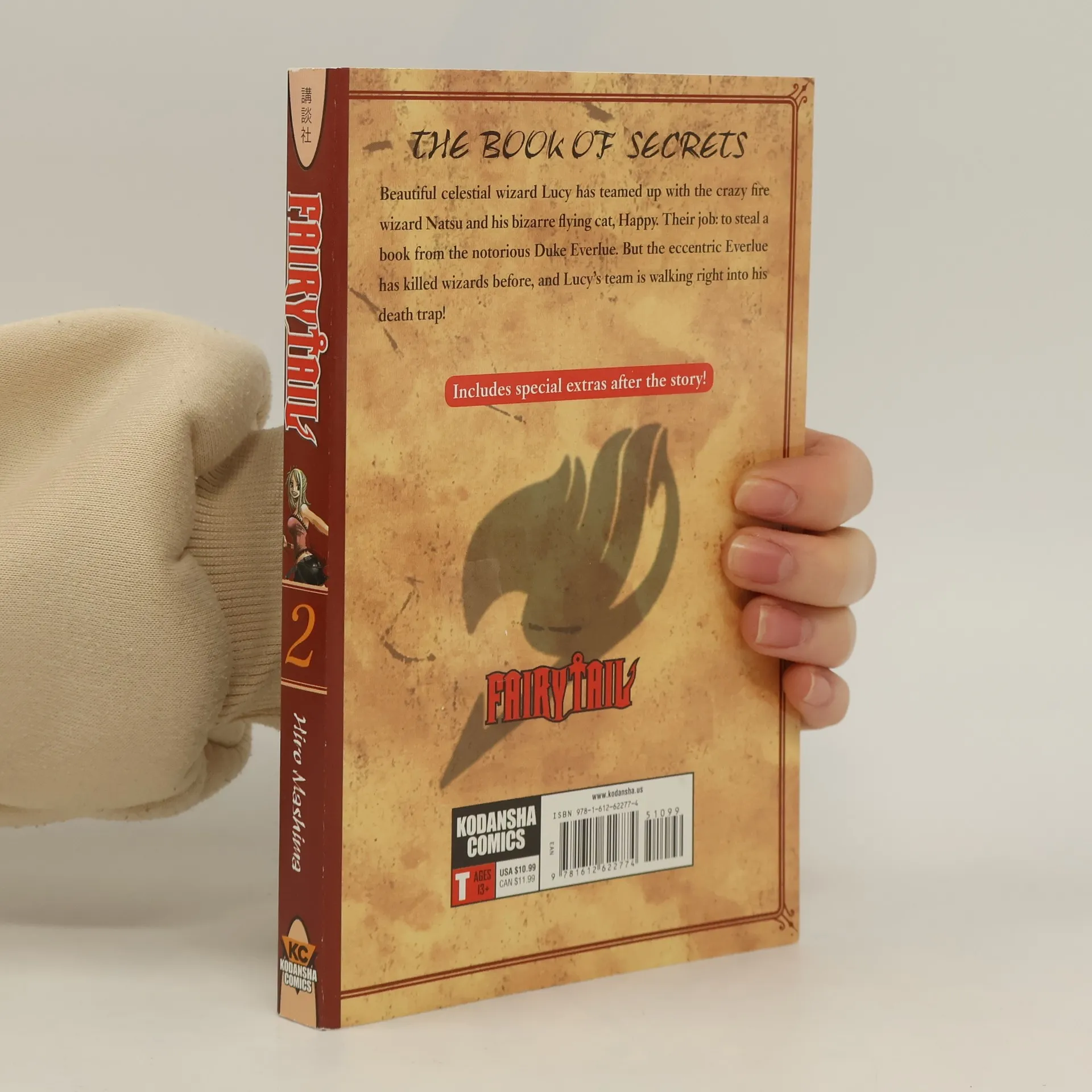 THE BOOK OF SECRETS In the second volume of Fairy Tail, beautiful celestial wizard Lucy as teamed up with the crazy fire wizard Natsu and his bizarre flying cat, Happy. Their job: to steal a book from the notorious Duke Everlue. But the eccentric Everlue has killed wizards before, and Lucy’s team is walking right into his death trap! Includes special extras after the story!