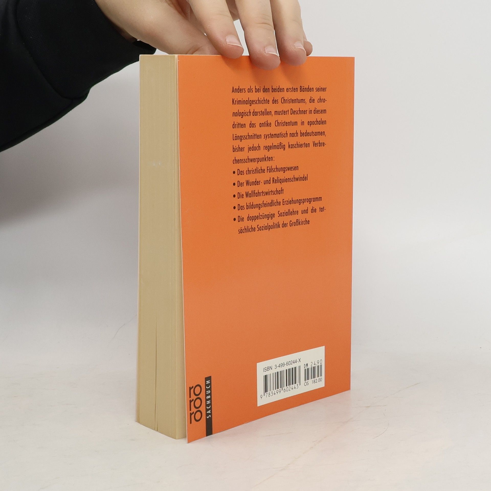 Anders als in den beiden ersten Bänden seiner „Kriminalgeschichte des Christentums“, die chronologisch darstellen, mustert Deschner in diesem dritten das antike Christentum in epochalen Längsschnitten systematisch nach bedeutsamen, bisher jedoch regelmäßig kaschierten Verbrechensschwerpunkten: das christliche Fälschungswesen, der Wunder- und Reliquienschwindel, die Wallfahrtswirtschaft, das bildungsfeindliche Erziehungsprogramm und die doppelzüngige Soziallehre bzw. die tatsächliche Sozialpolitik der Großkirche.