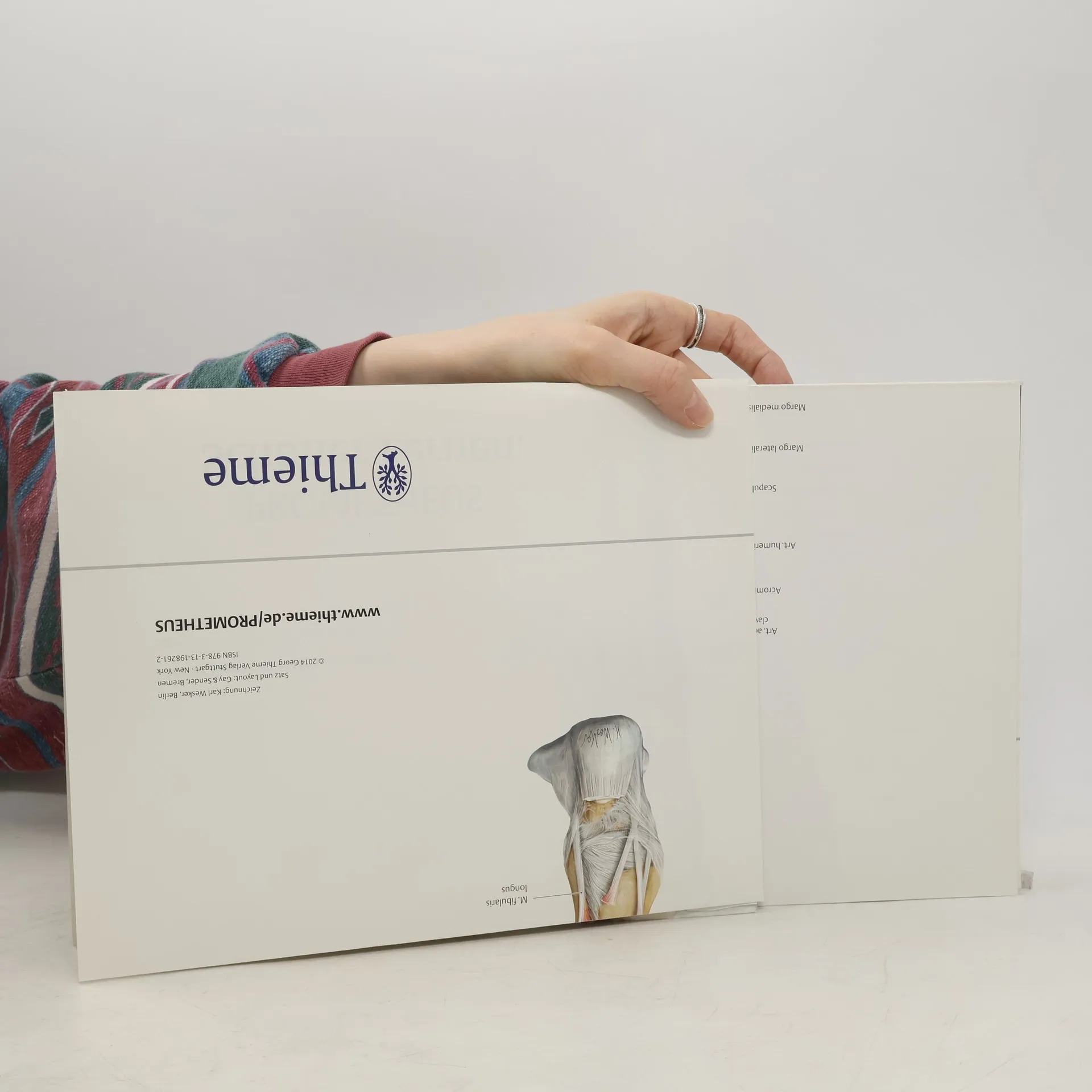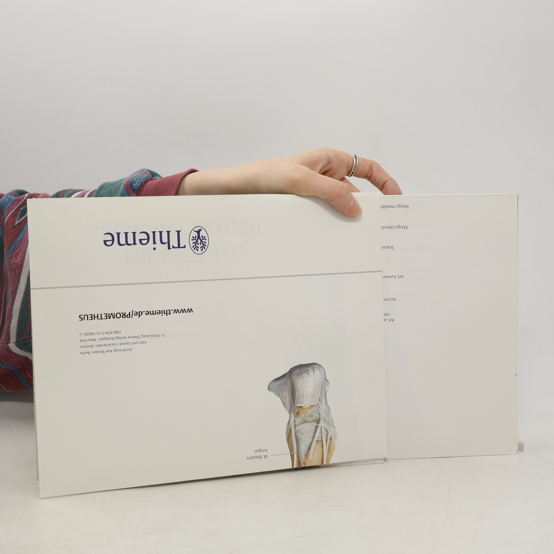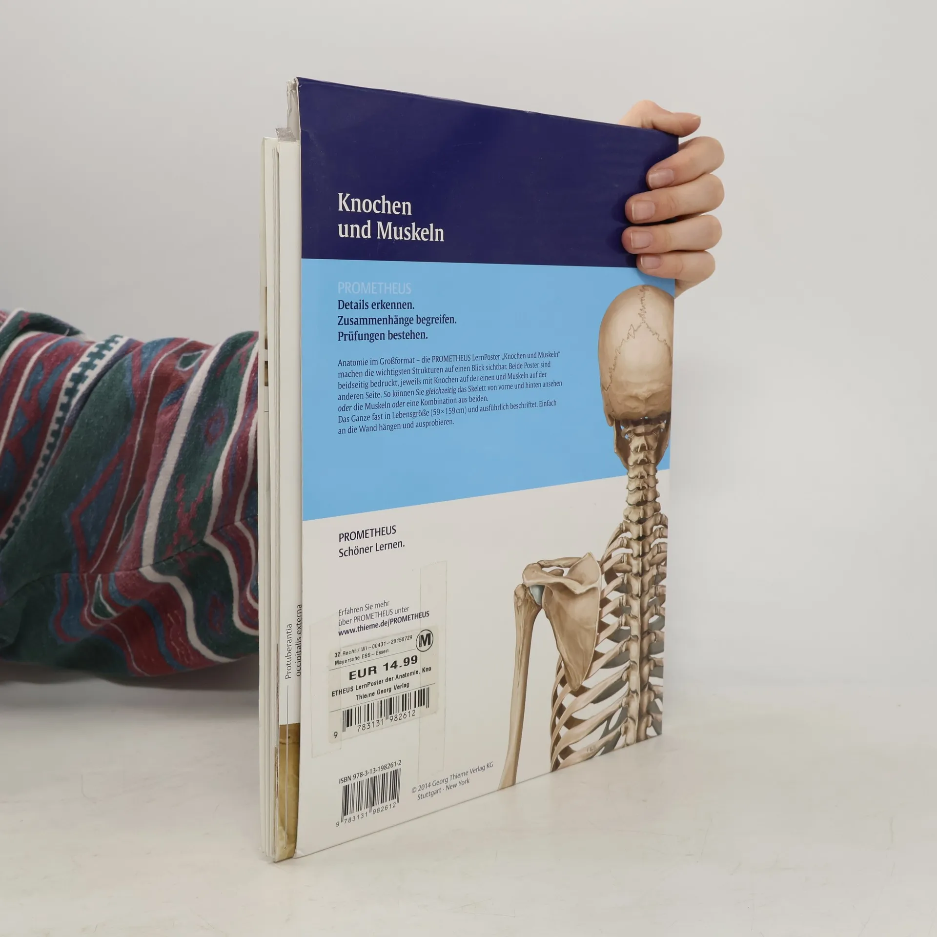 2 Plakate - 4 PROMETHEUS-Bilder in Lebensgröße 1. Skelett von vorn - Muskelmann von hinten; 2. Skelett von hinten - Muskelmann von vorne. Es gibt eine Fülle von Knochen und Muskeln, die zu lernen sind: Wie heißen sie, wo liegen sie? Sich diese Strukturen alle dauerhaft einzuprägen, schafft man nur durch permanente Wiederholung. Die Lösung: Lebensgroße Poster, die an der Wand hängen und fast alle Knochen und Muskeln sichtbar machen. An den Postern kommt man jeden Tag vorbei, kann immer mal wieder nach der einen oder anderen Struktur sehen, davor stehen bleiben, auch mit der Tasse Kaffee in der Hand. Hier hat man den Menschen komplett und trotzdem in beeindruckender Größe.