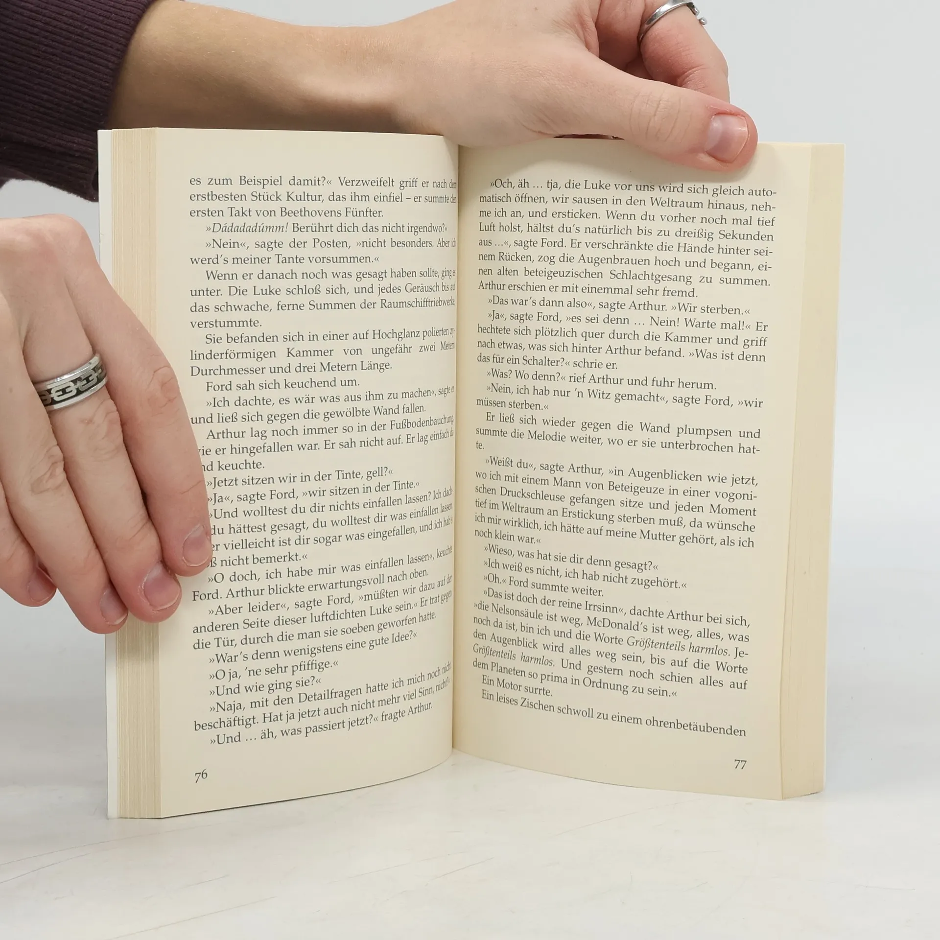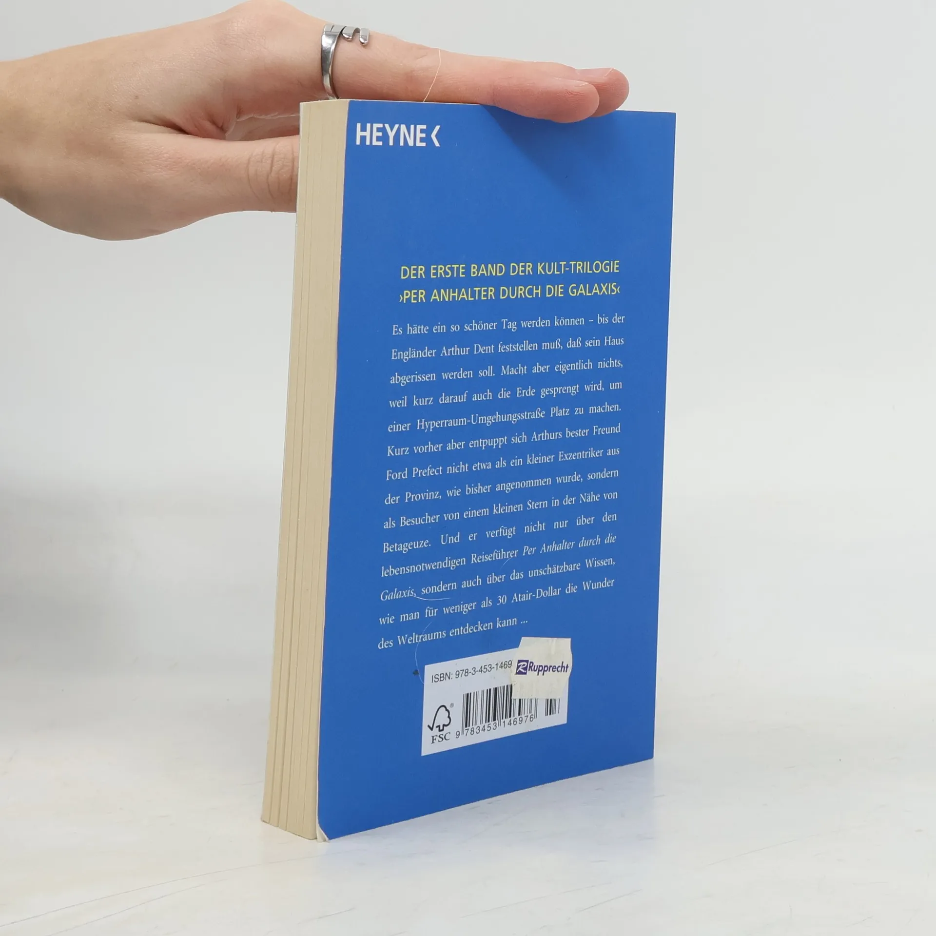 Der erste Band der fünfteiligen TrilogieVor 30 Jahren wurde von einem der größten Verlage Ursa Minors (und der Erde) das bemerkenswerteste Buch, das je veröffentlicht wurde, der Menschheit zugänglich gemacht: Per Anhalter durch die Galaxis. Für Arthur Dent ist es ein ganz normaler Donnerstag, bis sein Haus von Planierraupen niedergewalzt wird. Kurz darauf wird allerdings auch die gesamte Erde von einem vogonischen Bautrupp plattgemacht, weil sie einer Hyperraum-Umgehungsstraße weichen muss. Aber da hat sich Arthurs bester Freund schon längst als Alien entpuppt, und sie sausen durchs Weltall mit nichts als ihren Badetüchern und einem harmlos wirkenden Buch, auf dem in großen, freundlichen Buchstaben »KEINE PANIK« steht. Und dabei hat das Wochenende gerade erst angefangen…