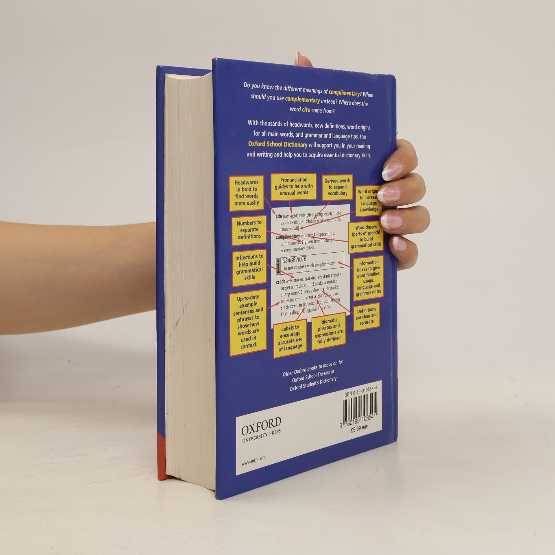 The Oxford School Dictionary is specially written for students at school and at home. It has been trialled and tested in schools and contains 45,000 words and phrases.Special Features:* Coverage of new words* Information boxes to give word families, usage, language and grammar notes.* Pronunciation guides to help with unusual words.* Idiomatic phrases and expressions are fully defined.* Derived words to expand vocabulary.* Style labels (formal, informal) to encourage accurate use of language.Features:* Headwords in bold to find words more easily* Definitions are clear and accurate.* Up-to-date example sentences and phrases to show how words are used in context.* Parts of speech and inflections written out in full to build grammatical skills.* Introduction to show how to use the dictionary.* Appendices include weights and measures and countries and peoples list