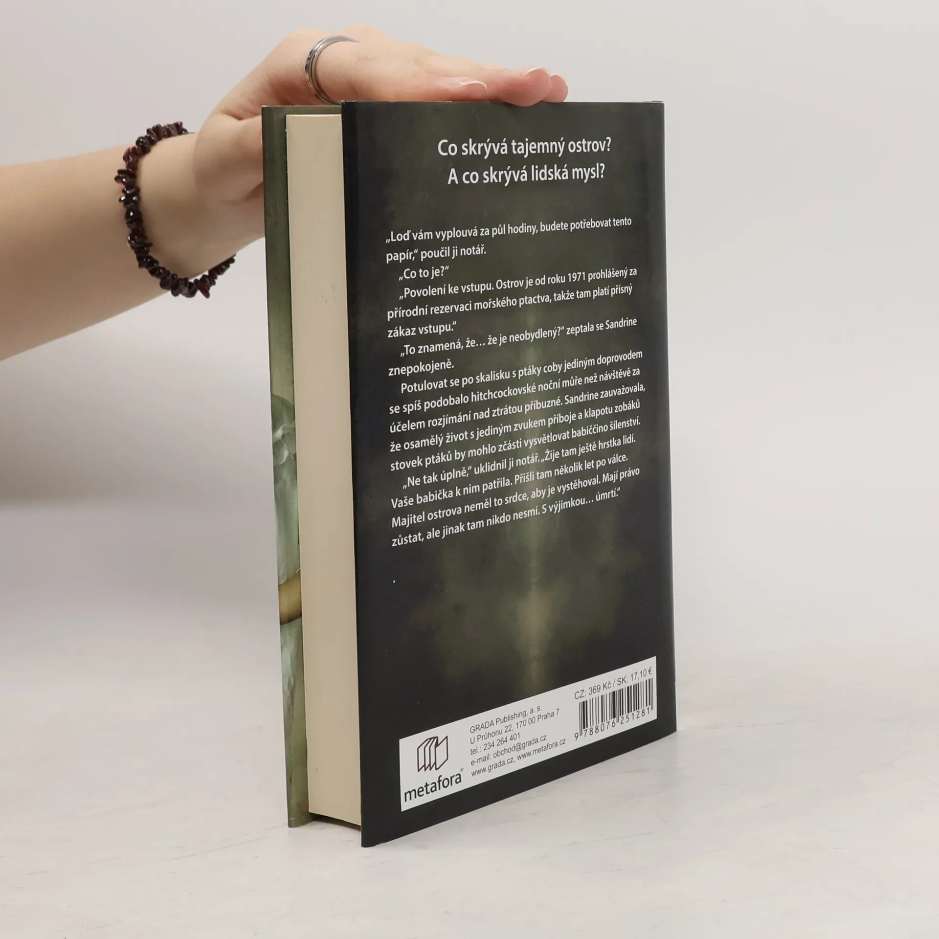 Jediná možnost, jak přežít, je uniknout... Co skrývá tajemný ostrov? A co skrývá lidská mysl? Sandrine, která se před nedávnem přistěhovala do Normandie, dostává výzvu od notáře, aby si zajela převzít osobní věci z domu po své zemřelé babičce – svérázné ženě, jež žila osaměle na maličkém ostrově nedaleko pobřeží a odmítala se stýkat s dcerou i s vnučkou. Sandrine vystupuje z lodi na šedivém, chladném ostrově a setkává se s hrstkou obyvatel, starých lidí žijících v téměř naprostém odloučení od civilizace. Všichni jí popisují babičku jako milou a laskavou ženu, tedy obraz daleký tomu, co o ní Sandrine vyprávěla matka. Na ostrově vládne podivná atmosféra. Stačí pár hodin, aby si Sandrine uvědomila, že zdejší obyvatelé skrývají nějaké tajemství. Cosi, z čeho mají hrůzu. Proč tedy odtud nikdo z nich neodjede? Co se stalo s dětmi z prázdninového tábora, narychlo uzavřeného v roce 1949? Namísto odpovědí je mladá žena po několika dnech nalezena, jak bloudí po pláži na pevnině s oblečením zmáčeným krví, která není její… Román získal cenu za nejlepší francouzský román roku 2019, která se uděluje na každoročně konaném literárním festivalu detektivek v Cognacu.