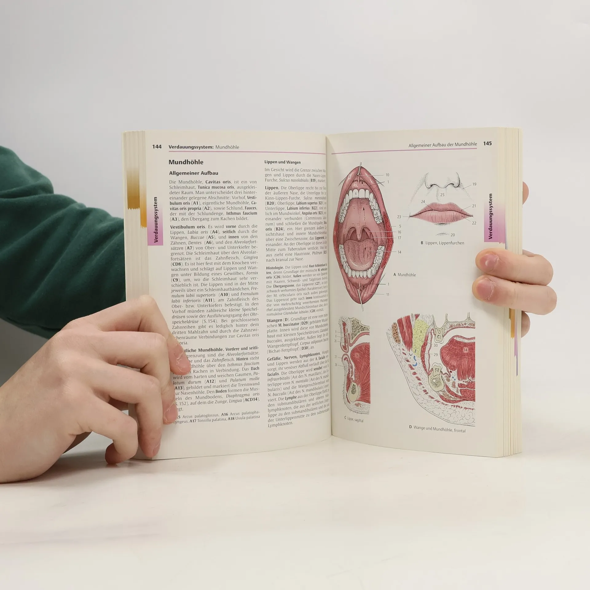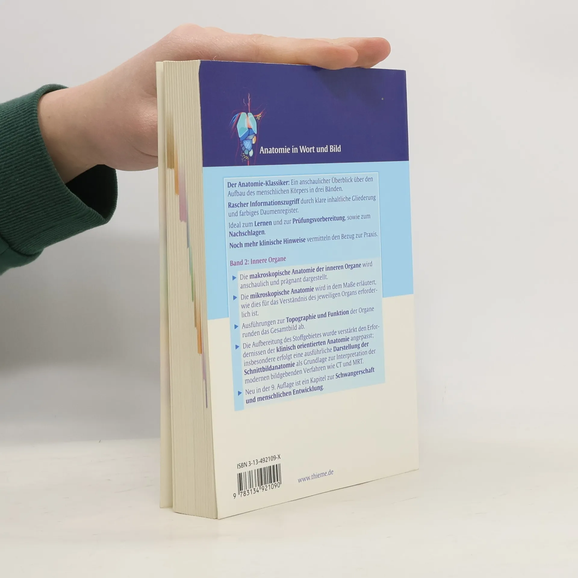 Gestalt, Lage, geweblicher Aufbau und Funtkion der Kreislauf-, Atmungs- und Verdauungsorgane, der Blut- und Abwehrsysteme, Drüsen und der Haut sind Gegenstand des zweiten Bandes. Der Beckenboden, der in enger funktioneller Beziehung zur den Organen des kleinen Beckens steht, wird einschließlich der damit zusammenhängenden Topographie dargestellt. Hinzu kommt die Darstellung der Zahnentwicklung und des Zahnhalteapparates, die Reifeteilung der Geschlechtszellen, die zellulären Vorgänge bei der Befruchtung und die Grundzüge der Plazentabildung.