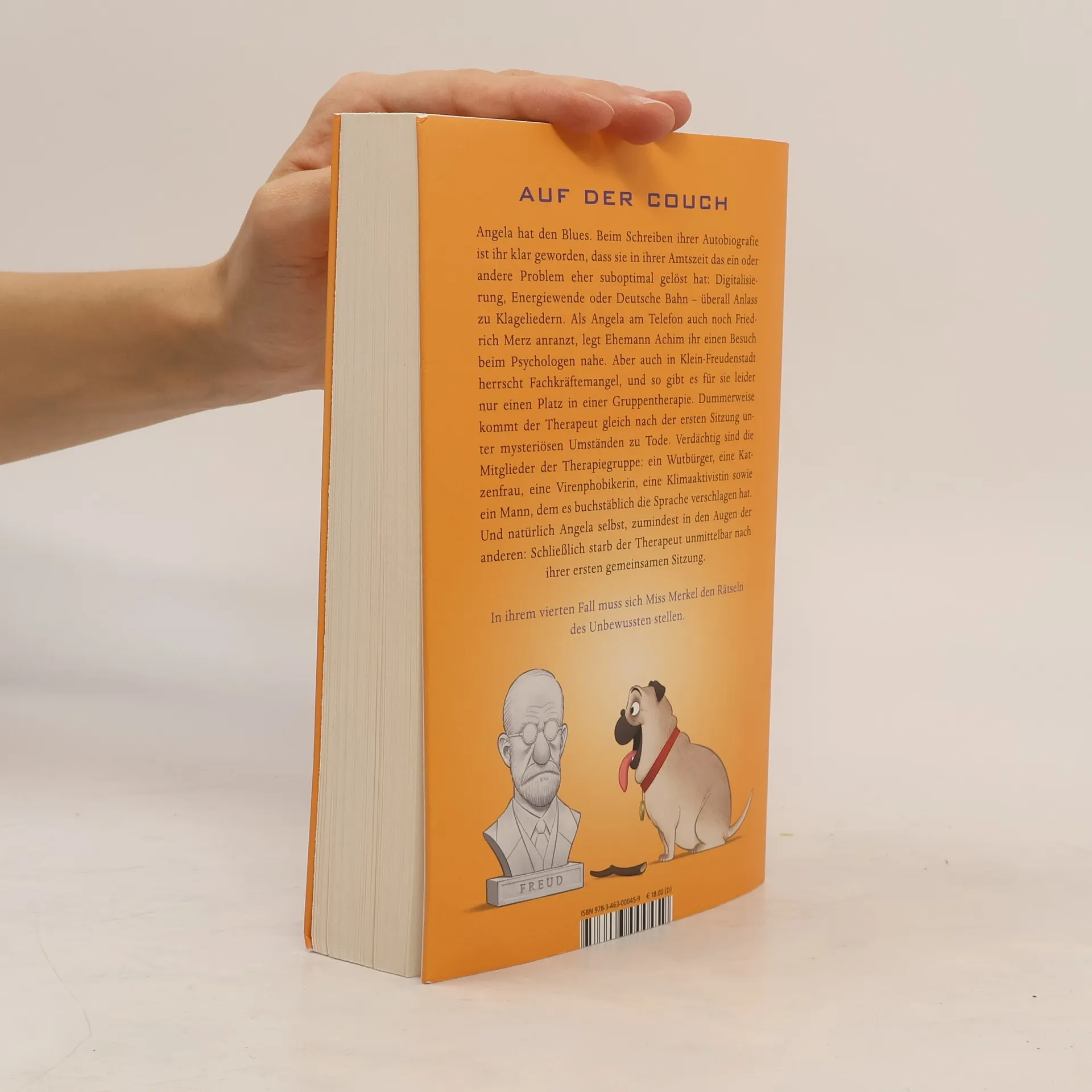 Der vierte Band der Bestseller-Krimireihe um die ermittelnde Altkanzlerin Angela ist niedergeschlagen. Beim Schreiben ihrer Autobiografie ist ihr klar geworden, dass sie in ihrer Amtszeit das ein oder andere Problem des Landes eher suboptimal gelöst hat. Sei es zum Beispiel die Digitalisierung, die Energiewende oder die Bundesbahn, die allesamt Anlass zu Klagegebeten geben. Nachdem Angela auch noch Friedrich Merz anranzt, schlägt Ehemann Achim ihr einen Besuch beim Psychologen vor. Da aber auch in Angelas beschaulichem Heimatort Klein-Freudenstadt Fachkräftemangel herrscht, gibt es für sie nur einen Platz in einer Gruppentherapie bei Doktor Felix Fenstermacher. Dummerweise wird der Therapeut gleich nach der ersten Sitzung auf seinem Hausboot in die Luft gesprengt. Angela bekommt dadurch gleich viel bessere Laune, endlich kann sie wieder ermitteln. Verdächtig sind die Mitglieder der Gruppe: ein Wutbürger, eine Katzenfrau, eine Viren-Phobikerin, eine Klimaaktivistin und ein Mann, dem es buchstäblich die Sprache verschlagen hat. Allerdings fällt der Verdacht der anderen erst einmal auf Angela selbst, schließlich starb der Therapeut gleich nach ihrer ersten gemeinsamen Sitzung.