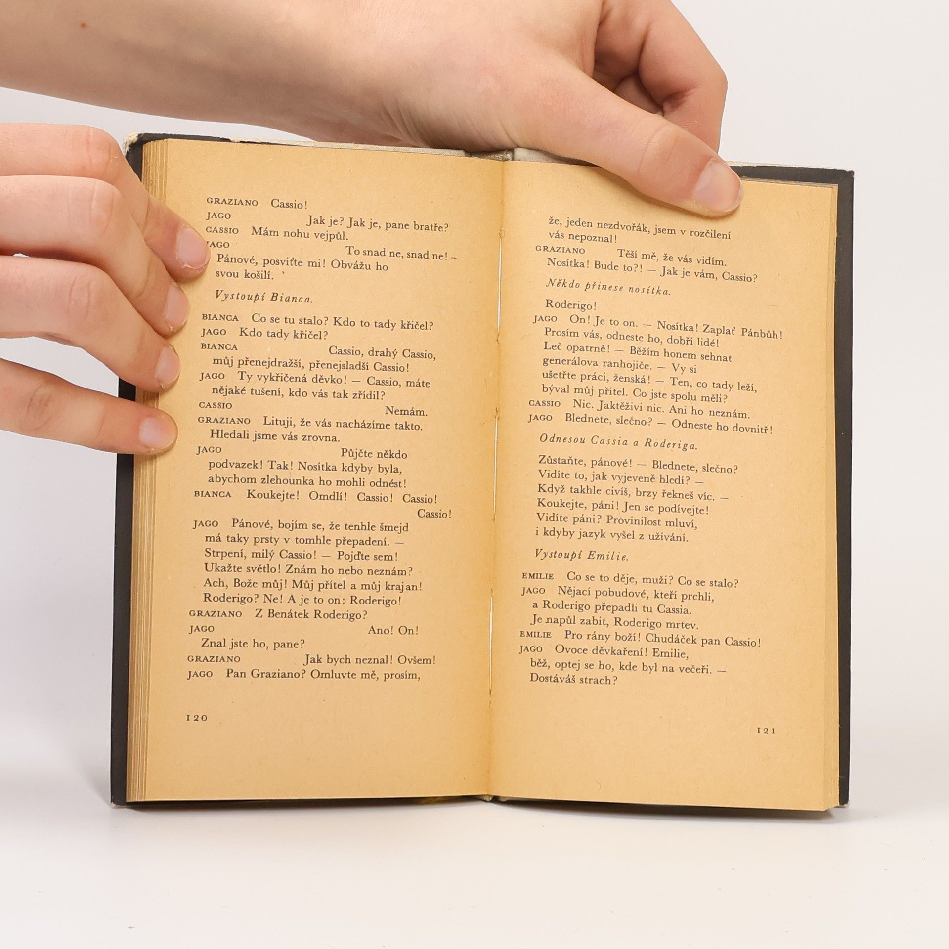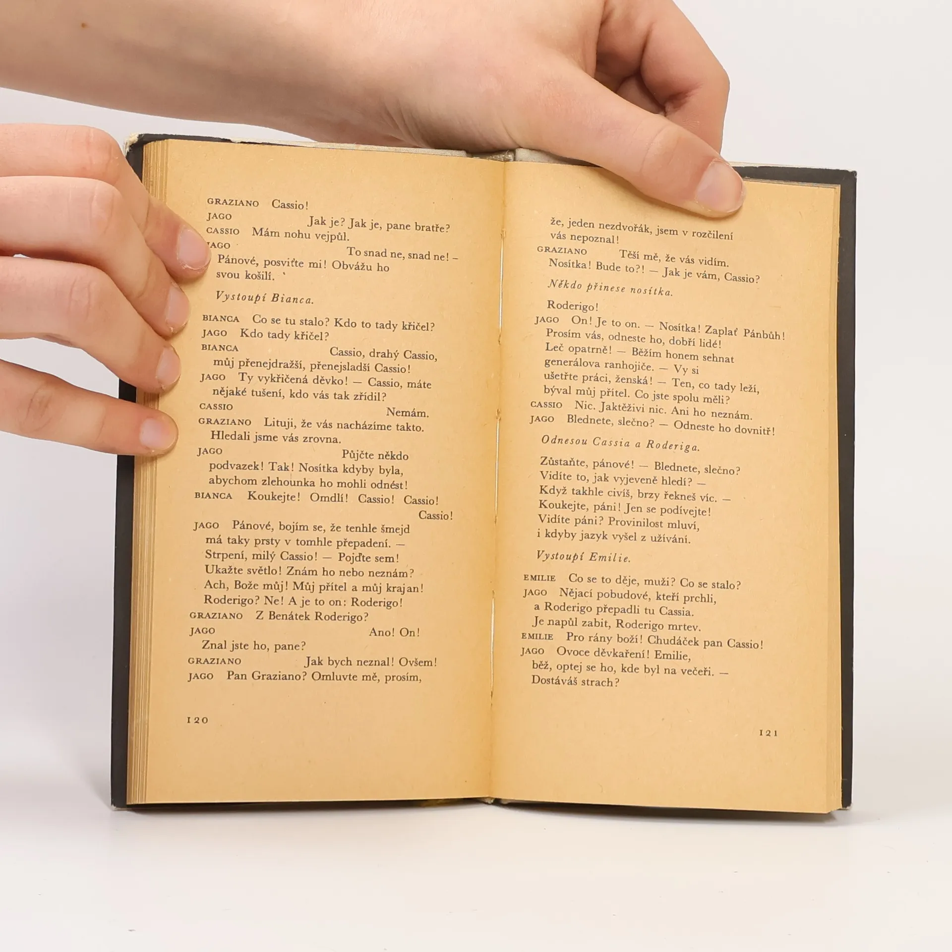 Martin Hilský píše: „Děj Othella lze převyprávět s větší či menší stručností jako příběh Maura, který ze žárlivosti uškrtí svou bílou ženu Desdemonu. Děj každé Shakespearovy hry samozřejmě lze převyprávět, ale každá taková dějová parafráze zastírá prostou, ale významnouokolnost, že každá Shakespearova hra obsahuje přinejmenším děje dva: děj v tradičním slova smyslu a děj řeči. (...) Zvláštností Othella je, že moc slova má v této hře zcela výjimečnou důležitost. Othello si získá lásku Desdemony silou svého slova. Jago Othellovu lásku promění v žárlivost opět silou slova. (...) Vítězství Jaga nad Othellem spočívá mimo jiné v tom, že Jago dokáže Othellovi vnutit svou rétoriku, svůj jazyk. Othello se v druhé polovině hry nenakazí jenom žárlivostí, ale také Jagovým jazykem. Othello vypovídá o rozpadu osobnosti, který se projevuje rozpadem jazyka.“