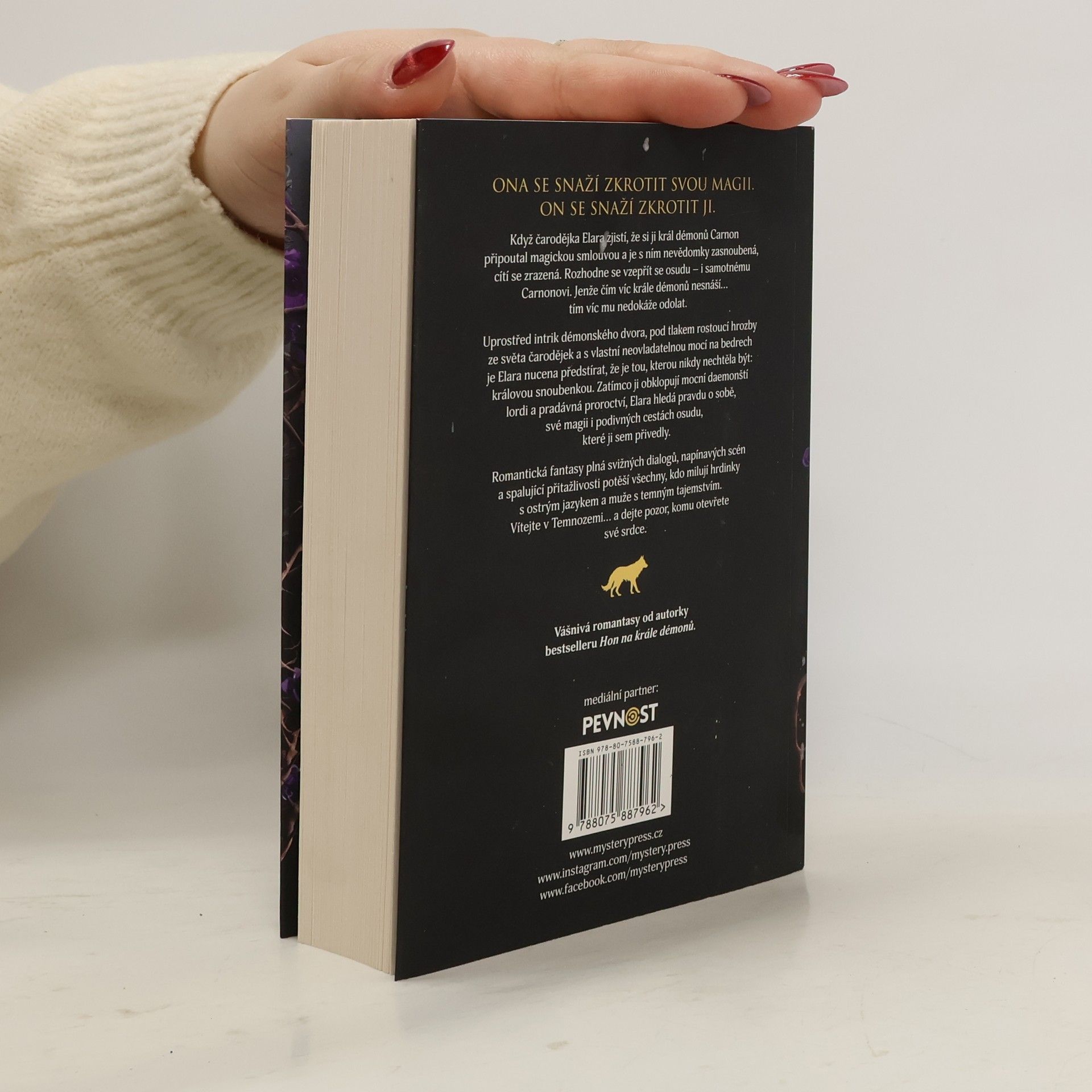 ELARA SE ZAPLETLA DO LŽÍ UPŘEDENÝCH KRÁLEM DÉMONŮ, JE VŠAK ODHODLANÁ NEPUSTIT HO DO SVÉHO SRDCE… Zklamaná lstí krále démonů se Elara zařekne, že už ho do svého srdce nikdy nepustí. Když jí však král slíbí pomoc při záchraně její matky, přistoupí Elara na krvavou dohodu, že s ním zůstane, naučí se používat démonickou magii a bude předstírat, že je jeho snoubenkou. Našlapovat mezi láskou, povinností, touhou a pomstou,a navíc dostát svému slibu, je nakonec mnohem těžší, než se zprvu zdálo... Podaří se Elaře prolomit démonickou kletbu a neztratit sebe samu?