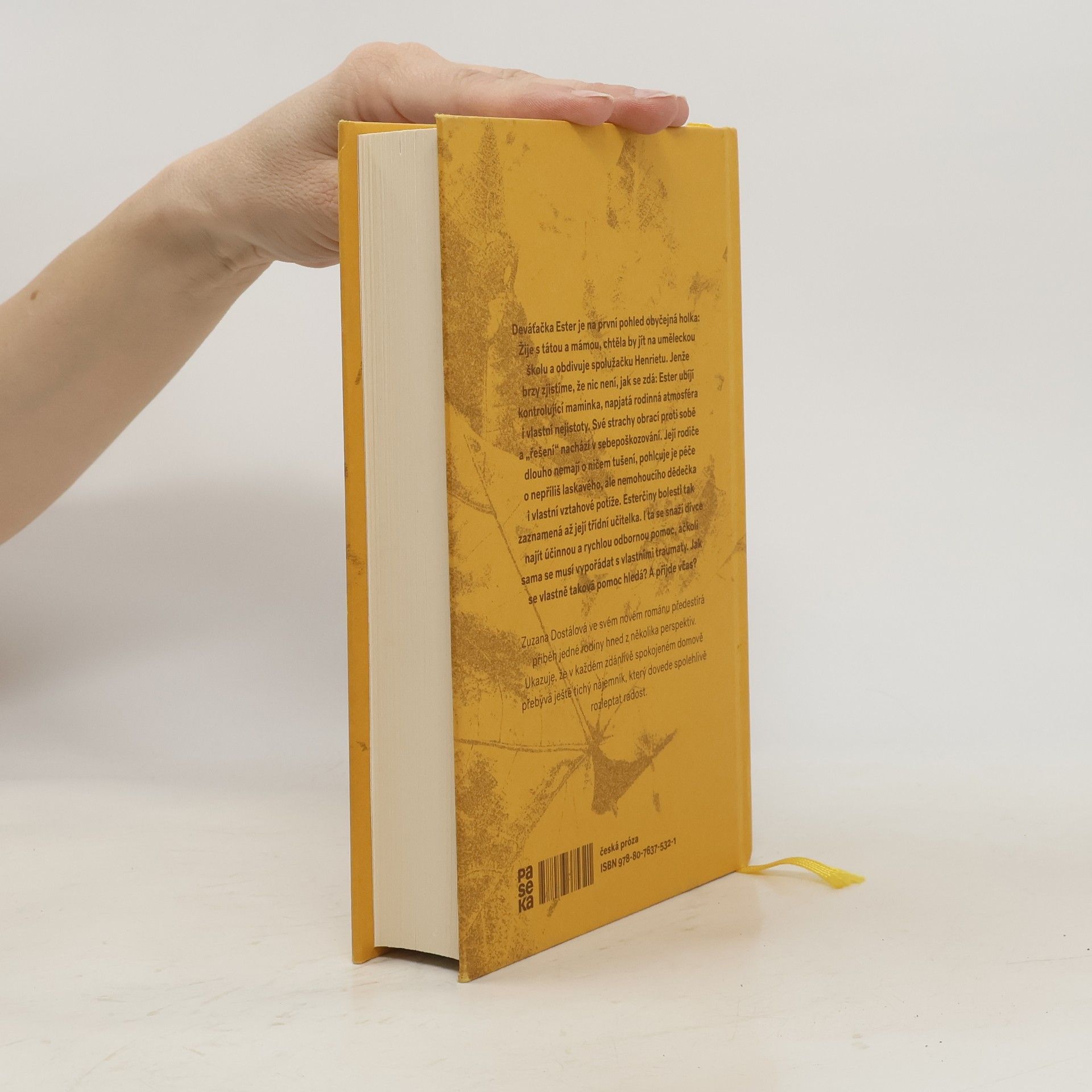 Deváťačka Ester je na první pohled obyčejná holka: Žije s tátou a mámou, chtěla by jít na uměleckou školu a obdivuje spolužačku Henrietu. Jenže brzy zjistíme, že nic není, jak se zdá: Ester ubíjí kontrolující maminka, napjatá rodinná atmosféra i vlastní nejistoty. Své strachy obrací proti sobě a „řešení“ nachází v sebepoškozování. Její rodiče dlouho nemají o ničem tušení, pohlcuje je péče o nepříliš laskavého, ale nemohoucího dědečka i vlastní vztahové potíže. Esterčiny bolesti tak zaznamená až její třídní učitelka. I ta se snaží dívce najít účinnou a rychlou odbornou pomoc, ačkoli sama se musí vypořádat s vlastními traumaty. Jak se vlastně taková pomoc hledá? A přijde včas? Zuzana Dostálová ve svém novém románu předestírá příběh jedné rodiny hned z několika perspektiv. Ukazuje, že v každém zdánlivě spokojeném domově přebývá ještě tichý nájemník, který dovede spolehlivě rozleptat radost.