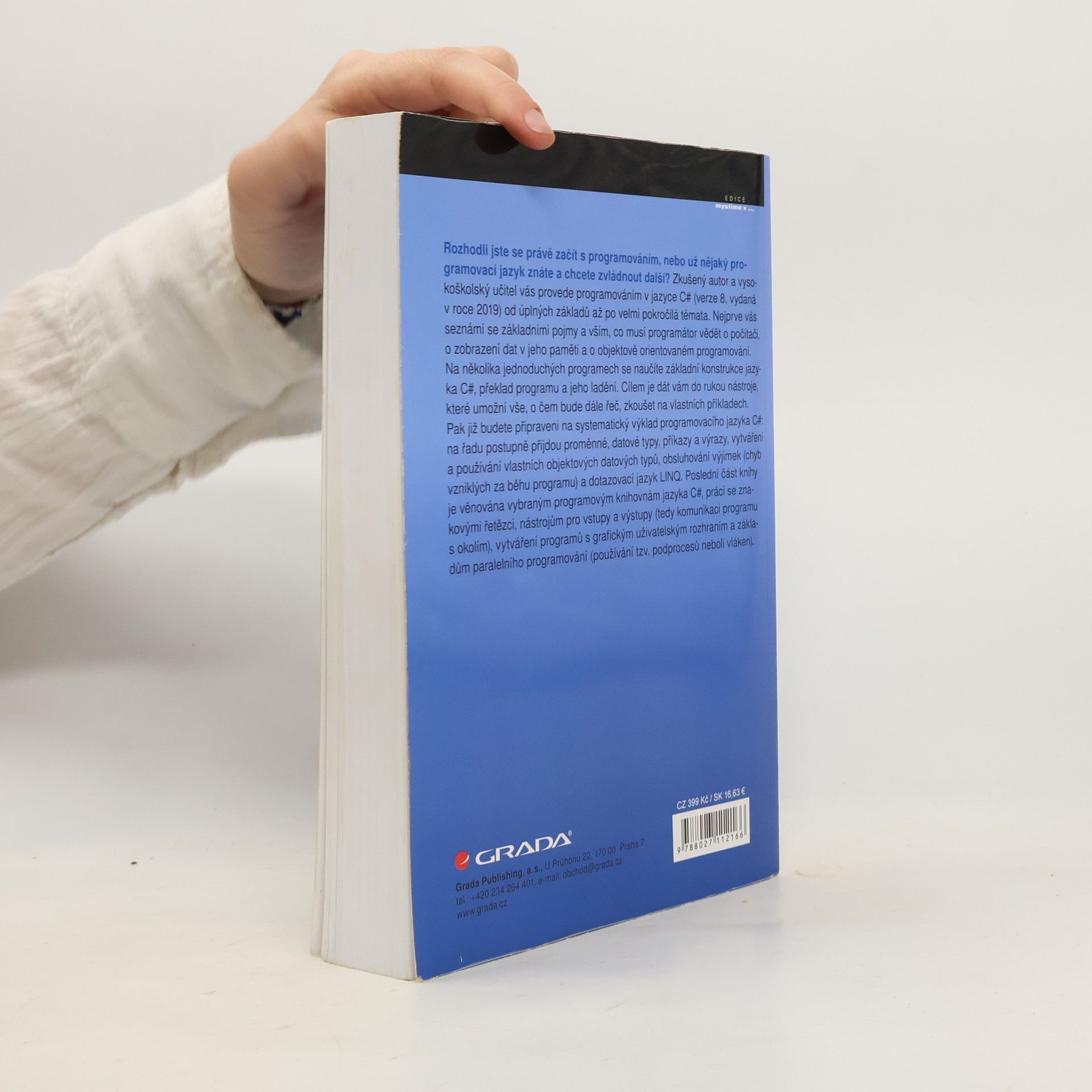 Zkušený autor a vysokoškolský učitel vás provede programováním v jazyce C# (verze 8, vydaná v roce 2019) od úplných základů až po velmi pokročilá témata. Nejprve přijdou na řadu potřebné základní pojmy a vše, co musí programátor vědět o počítači, o zobrazení dat v jeho paměti a o objektově orientovaném programování. Na několika jednoduchých programech se naučíte základní konstrukce jazyka C#, překlad programu a jeho ladění. Cílem je dát vám do rukou nástroje, které umožní vše, o čem bude dále řeč, zkoušet na vlastních příkladech. Pak již budete připraveni na systematický výklad programovacího jazyka C#: proměnné, datové typy, příkazy a výrazy, vytváření a používání vlastních objektových datových typů, obsluhování výjimek (chyb vzniklých za běhu programu) a dotazovací jazyk LINQ. Poslední část knihy je věnována vybraným programovým knihovnám jazyka C#, práci se znakovými řetězci, nástrojům pro vstupy a výstupy (tedy komunikaci programu s okolím), vytváření programů s grafickým uživatelským rozhraním a základům paralelního programování (používání tzv. podprocesů neboli vláken).