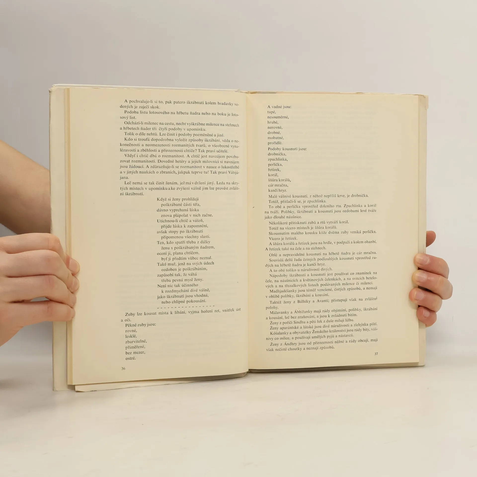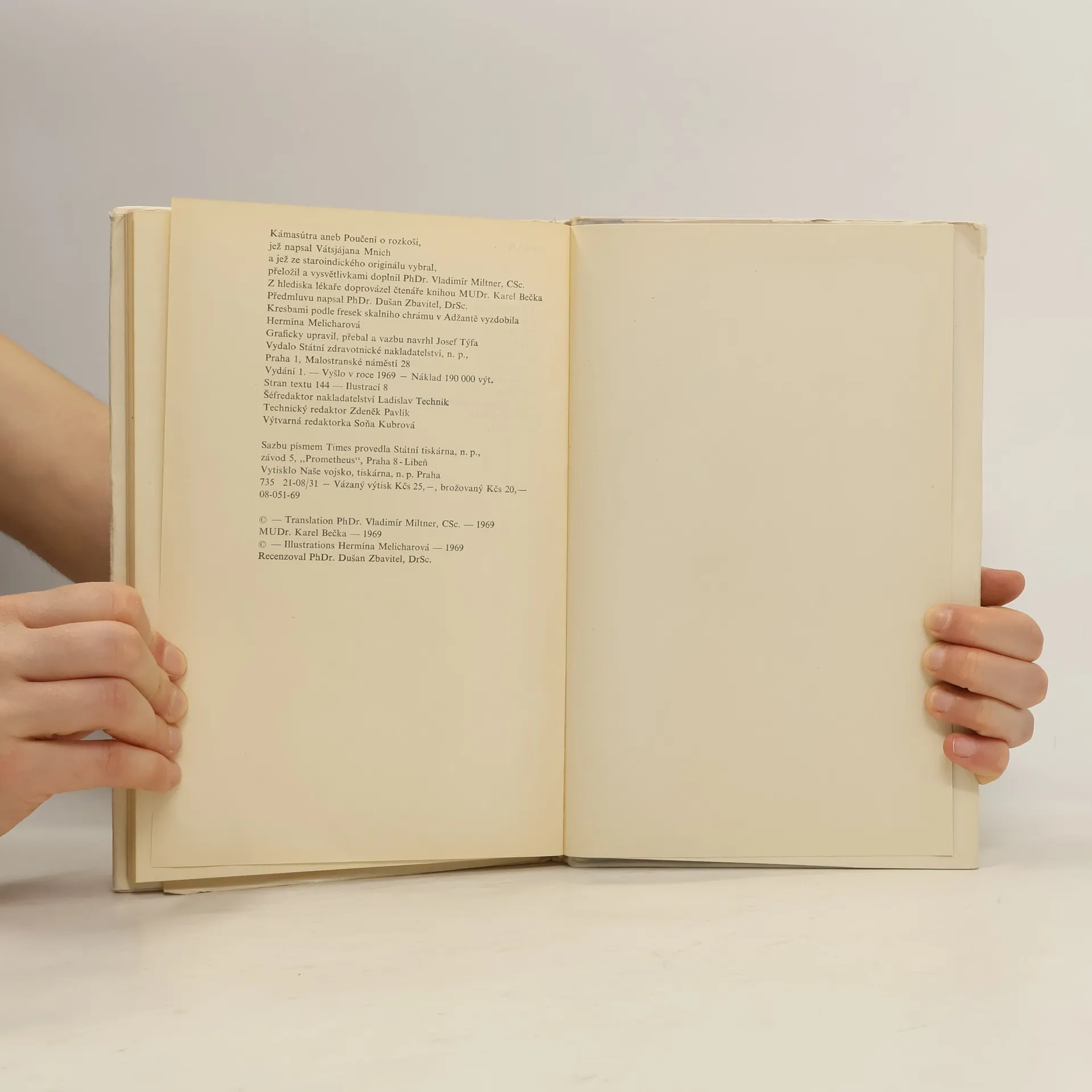 Toto je první kniha Kámasútry přeložená přímo ze staroindického originálu, která vyšla poprvé v Československu v roce 1969, bohužel některé části byly vypuštěny díky komunistickým cenzorům. Knihu přeložil a vysvětlivkami doplnil PhDr. Vladimír Miltner, CSc. Z hlediska lékaře doprovázel čtenáře knihou MUDr. Karel Bečka. Kresbami podle fresek vyzdobila Hermína Melicharová. Vátsjájanova Kámasútra, která vznikla někdy ve. 4.-5: století našeho letopočtu, je nejstarším dochovaným spisem, jenž se vědecky zabývá rozkoší, jedním z trojího smyslu života. Trochu zjednodušeně řečeno - je to podrobná učebnice lásky, v níž autor, odvolávaje se často na starší své předchůdce v tomto vědním oboru, podává ucelené poučení o milostném hemžení ve staré Indii.