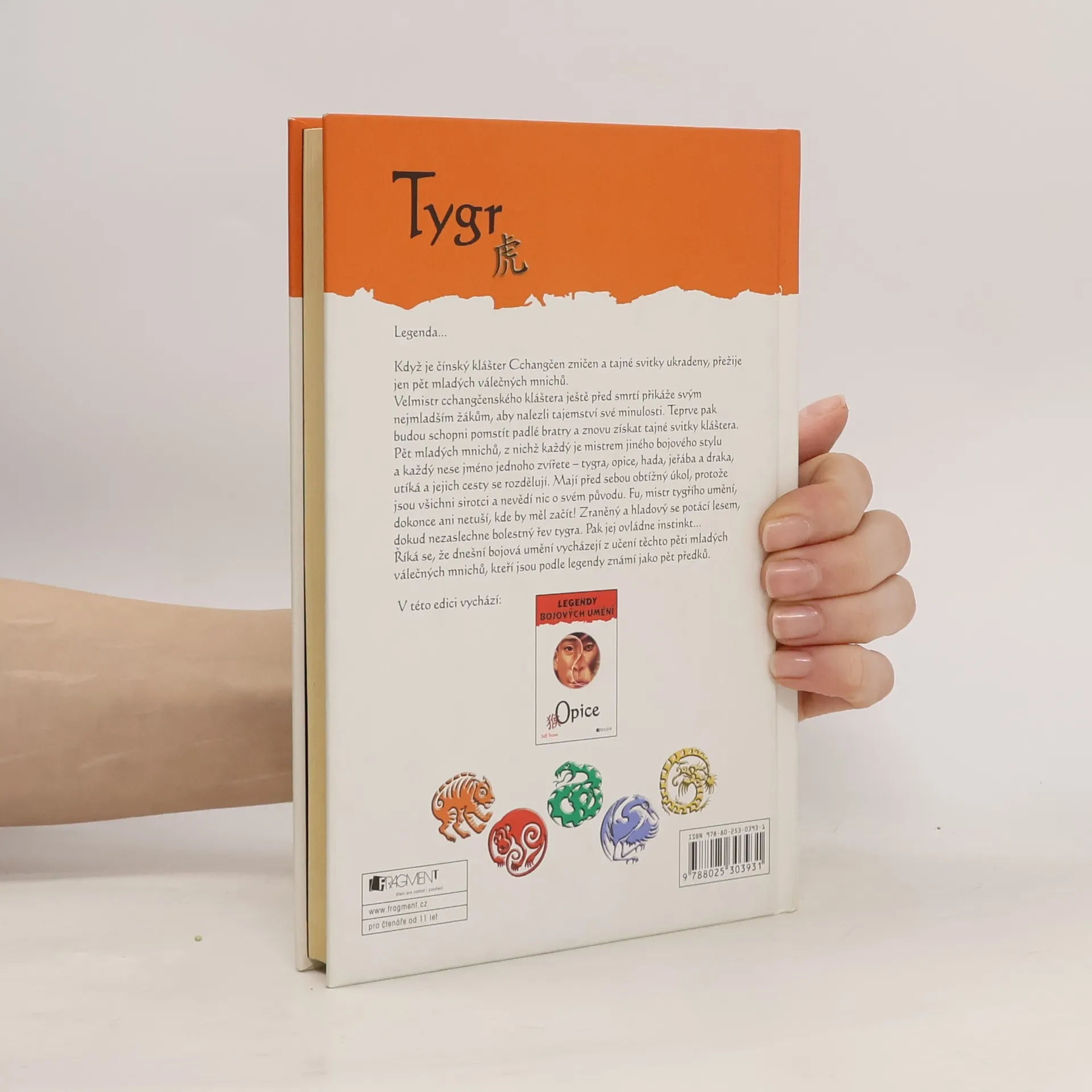 Legenda o pěti předcích začíná! Když je čínský klášter Cchangčen zničen a tajné svitky ukradeny, přežije jen pět mladých válečných mnichů, z nichž každý je mistrem jiného bojového stylu a každý nese jméno jednoho zvířete - tygra, opice, hada, jeřába a draka. Podle legendy dnešní bojová umění vycházejí z učení těchto pěti mladých válečných mnichů - pěti předků. Tato kniha pojednává o tom co dělal mnich Fu (tygr). Na knihu navazuje příběh Opice, Had a Jeřáb.