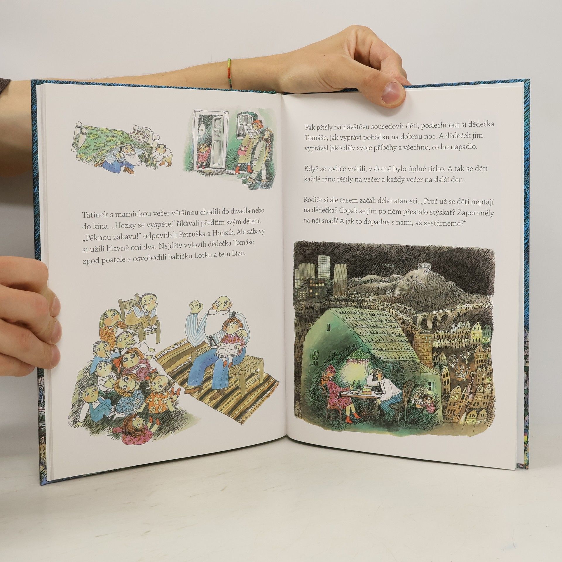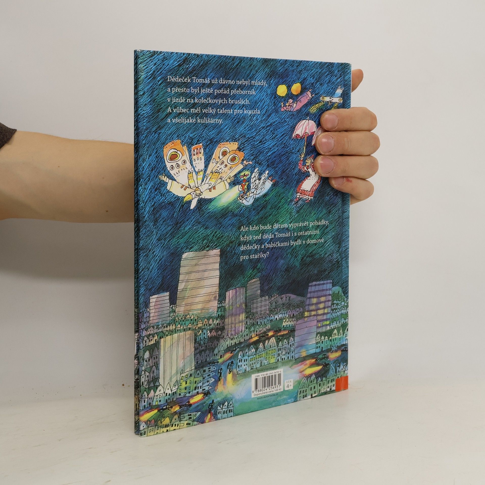 Dědeček Tomáš už dávno nebyl mladý, a přesto byl ještě pořád přeborník v jízdě na kolečkových bruslích a vůbec měl velký talent pro kouzla a všelijaké kulišárny. Jenom s ním se rybička v akváriu změnila v draka a vrabci na zahradě v barevné tropické ptáky. A každý večer dětem vyprávěl pohádky. Děti ho měly rády a všem bylo společně moc dobře. Až jednoho dne starosta oznámil, že ve městě otevřel domov pro staré lidi, kam všechny staroušky a stařenky odstěhují. A začal hon na staříky! Nejdřív se zdálo, že by mohli být dědečkové a babičky ve Šťastném domově spokojení, ale děti viděly, že se jim ztratil úsměv z tváří a už nic není, jako bylo dřív. A tak vymyslely plán na únos – sestrojily všemožné létající stroje a vydaly se v noci, když foukal příznivý vítr, pro své milované staříky. Kniha je určena dětem od 4 let.