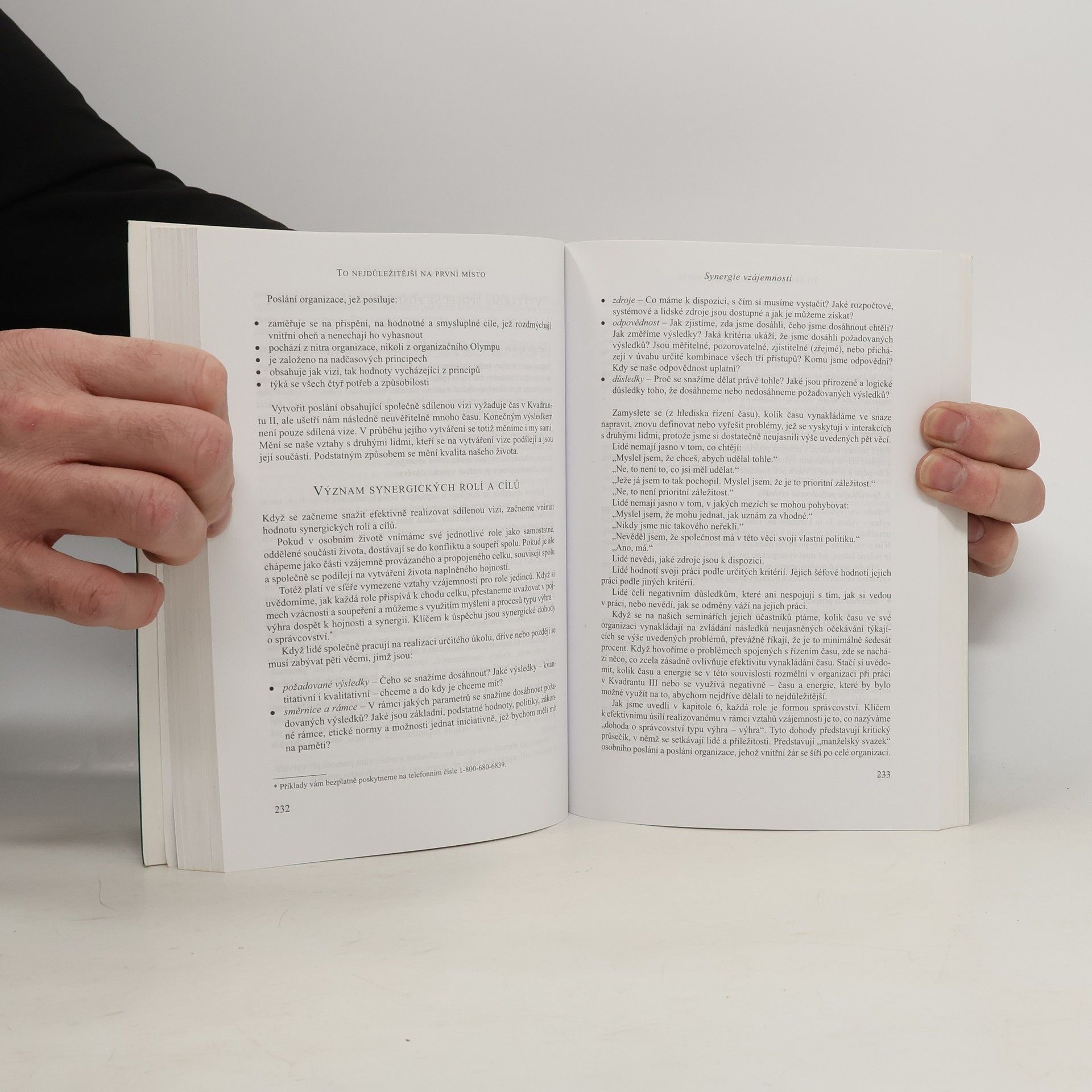 Světově proslulý autor manažerské a motivační literatury a jeho spolupracovníci zaměřují pozornost čtenářů na to, aby si kladli otázku, jaké věci jsou pro ně v jejich životě nejdůležitější. Věnují jim tolik pozornosti, péče a času, kolik by chtěli? Na rozdíl od všech tradičních knih o time managementu, jež kladou důraz především na "zvyšování efektivnosti" s využitím různých "racionalizačních" technik, Dr. Covey ukazuje, že na využívání vlastního času je možné se dívat zcela jinak. Kniha vás naučí rozlišovat mezi vašimi úkoly a určovat priority, zaměřovat se na to, co je důležité, a nikoli jen naléhavé, dávat na první místo to nejdůležitější a navozovat rovnováhu mezi vašimi osobními a pracovními povinnostmi a zájmy, abyste tak od života dostávali, to, co si přejete.