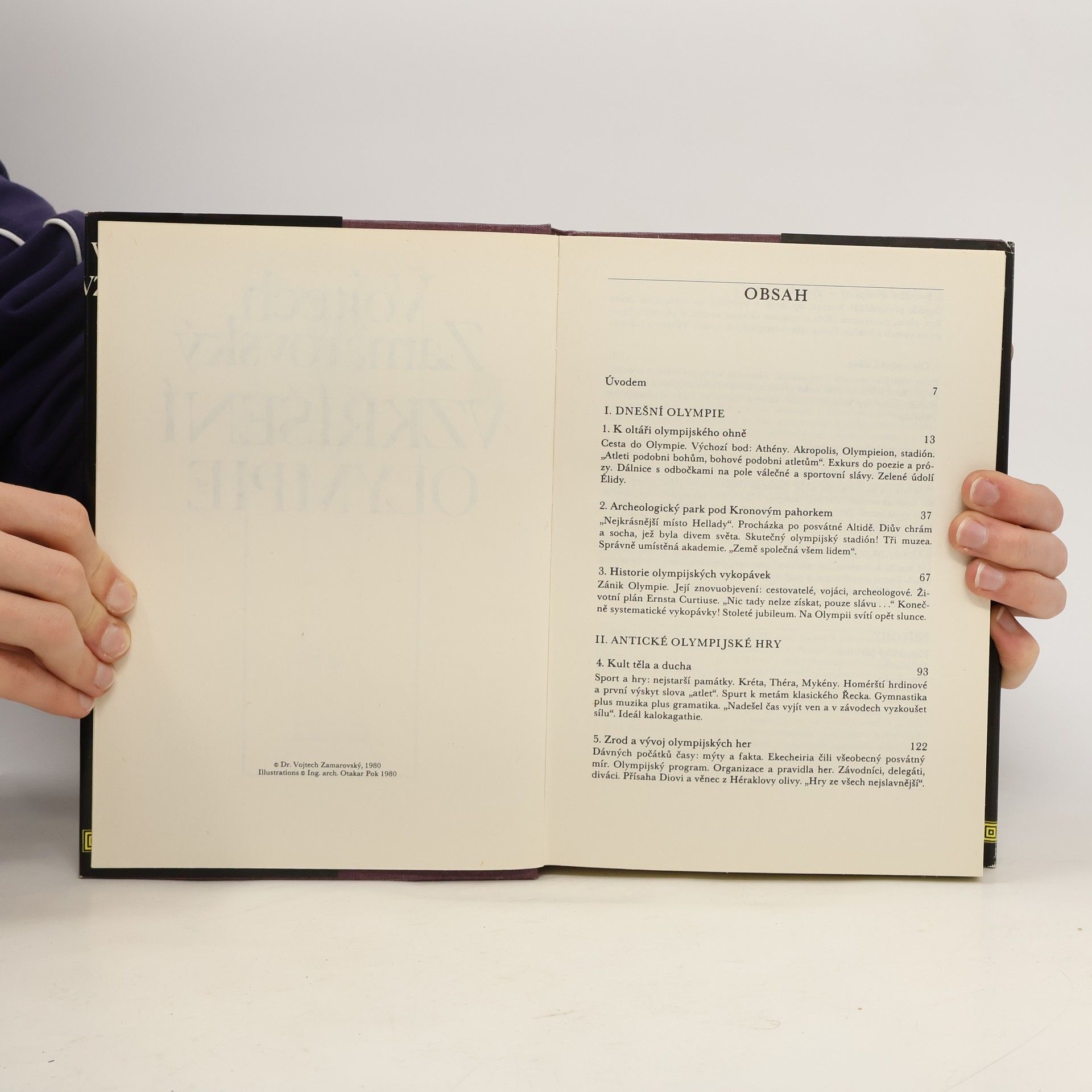Autor provádí čtenáře dnešní Olympií, kolébkou a jevištěm her, které byly největší sportovní událostí starověku, a sleduje jejich historii. Evokuje atmosféru olympijských bojů, seznamuje se soutěžními disciplínami aodměnamivítězů. Zamýšlí se nad původem a účelem olympijských her, nad příčinami jejich rozkvětu i zániku a zabývá se vzkříšením olympijské myšlenky v novověku.