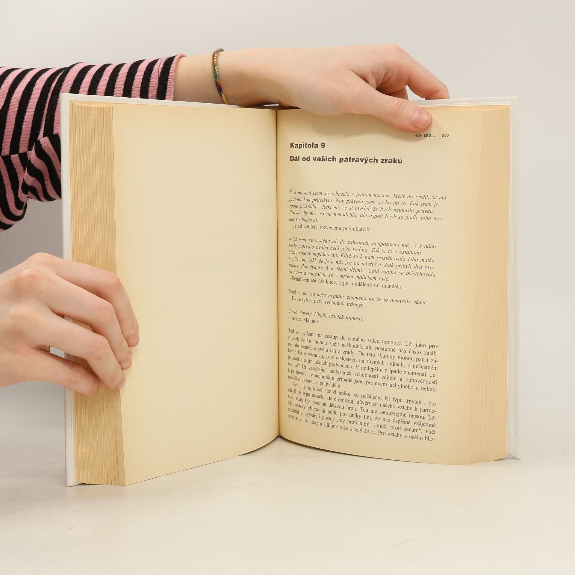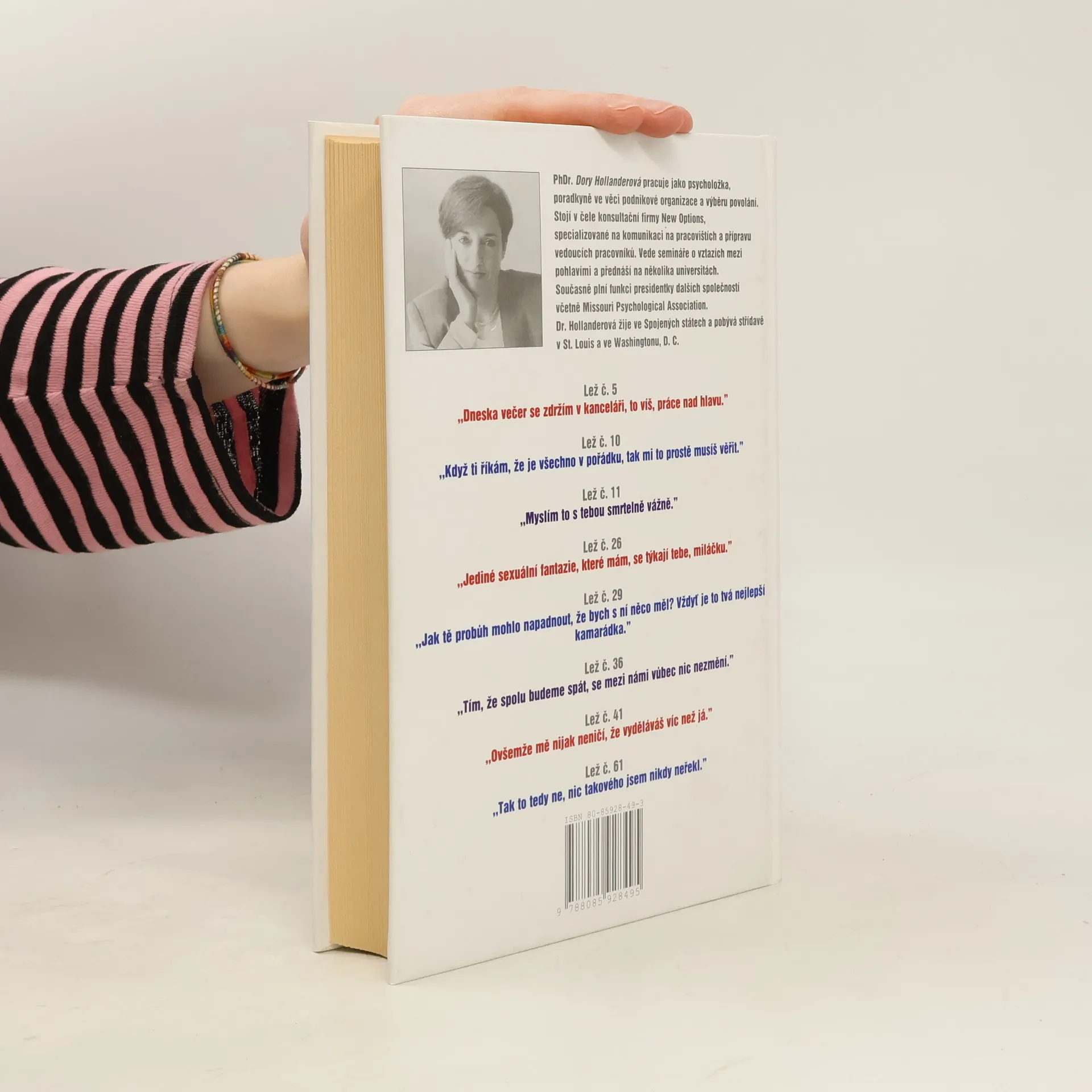 101 lež kterou muži říkají ženám - a proč jim ženy věří. PhDr. D.Hollanderová pracuje jako psycholožka, poradkyně ve věci podnikové organizace a výběru povolání. Vede semináře o vztazích mezi pohlavími a přednáší na několika univerzitách. Několik příkladů z knihy: Lež č.5. Dneska se zdržím v kanceláři, to víš, práce nad hlavu. Lež č.10. Když ti říkám, že je vše v pořádku, tak mi to prostě musíš věřit. Lež č.11. Myslím to s tebou smrtelně vážně. Lež č.26. Jediné sexuální fantazie, které mám, se týkají tebe, miláčku. Lež č.29. Jak tě mohlo napadnout, že s ní něco mám! Proboha, vždyť je to tvá nejlepší kamarádka! Lež č.36. Tím, že budeme spolu spát, se mezi námi nic nezmění. Lež č.41. Samozřejmě mi nevadí, že vyděláváš víc než já. Lež č.61. Nic takového jsem nikdy neřekl...