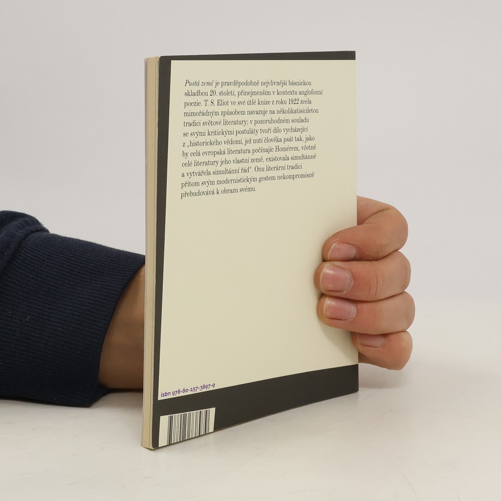Nový překlad nejvlivnější angloamerické básně dvacátého století, který vychází ke stému výročí jejího prvního vydání. Pustá země je pravděpodobně nejvlivnější básnickou skladbou 20. století, přinejmenším v kontextu anglofonní poezie. T.S. Eliot ve své útlé knize z roku 1922 zcela mimořádným způsobem navazuje na několikatisíciletou tradici světové literatury; v pozoruhodném souladu se svými kritickými postuláty tvoří dílo vycházející z "historického vědomí, jež nutí člověka psát tak, jako by celá evropská literatura počínajíc Homérem, včetně celé literatury jeho vlastní země, existovala simultánně a vytvářela simultánní řád". Onu literární tradici přitom svým modernistickým gestem nekompromisně přebudovává k obrazu svému. Nakladatelská anotace.
