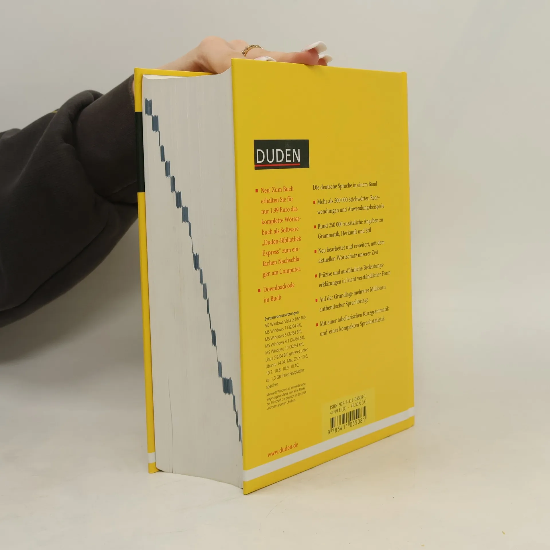 Die Nr. 1 der Bedeutungswörterbücher präsentiert die deutsche Gegenwartssprache in einem umfassenden Band. Die 8. überarbeitete und erweiterte Auflage umfasst rund 1.000 aktuelle Wörter und bietet mehr als 500.000 Stichwörter, Redewendungen und Anwendungsbeispiele. Fach- und Sondersprachen sowie Mundarten und Stilebenen werden ebenfalls berücksichtigt. Ergänzt wird das Werk durch etwa 250.000 zusätzliche Informationen zu Bedeutungen, Rechtschreibung, Aussprache, Herkunft, Grammatik und Stil. Ein Griffregister und ein zweifarbiges Layout ermöglichen eine schnelle Wortsuche. Eine tabellarische Kurzgrammatik und eine kompakte Sprachstatistik unterstützen das Lernen und Nachschlagen. Käufer erhalten den kompletten Inhalt auch als Programm “Duden-Bibliothek Express“ für einfaches Nachschlagen am Computer. Zahlreiche Suchfunktionen erleichtern die Recherche, und über 12.000 Vertonungen bieten die korrekte Aussprache schwieriger Wörter, gesprochen von Profisprechern der ARD. Mit einem Klick können Wörterbuchartikel in eigene Dokumente oder in selbst angelegte Wörterbücher kopiert werden. Die digitale Version ist mit anderen digitalen Wörterbüchern aus der Software-Reihe kombinierbar, was gleichzeitiges Arbeiten in allen installierten Titeln ermöglicht.