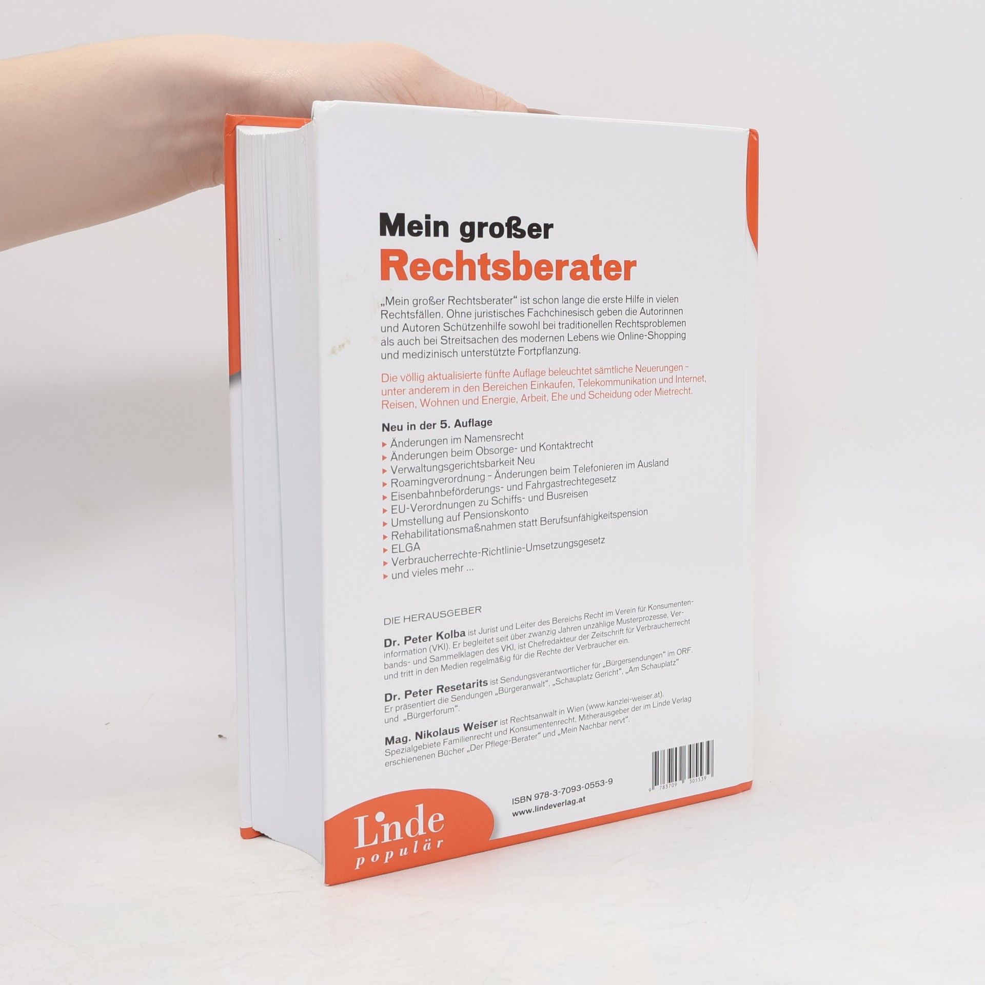 Wesentlich aktualisiert in der 5. Auflage ”Mein großer Rechtsberater“ ist schon lange die erste Hilfe in vielen Rechtsfällen. Ohne juristisches Fachchinesisch geben die Autoren Schützenhilfe sowohl bei traditionellen Rechtsproblemen als auch bei Streitsachen des modernen Lebens wie Online-Shopping und medizinisch unterstützte Fortpflanzung. Die völlig aktualisierte fünfte Auflage beleuchtet sämtliche Neuerungen – unter anderem in den Bereichen Einkaufen, Telekommunikation und Internet, Reisen, Wohnen und Energie, Arbeit, Ehe und Scheidung oder Mietrecht. U. a. neu in der 5. Auflage: Änderungen im Namensrecht Änderungen beim Obsorge- und Kontaktrecht Verwaltungsgerichtsbarkeit Neu Roamingverordnung – Änderungen beim Telefonieren im Ausland Eisenbahnbeförderungs- und Fahrgastrechtegesetz EU-Verordnungen zu Schiffs- und Busreisen Umstellung auf Pensionskonto Rehabilitationsmaßnahmen statt Berufsunfähigkeitspension ELGA ORF TV Spot: Video ansehen Zu YouTube wechseln