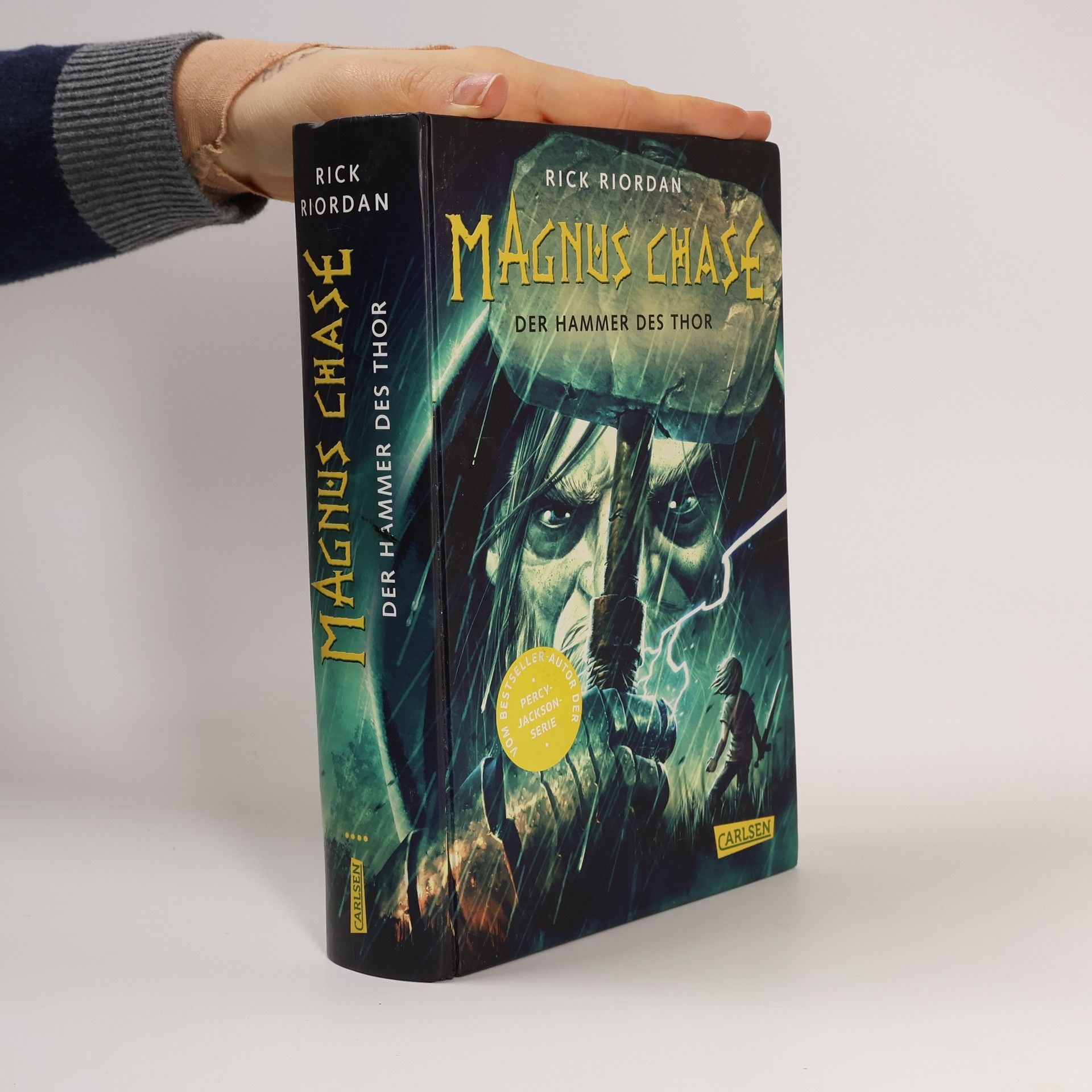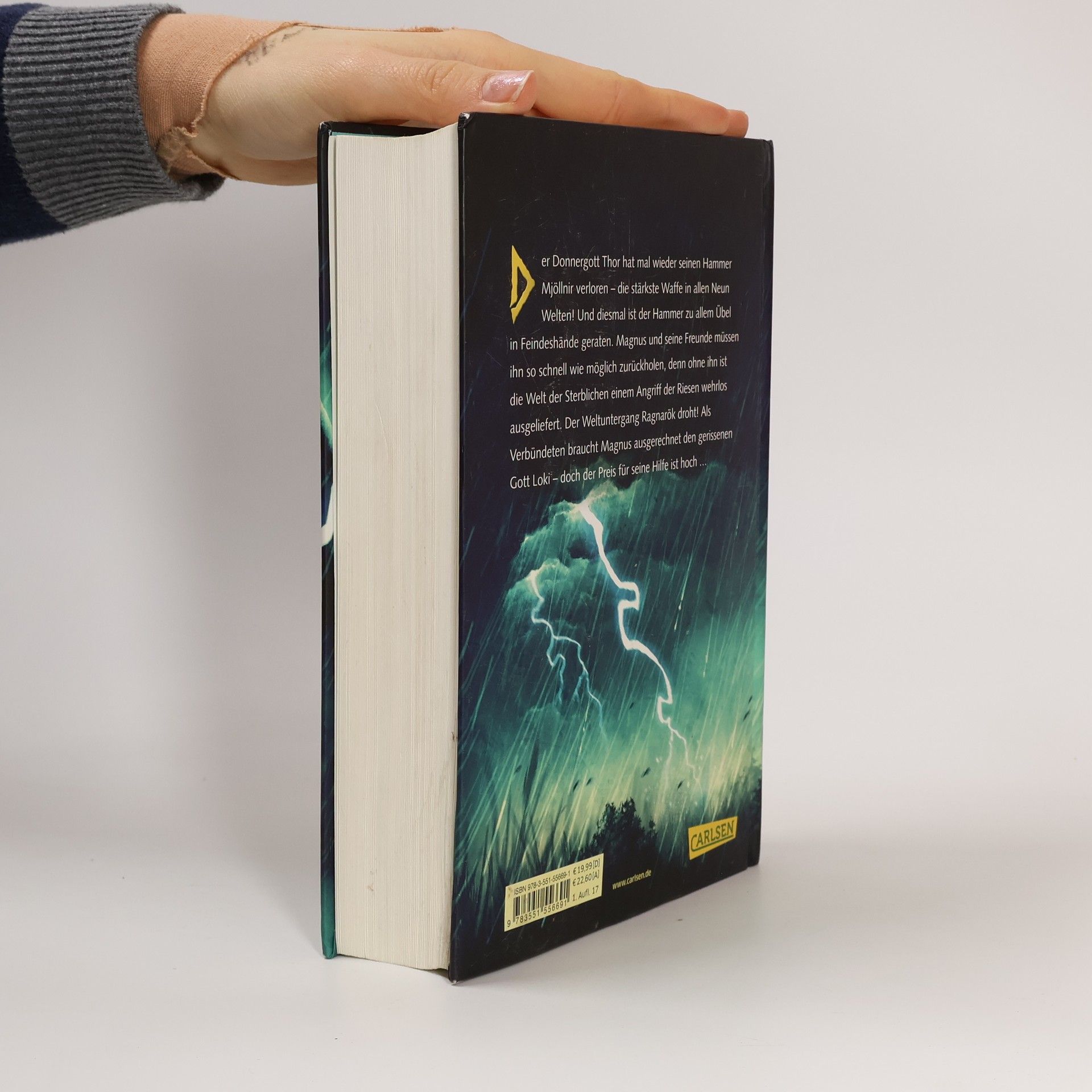 Götter, Riesen und magisches Bowling Der Donnergott Thor hat mal wieder seinen Hammer verloren – eine ziemlich beunruhigende Angewohnheit, immerhin handelt es sich dabei um die mächtigste Waffe der Neun Welten! Und dieses Mal ist er zu allem Übel in die Hände des Feindes geraten. Magnus Chase und seine Freunde müssen den Hammer so schnell wie möglich zurückholen, denn ohne ihn ist die Welt der Sterblichen einem Angriff von Riesen wehrlos ausgeliefert. Der Weltuntergang Ragnarök droht! Um ihr Ziel zu erreichen, benötigen die Freunde einen Verbündeten - und das ist ausgerechnet Loki, der Gott der Lügen und Streiche. Leider ist Loki die einzige Person, die einen Deal für die Rückgabe des Hammers aushandeln kann – doch der Preis für seine Hilfe ist hoch. Aus dem Universum von „Percy Jackson“ und „Die Kane-Chroniken“: Magnus Chase Der 16-jährige Magnus Chase lebt seit dem mysteriösen Tod seiner Mutter auf der Straße. Mit Diebstählen hält er sich über Wasser – bis er eines Tages von seinem besonderen Erbe erfährt: Magnus ist der Sohn des nordischen Gottes Frey und soll die Welt vor dem Untergang retten. In der Fantasy-Trilogie überführt Rick Riordan alte Sagen und Legenden in moderne Geschichten und schafft es, Leser*innen überall auf der Welt für die nordische Mythologie zu begeistern. ***Feuerriesen, Walküren und nordische Götter - packende Fantasy für Leser*innen ab 12 Jahren und für alle Fans der nordischen Mythologie***