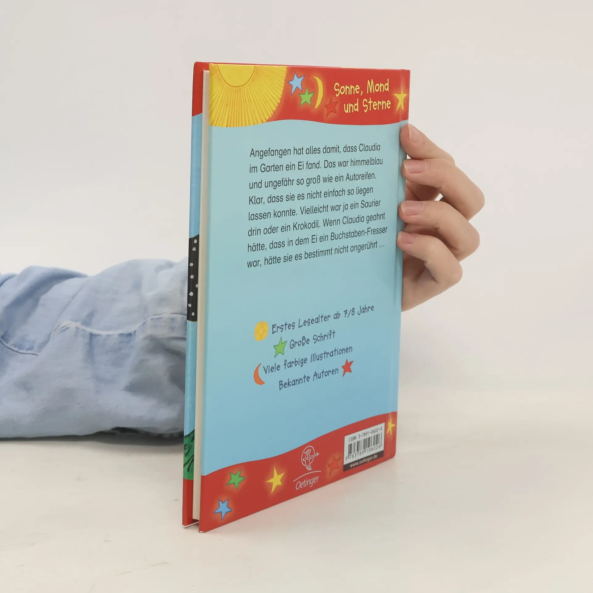 Angefangen hat alles damit, dass Claudia im Garten ein Ei fand. Das war himmelblau und ungefähr so groß wie ein Autoreifen. Klar, dass sie es nicht einfach so liegen lassen konnte. Vielleicht war ja ein Saurier drin oder ein Krokodil. Wenn Claudia geahnt hätte, dass in dem Ei ein Buchstaben-Fresser war, hätte sie es bestimmt nicht angerührt.