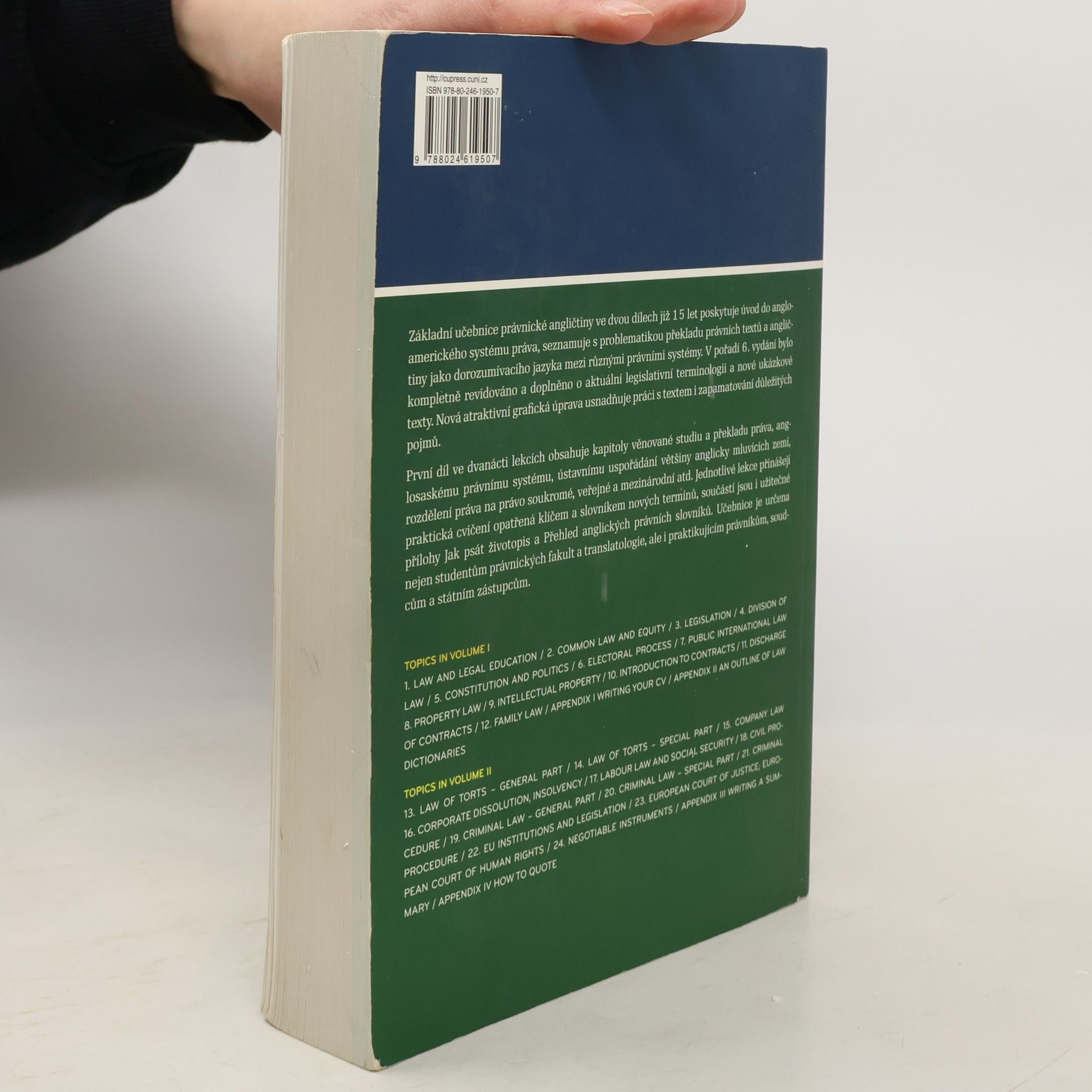 Učebnice právnické angličtiny ve dvou dílech představuje úvod do angloamerického systému práva. První díl ve čtrnácti lekcích seznamuje s ústavním uspořádáním většiny anglicky mluvících zemí, s rozdělením práva na právo soukromým, veřejným a mezinárodním atd. Jednotlivé lekce obsahují mnoho různých cvičení spolu s klíčem a slovníkem nových termínů. Učebnice je určena nejen studentům právnických fakult, ale též i praktikujícím právníkům, soudcům a státním zástupcům.