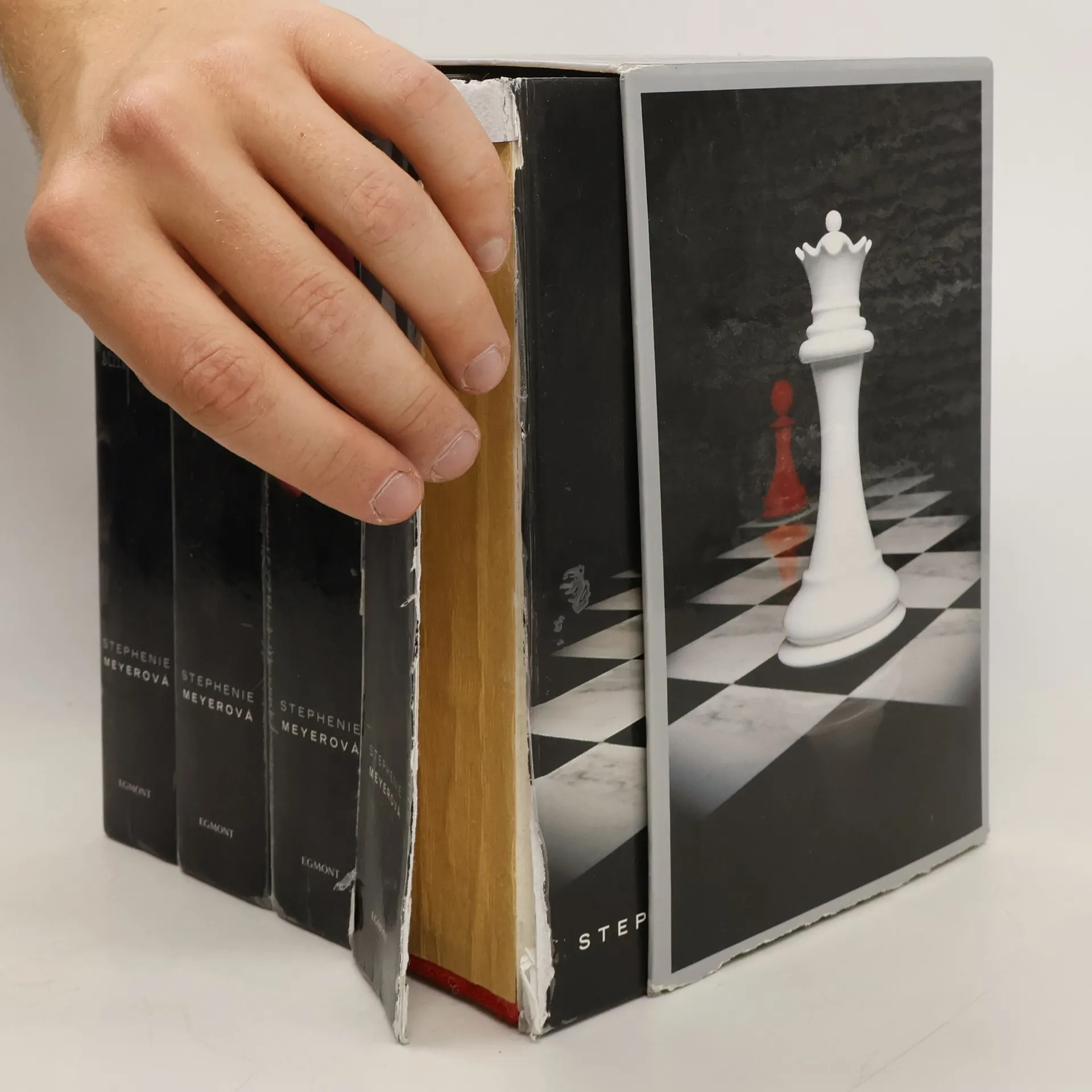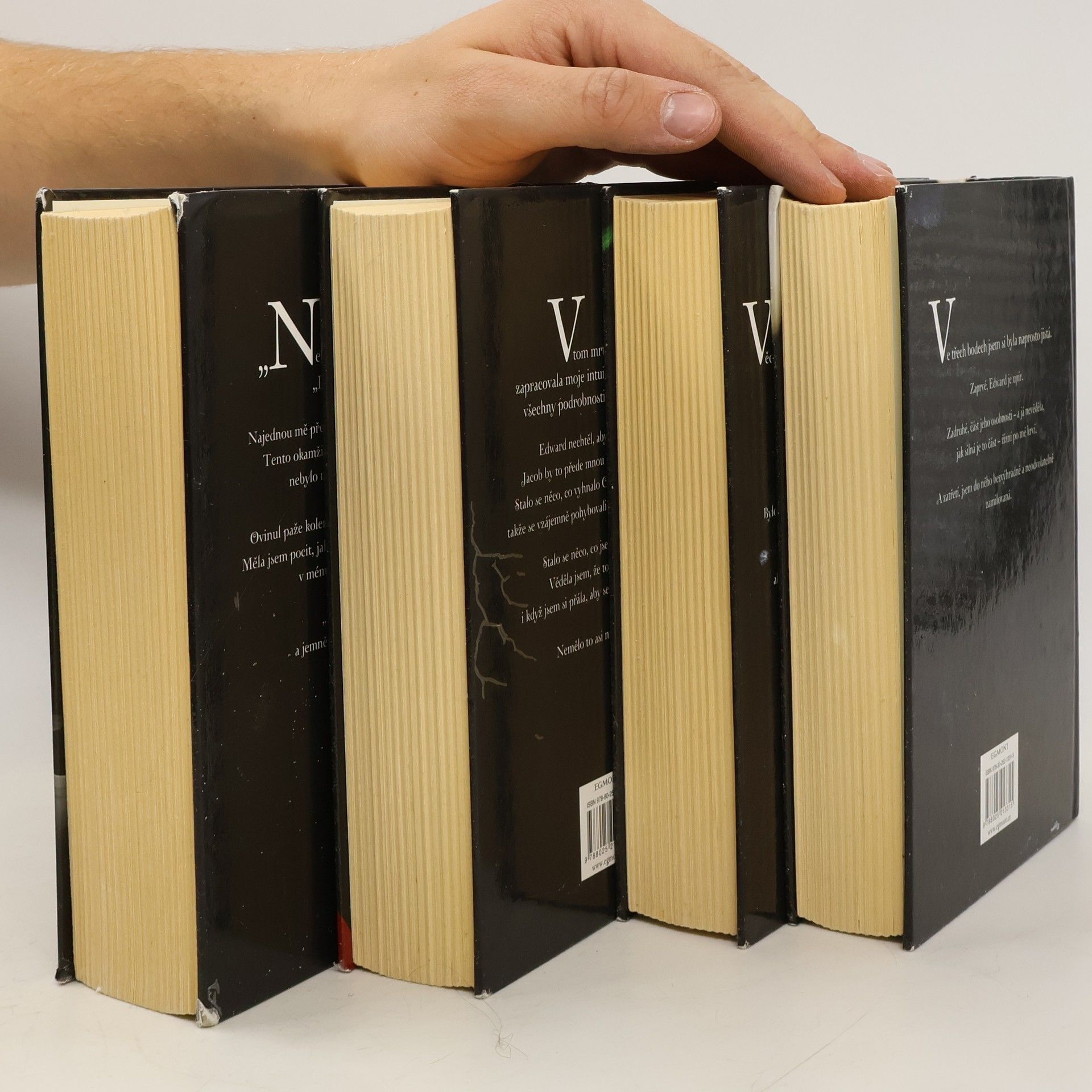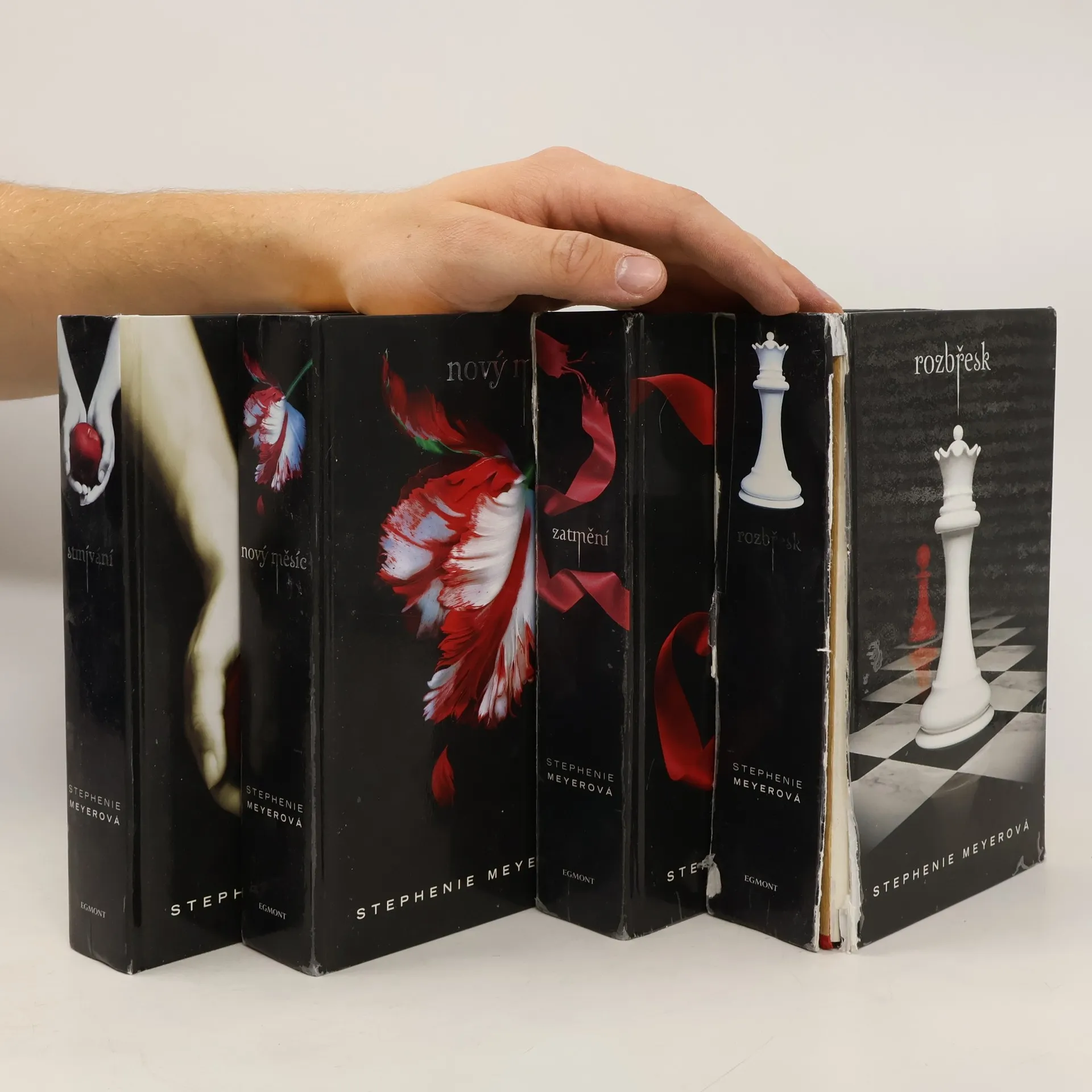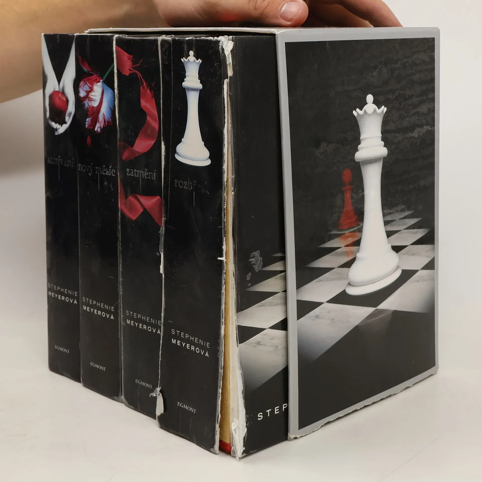 Box obsahující všechny 4 knihy romanticko-hororové ságy: Stmívání, Nový měsíc, Zatmění a Rozbřesk.