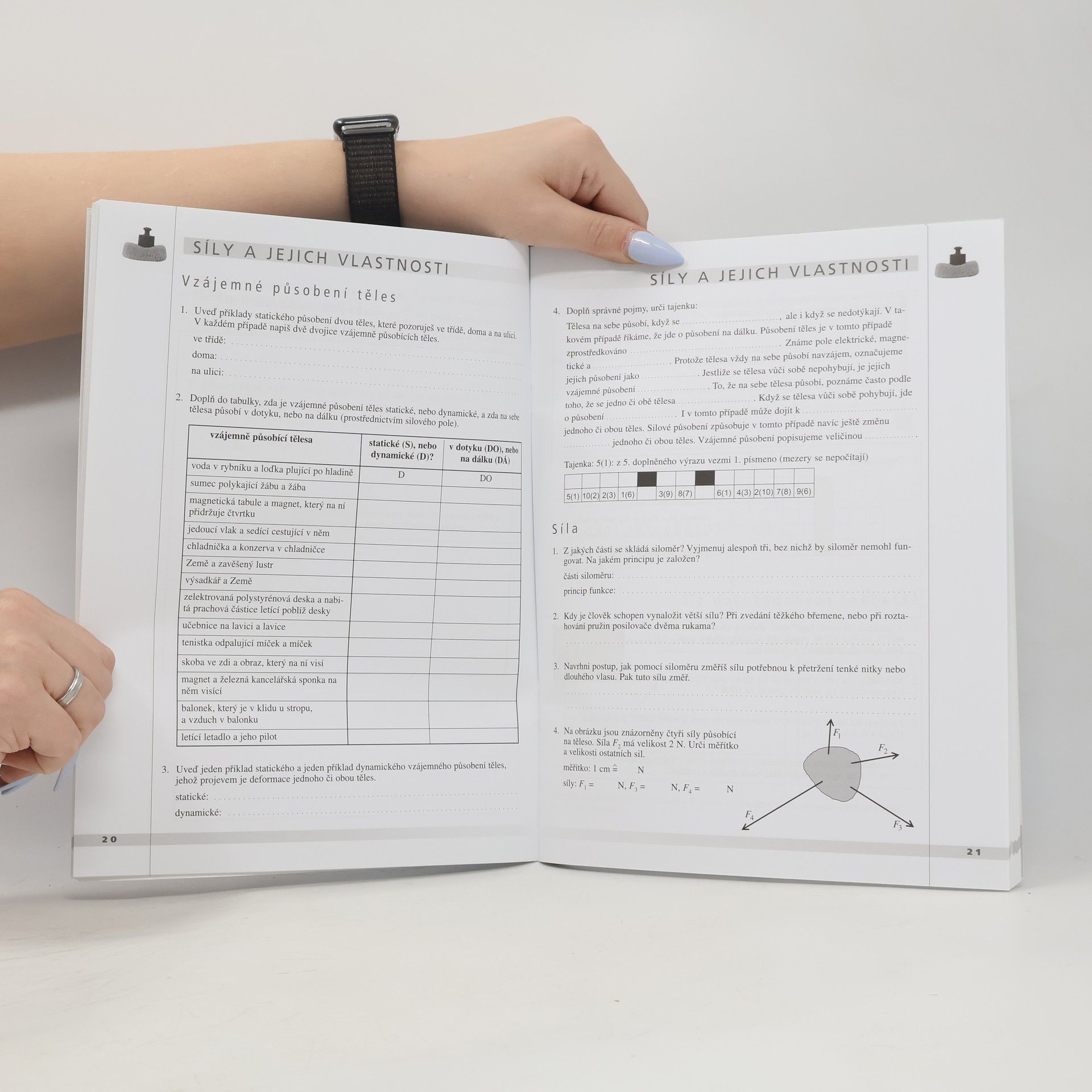 Pracovní sešit obsahuje řadu jednoduchých experimentů, které zdůrazňují praktickou povahu fyziky a jejích zákonů. Zahrnuje doplňovačky a obdobné úkoly, usnadňující pochopení a upevnění vědomostí žáků formou hry. Obsahuje i řadu tradičních úloh na převody mezi vyjádřením veličin v různých jednotkách a číselné příklady procvičující zavedené vztahy. Vyjímatelnou přílohou je Přehled učiva fyziky doplněný o přehledné tabulky nejdůležitějších fyzikálních veličin.