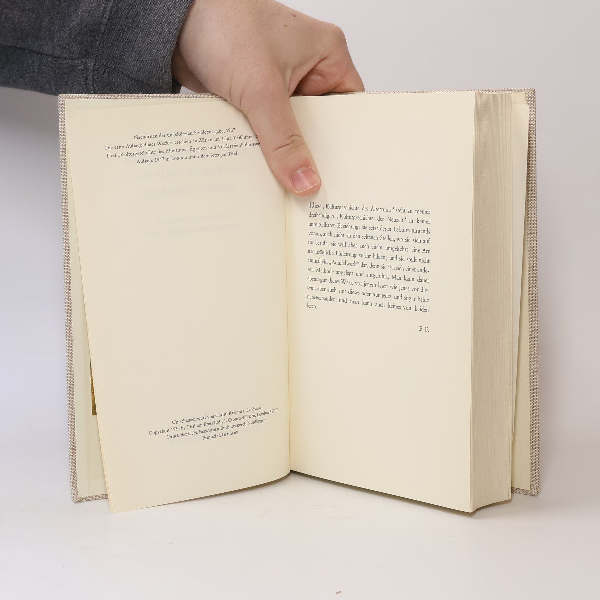 Der 1936 erschienene Band „? Kulturgeschichte Ägyptens und des Alten Orients“?, erstmals in Zürich veröffentlicht, bildet zusammen mit der Kulturgeschichte Griechenlands, das reife Spätwerk des „? geistvoll ironischen Geschichtsphilosophen“?, das als Pendant zu dem erfolgreichen Werk „Kulturgeschichte der Neuzeit“? ebenfalls auf drei Bände angelegt war. In Folge des tragischen Todes von Egon Friedell - kurz nach dem Einmarsch der Hitlertruppen in Österreich nahm er sich am 16. März 1938 das Leben - wurde der dritte Band, der die römische Zeit behandeln sollte, nicht mehr geschrieben.
