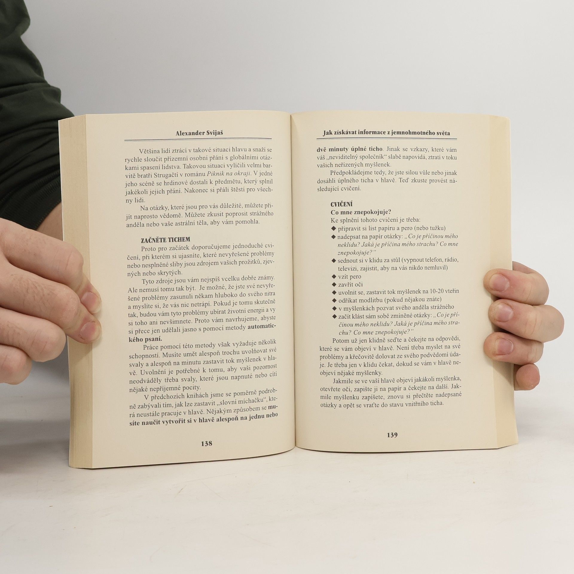 Podrobné a obsáhlé dílo, jenž vás naučí cíleně a vědomě získávat informace z jemnohmotného světa; rozpoznávat, co nebo kdo vám je odevzdává a zda je daný zdroj hodnověrný; jaké povahy tyto informace jsou a jakým způsobem je za ně popřípadě nutné zaplatit. Ruský autor Alexandr Svijaš píše s notnou dávkou humoru, nadhledu a ironie. Pokládá totiž za velmi důležité být sice „duchovní“, ale přitom rozumný. Témy, které se zde probírají: Co je to jemnohmotný svět. Odkud a jak přichází odpověď, jestliže položíme nějakou otázku s využitím věšteckých nástrojů. S kým (s jakým zdrojem informací) lze komunikovat i jak si z daných možností vybírat. Nač si přitom dávat pozor. Jak prověřit hodnověrnost získané informace. Podvědomí, astrální cestování, sny, automatické psaní, práce s kyvadlem a virgulí, jasnovidectví, duchové zemřelých, andělé, démoni, egregory. Samostatná část se zabývá otázkou bezpečnosti při snahách kontaktovat jemnohmotný svět. Jestliže se naučíme rozeznávat a chápat různé síly, jež stojí za všelijakými informacemi, zprávami nebo znameními, které k nám přicházejí, dokážeme se lépe rozhodovat. A současně se odnaučíme podléhat strachu, paranoiám a bludům!