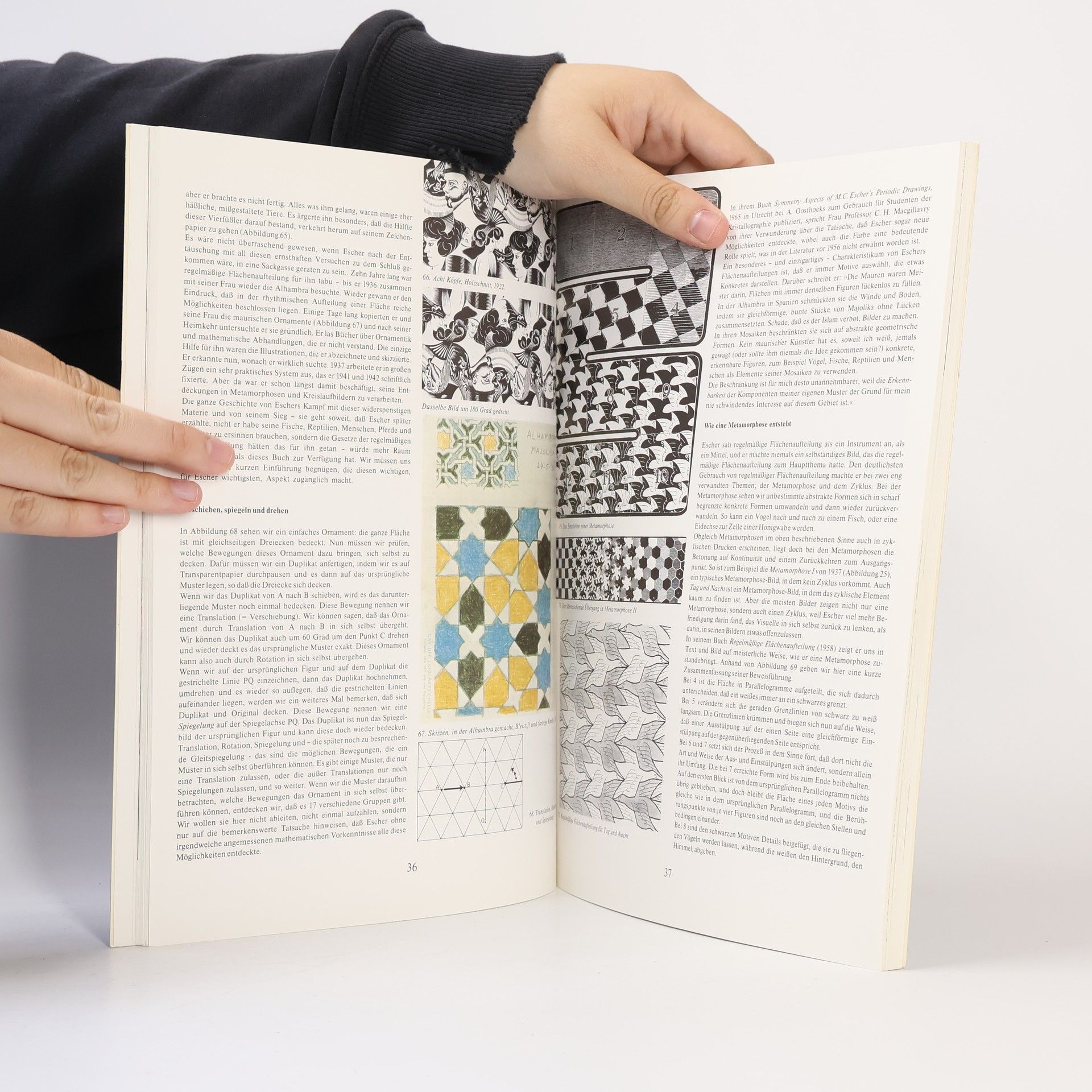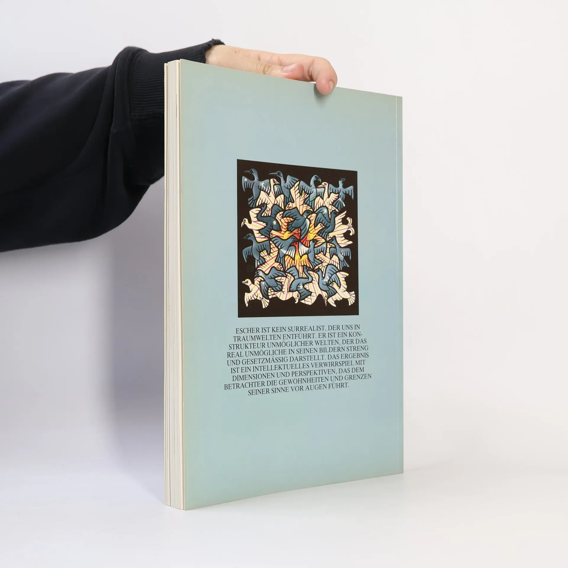 Escher ist kein Surrealist, der uns in Traumwelten entführt. Er ist ein Konstrukteur unmöglicher Welten, der das real Unmögliche in seinen Bildern streng und gesetzmäßig darstellt. Das Ergebnis ist ein intellektuelles Verwirrspiel mit Dimensionen und Perspektiven, das dem Betrachter die Gewohnheiten und Grenzen seiner Sinne vor Augen führt.