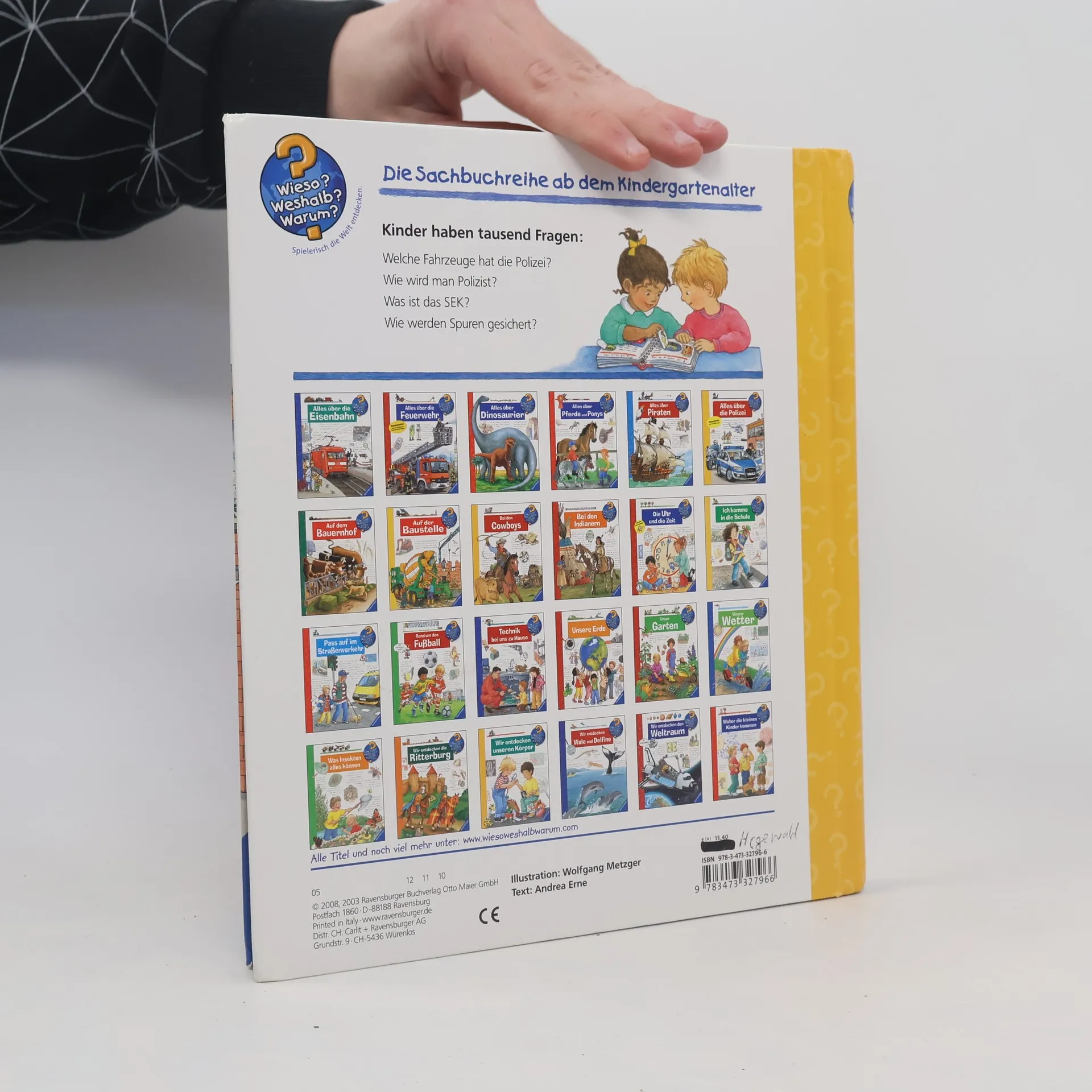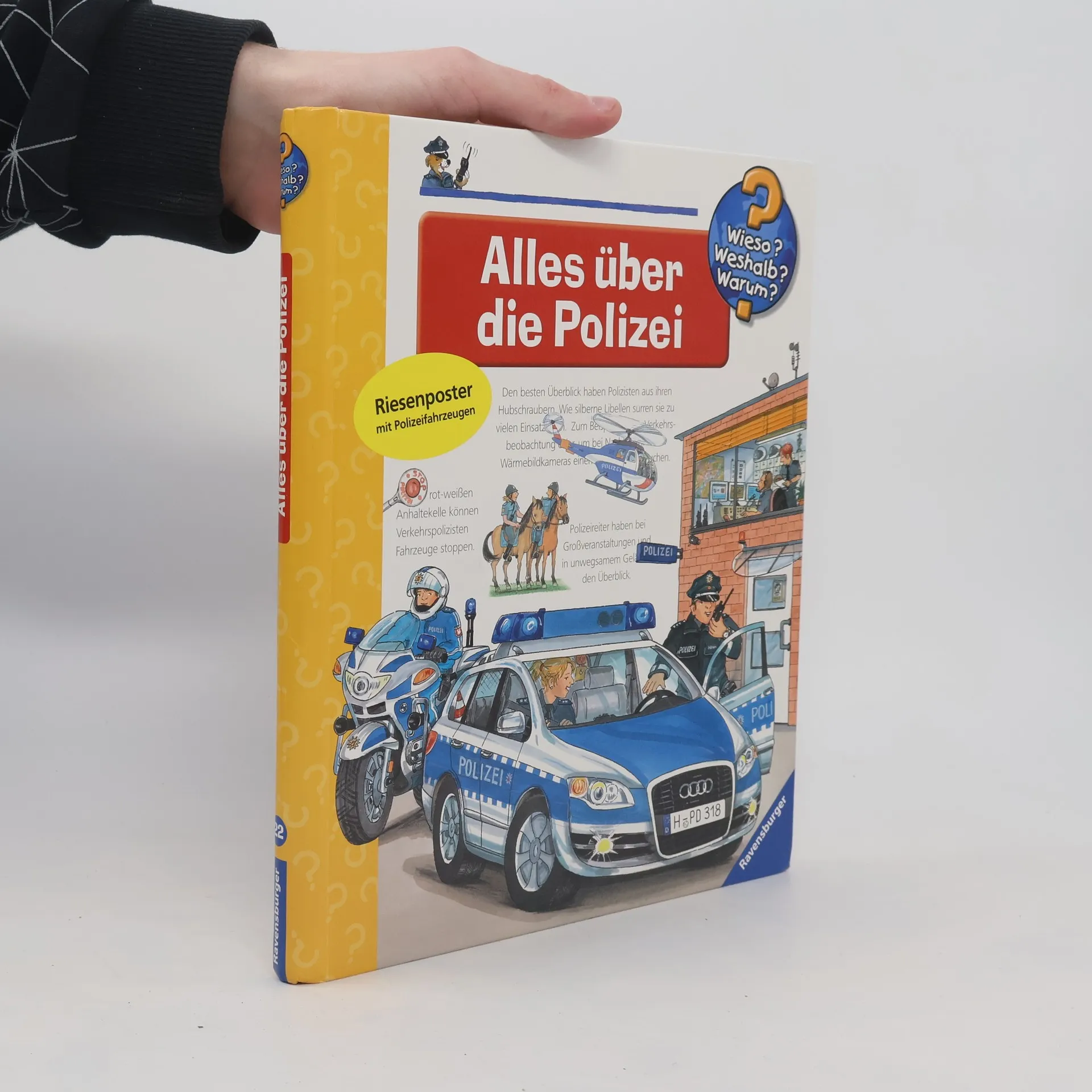 Tatütata, die Polizei ist da! Ob Ladendiebstahl, Einbruch oder Verkehrsunfall – die Frauen und Männer in Blau sind stets einsatzbereit und schnell vor Ort. Das Buch stellt ihre unterschiedlichen Aufgabengebiete, die Ausrüstung und Polizeifahrzeuge vor. Die Kinder erfahren, wie man Polizist wird und was Polizeihunde alles können. Aber auch die Kriminalpolizei, Spurensicherung und verschiedene Spezialeinheiten werden unter die Lupe genommen. Wieso? Weshalb? Warum? Die Sachbuchreihe für Kinder von 4–7 Jahren Jeden Tag entdecken Kinder etwas Neues – da kommen viele Fragen auf. Warum sind die Dinosaurier ausgestorben? Wo ist die Sonne in der Nacht? Wozu brauchen wir das Blut? Die beliebte Sachbuchreihe Wieso? Weshalb? Warum? gibt Kindern Antworten auf Augenhöhe. Dabei werden die unterschiedlichsten Themen aus der Alltags- und Interessenswelt der Kinder altersgerecht und mit viel Liebe zum Detail unter die Lupe genommen. Detailreiche Bilder, verständliche Sachtexte und überraschende Klappen, die Bewegungen oder Abläufe veranschaulichen und hinter die Dinge blicken lassen, ermöglichen Kindern, sich ihre Themen selbst zu erschließen. Der Spaß am eigenhändigen Entdecken, die liebevolle Umsetzung und die qualitativ hochwertige Ausstattung garantieren langanhaltende Freude an jedem einzelnen Buch.
