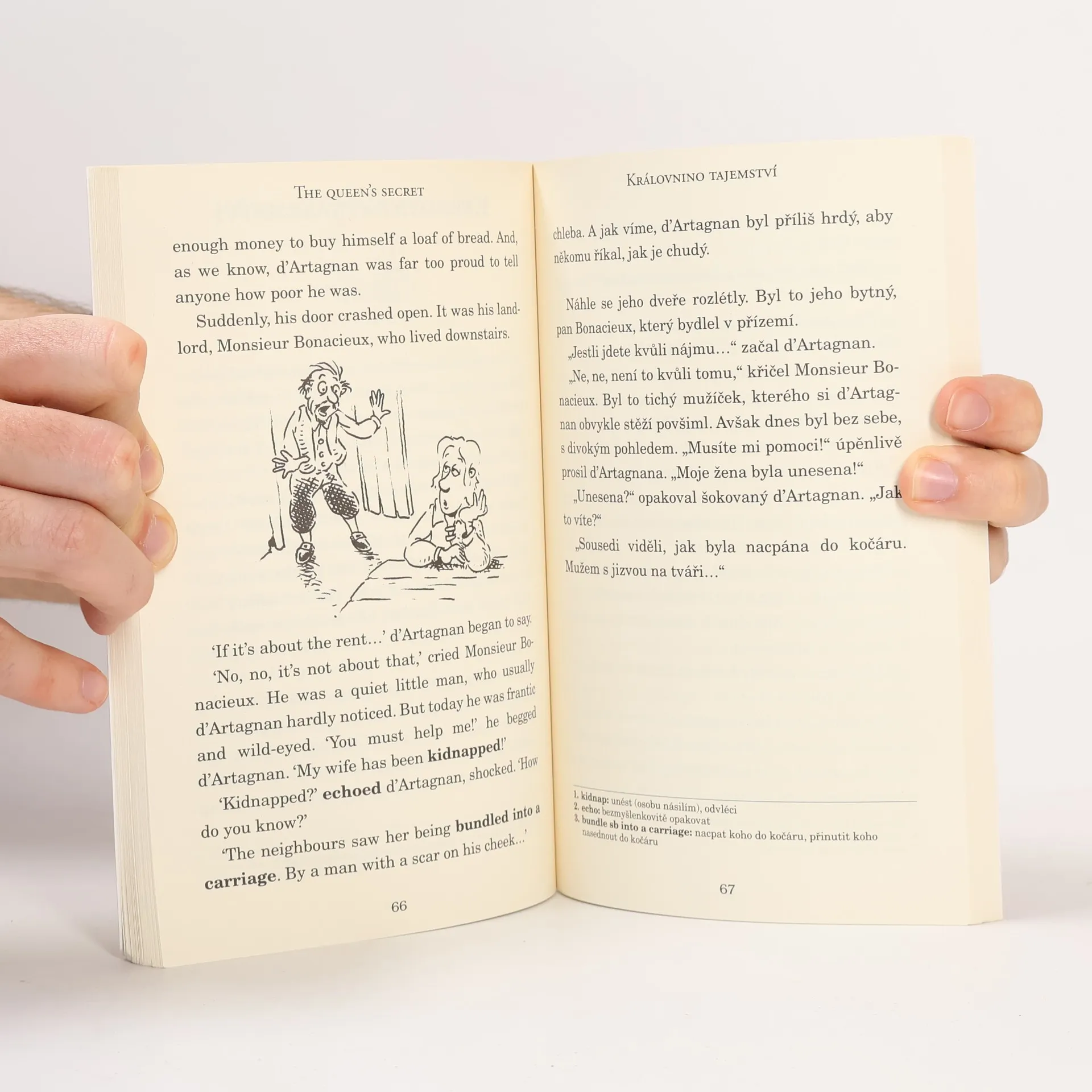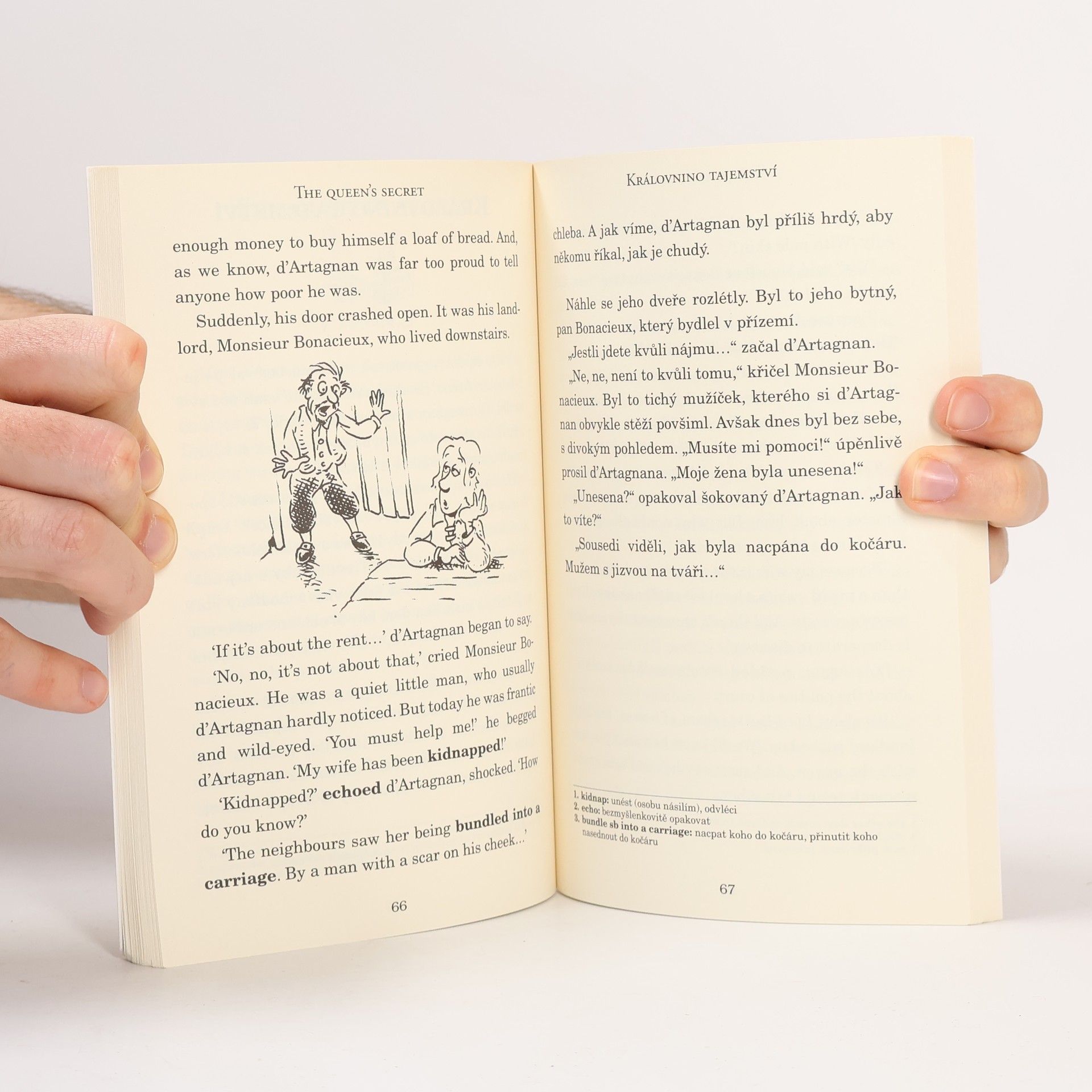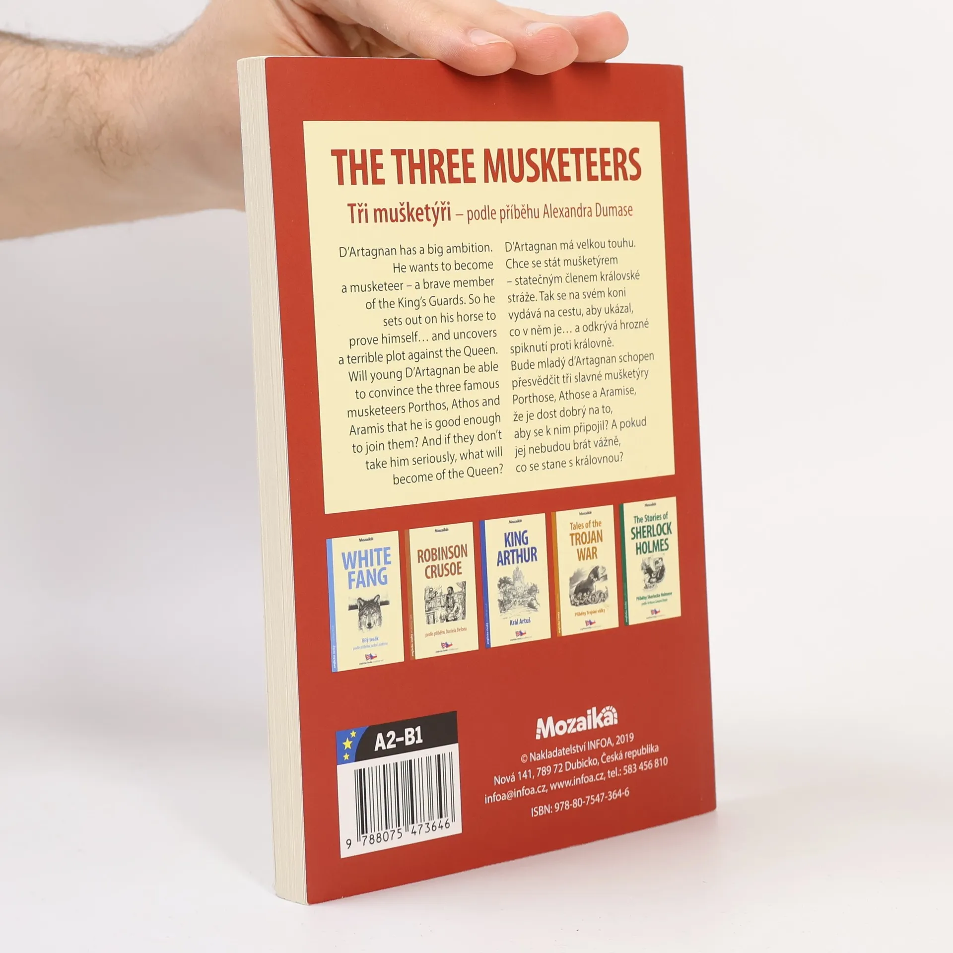 Anglicko-český zjednodušený text. A2-B1. Tři mušketýři podle příběhu Alexandra Dumase. D'Artagnan má velkou touhu. Chce se stát mušketýrem – statečným členem královské stráže. Tak se na svém koni vydává na cestu, aby ukázal, co v něm je... a odkrývá hrozné spiknutí proti královně. Bude mladý D'Artagnan schopen přesvědčit tři slavné mušketýry Porthose, Athose a Aramise, že je dost dobrý na to, aby se k nim připojil? A pokud jej nebudou brát vážně, co se stane s královnou?