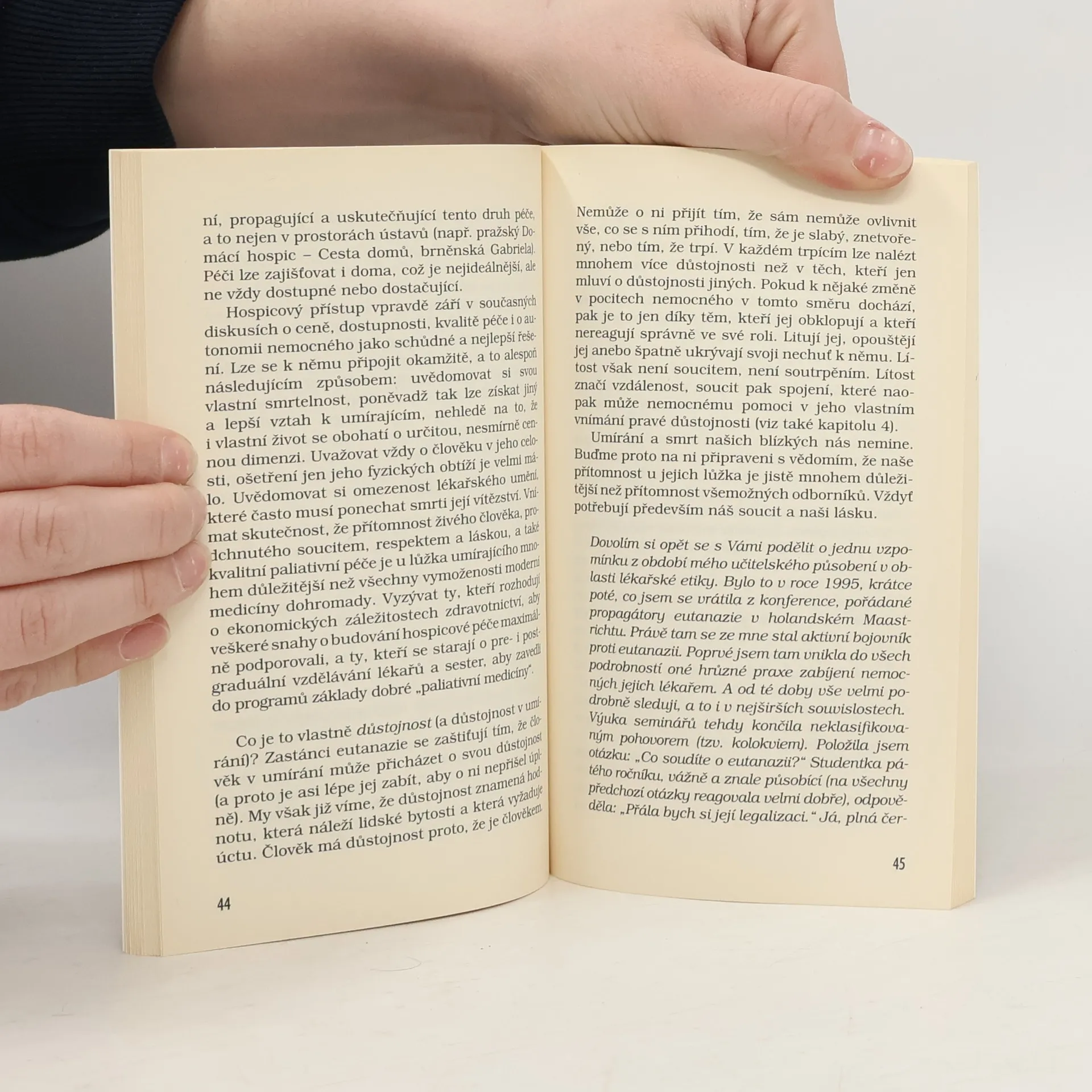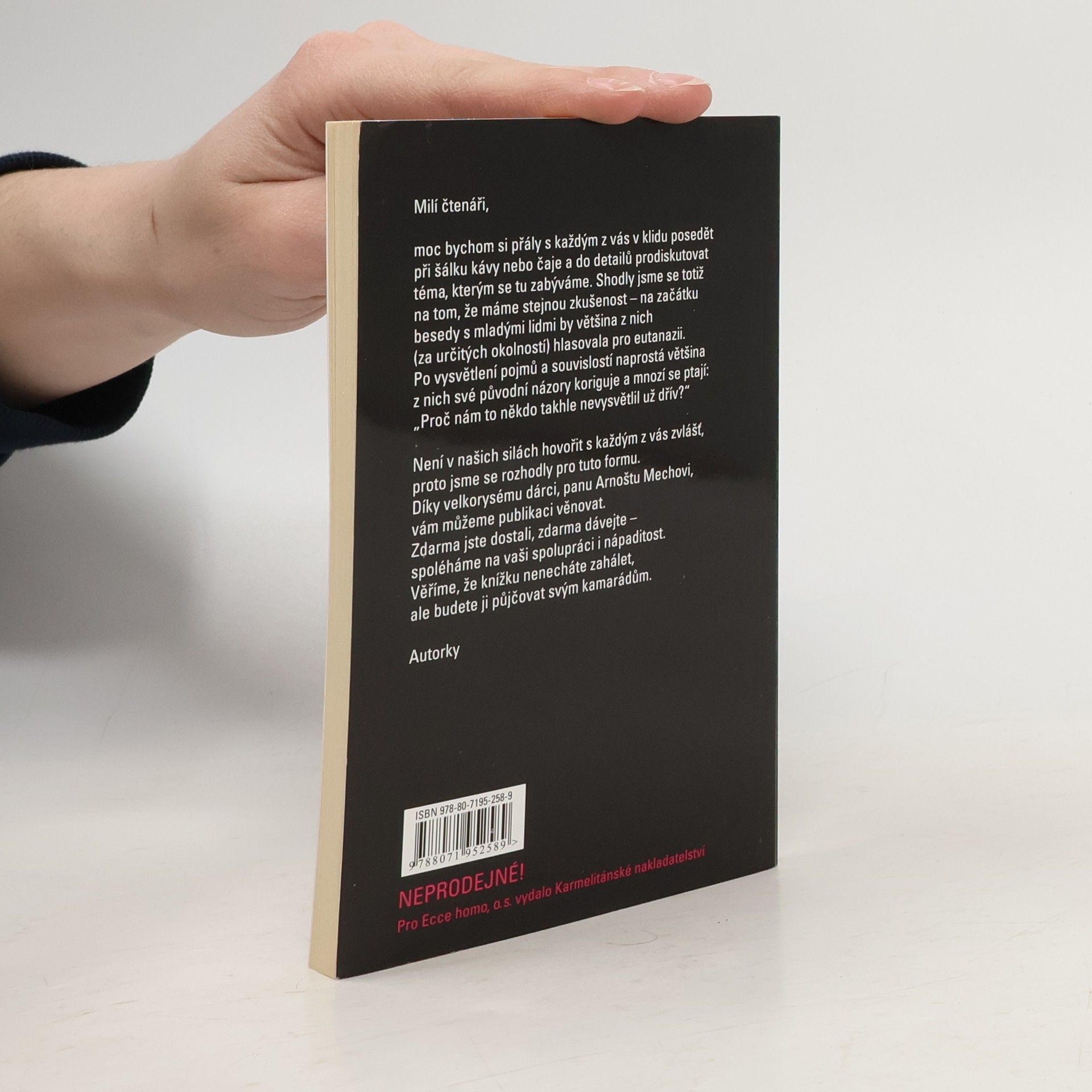 Neprodejné - vydání pro Ecce homo, o.s. Kompletní text publikace určené pro střední školy poskytující základní orientaci v otázkách eutanazie a palitivní péče proložený mnoha příběhy ze života. Autorka se zamýšlí nad tématem dobré smrti, rozebírá vztah lékaře a pacienta. Drobný pohled do minulosti - nacistický program eutanázie. Paliativní a hospicová péče jako cesta k důstojnému umírání a dobré smrti. Jak může každý z nás pomoci?