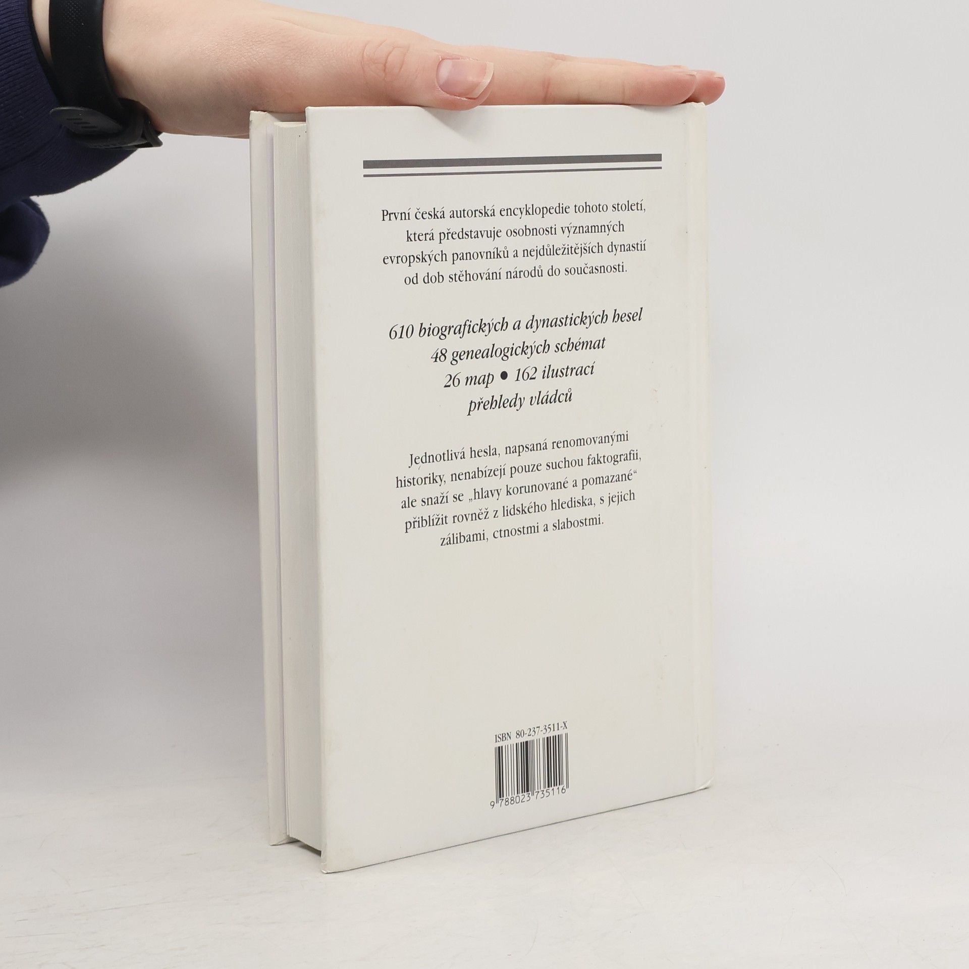 Encyklopedie představuje osobnosti významných evropských panovníků a nejdůležitějších dynastií od dob stěhování národů do současnosti. Obsahuje 610 biografických a dynastických hesel, 48 genealogických schémat, mapy, ilustrace a přehledy vládců.