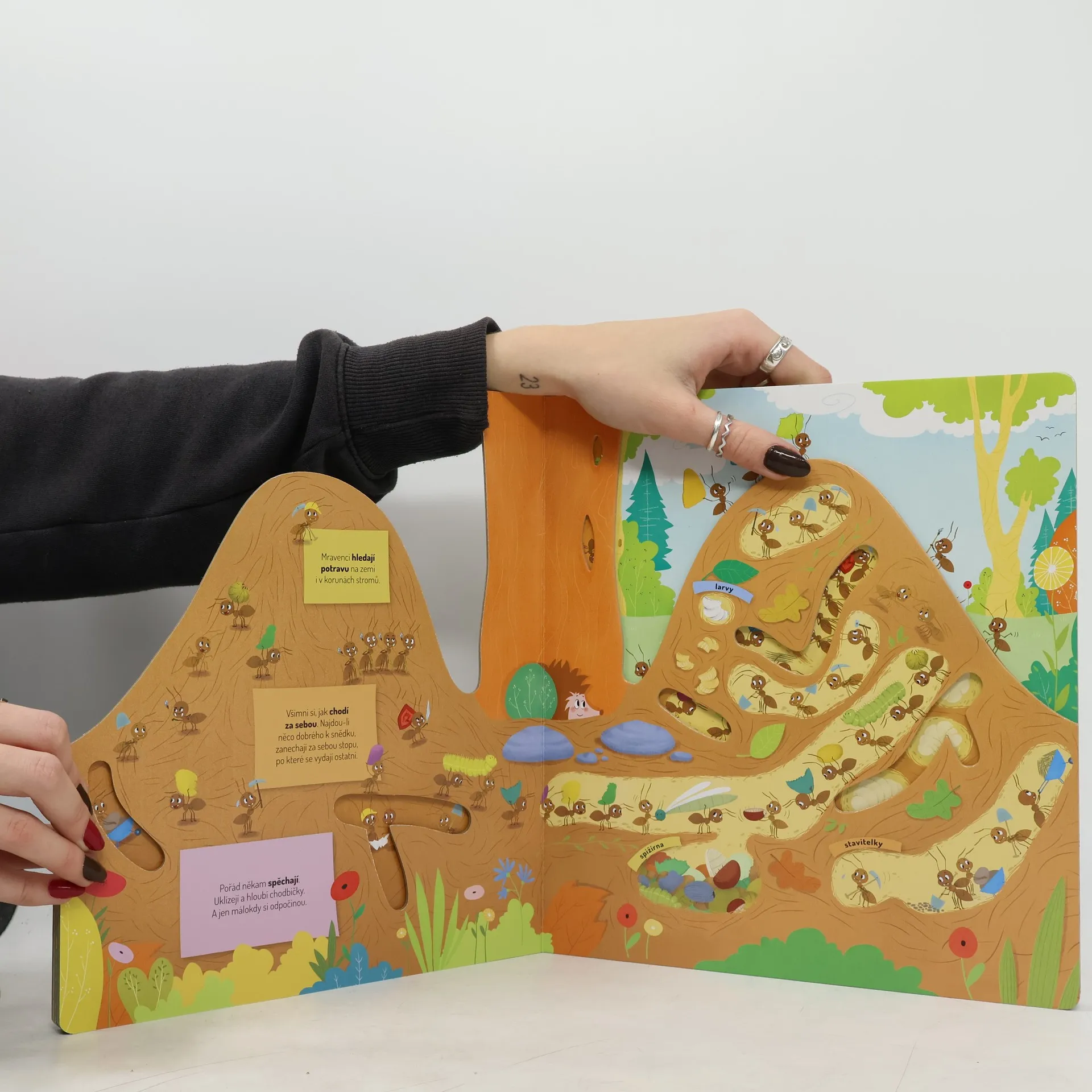 Představ si, že jsi mravenec a strávíš jeden den v mraveništi. Jaké to asi bude? Celý den budeš pořád někam utíkat – uklízet a hloubit chodbičky, hledat různá semínka, abys měl co jíst, a až tě to přestane bavit, vylezeš si úplně nahoru na vršek mravenčí kupy, aby ses opaloval a nahříval si tělíčko. Ale dost už bylo řečí. Víš co? Udělej si pohodlí a pojď se s námi podívat přímo do mraveniště…
