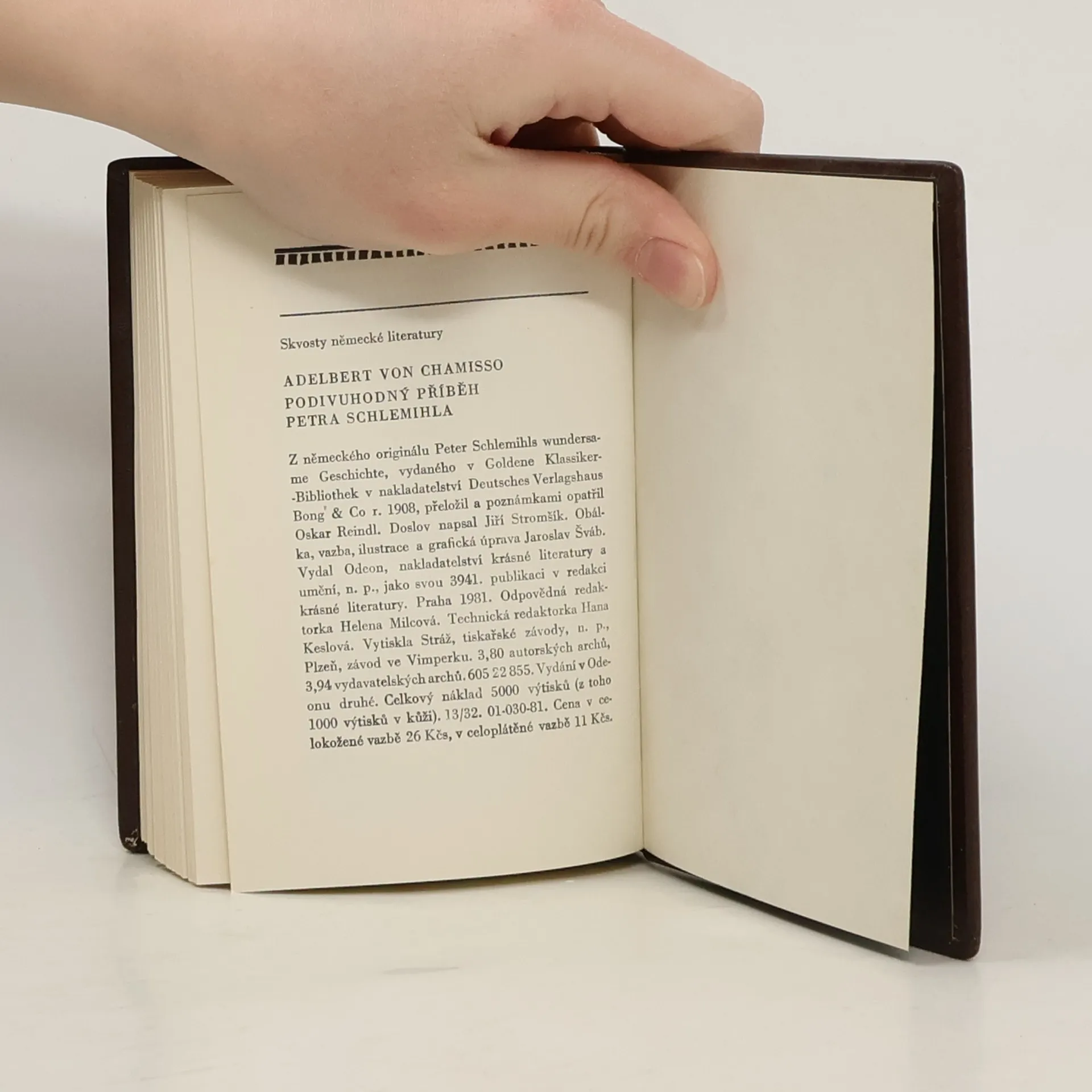 Jedna z nejznámějších novel německé literatury předminulého století, jež proslavila svého autora téměř v celém světě. Chamisso v ní líčí osudy muže, jenž prodal ďáblovi za zlato vlastní stín a vyřadil se tak navždy z lidské společnosti. Je nucen bloudit osaměle v pološeru, střežit se světla i slunce a pokaždé, když se chce připojit k lidem, setká se s někým, kdo mu jeho neštěstí připomene. Ztratí přátele, lásku i radost a podléhá již téměř smutku opuštěnosti, z něhož mu žoky zlaťáků nemohou pomoci, když si konečně uvědomí, že jeho jedinou záchranou je připoutat se k přírodě.