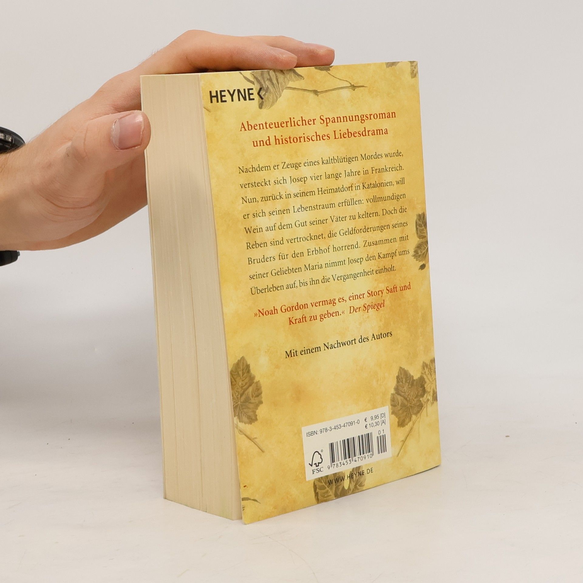 Mit der Kraft des spanischen Weins Nachdem er Zeuge eines kaltblütigen Mordes wurde, versteckt sich Josep vier lange Jahre in Frankreich. Nun, zurück in seinem Heimatdorf in Katalonien, will er sich seinen Lebenstraum erfüllen: vollmundigen Wein auf dem Gut seiner Väter zu keltern. Doch die Reben sind vertrocknet, die Geldforderungen seines Bruders für den Erbhof horrend. Zusammen mit seiner Geliebten Maria nimmt Josep den Kampf ums Überleben auf, bis ihn die Vergangenheit einholt.Abenteuerlicher Spannungsroman und historisches Liebesdrama – wie es nur Noah Gordon gelingt!