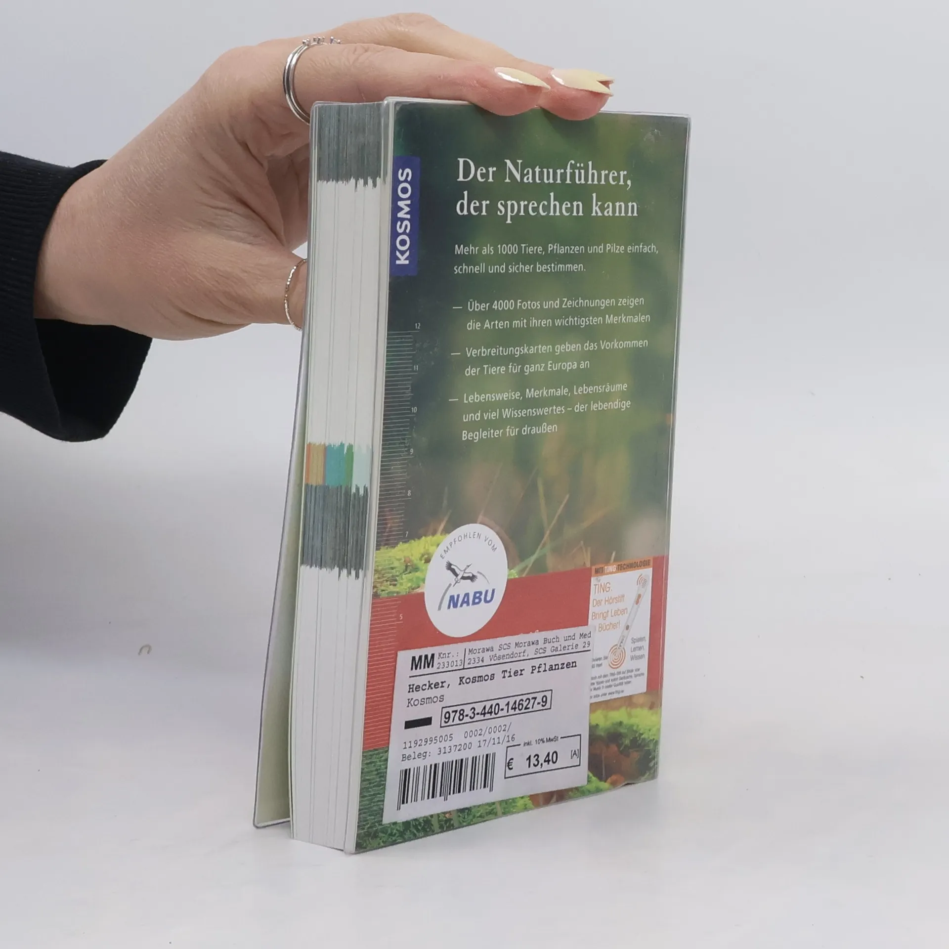 Das „Must have“ für jeden Naturfreund: Aufschlagen und sich mit dem KOSMOS-Farbcode schnell im Buch zurechtfinden. Das Bestimmen von 1.000 europäischen Tieren und Pflanzen gelingt mit den bis zu vier Abbildungen pro Art und der direkten Verknüpfung von Text und Bild ganz einfach. Verbreitungskarten zeigen, wo welche Tiere am besten zu beobachten sind. Viel Wissenswertes über die reinen Bestimmungsmerkmale hinaus und die Möglichkeit, 250 Tierstimmen mit dem TING-Stift (separat im Handel erhältlich) zu hören, machen diesen Naturführer zu einem lebendigen Begleiter. Mit seinem handlichen Format passt er in jeden Wanderrucksack und ist damit auch ideal für unterwegs. Empfohlen vom NABU.