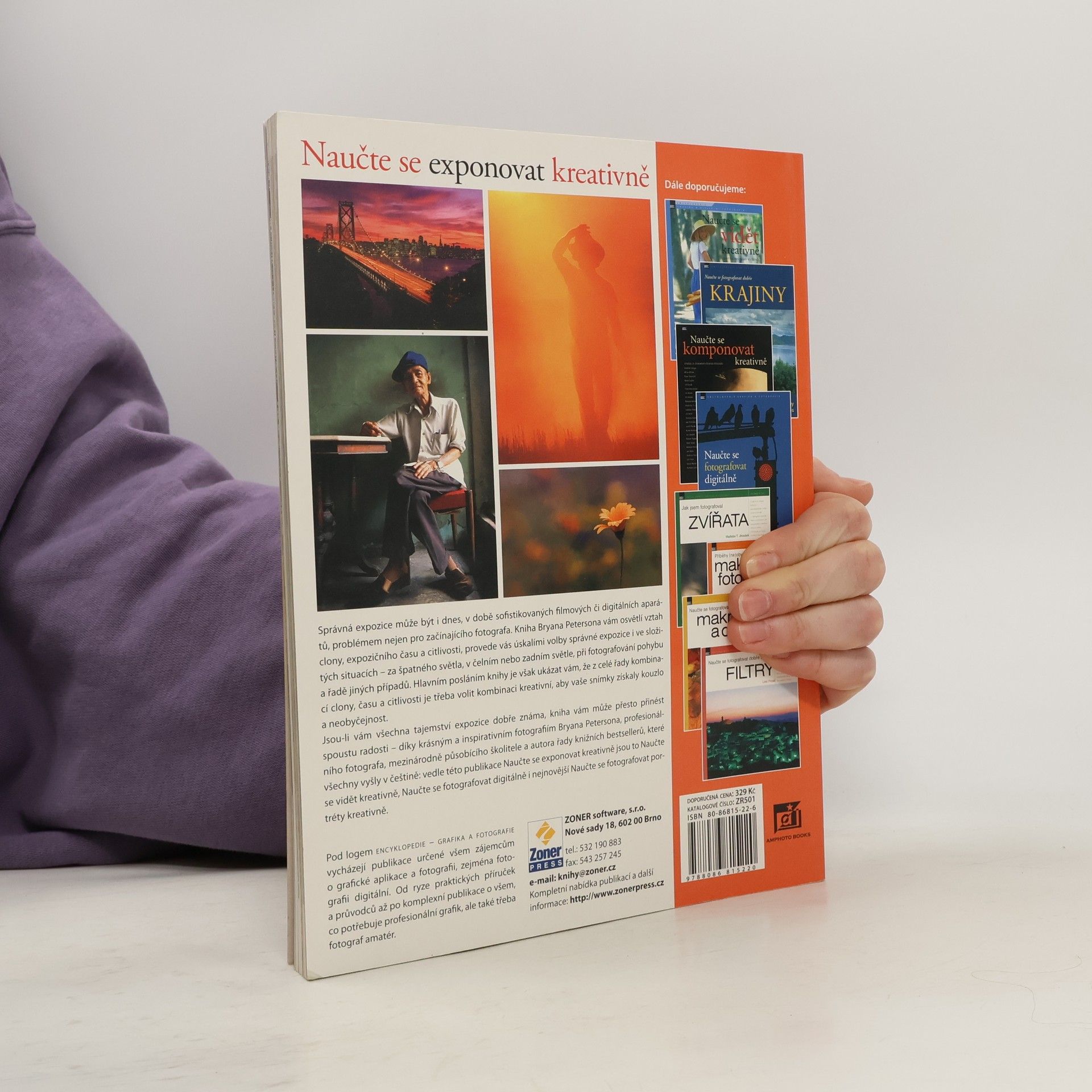 Správná expozice může být i dnes, v době sofistikovaných filmových či digitálních aparátů, problémem nejen pro začínajícího fotografa. Kniha Bryana Petersona vám osvětlí vztah clony, expozičního času a citlivosti, provede vás úskalími volby správné expozice i ve složitých situacích – za špatného světla, v čelním nebo zadním světle, při fotografování pohybu a řadě jiných případů. Hlavním posláním knihy je však ukázat vám, že z celé řady kombinací clony, času a citlivosti je třeba volit kombinaci kreativní, aby vaše snímky získaly kouzlo, a neobyčejnost. Jsou-li vám všechna tajemství expozice dobře známa, kniha vám může přesto přinést spoustu radosti – díky krásným a inspirativním fotografiím Bryana Petersona, profesionálního fotografa, mezinárodně působícího školitele a autora řady knižních bestsellerů, z nichž v roce 2004 v češtině vyšla publikace Naučte se vidět kreativně.