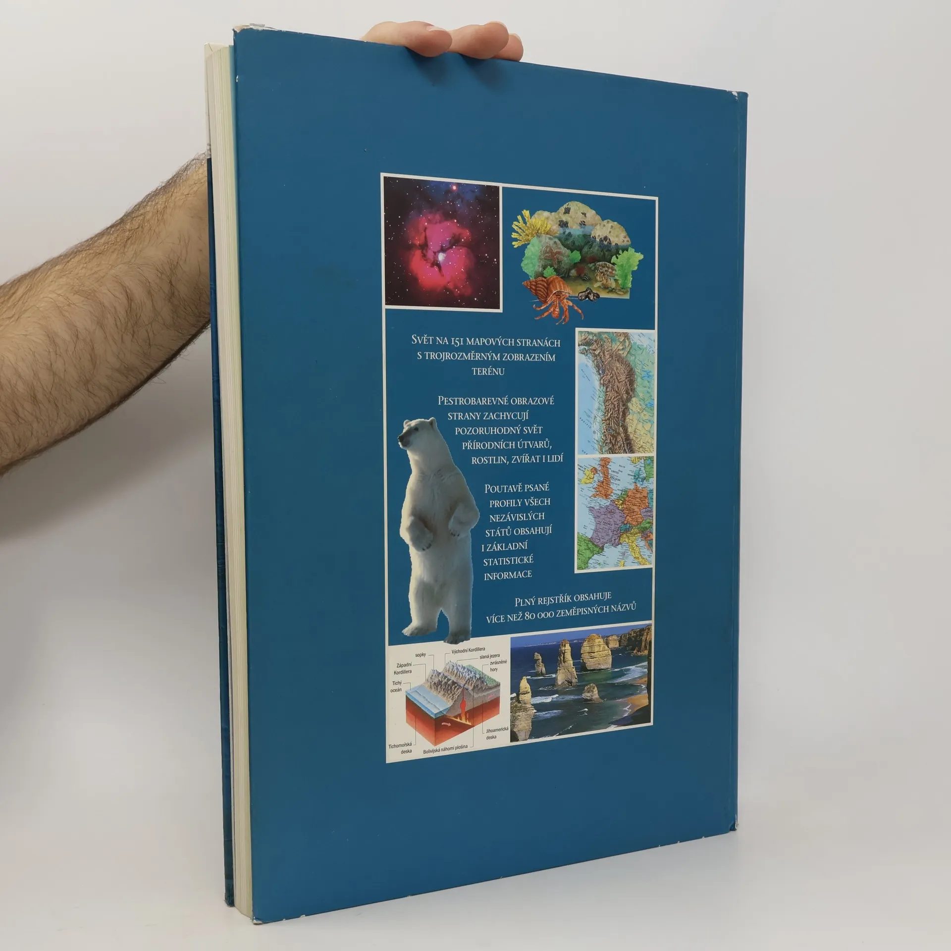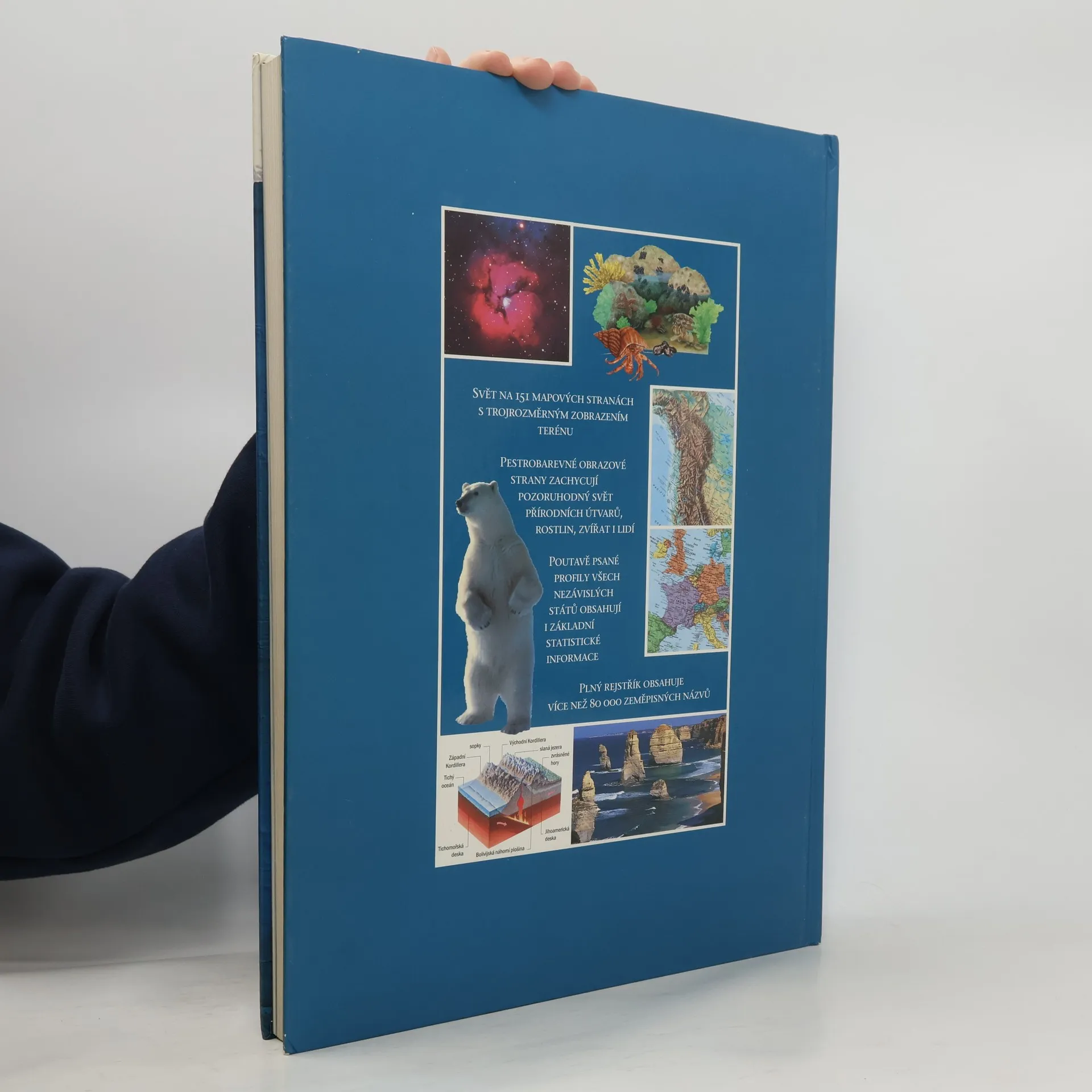 Svět na 151 mapových stranách s trojrozměrným zobrazením terénu. Pestrobarevné obrazové strany zachycují pozoruhodný svět přírodních útvarů, rostlin, zvířat i lidí. Poutavě psané profily všech nezávislých států obsahují i základní statistické informace. Plný rejstřík obsahuje více než 80 000 zeměpisných názvů. Obsah: 1. Příběh planety Země 2. Svět na mapách 3. Státy světa 4. Místopisný přehled