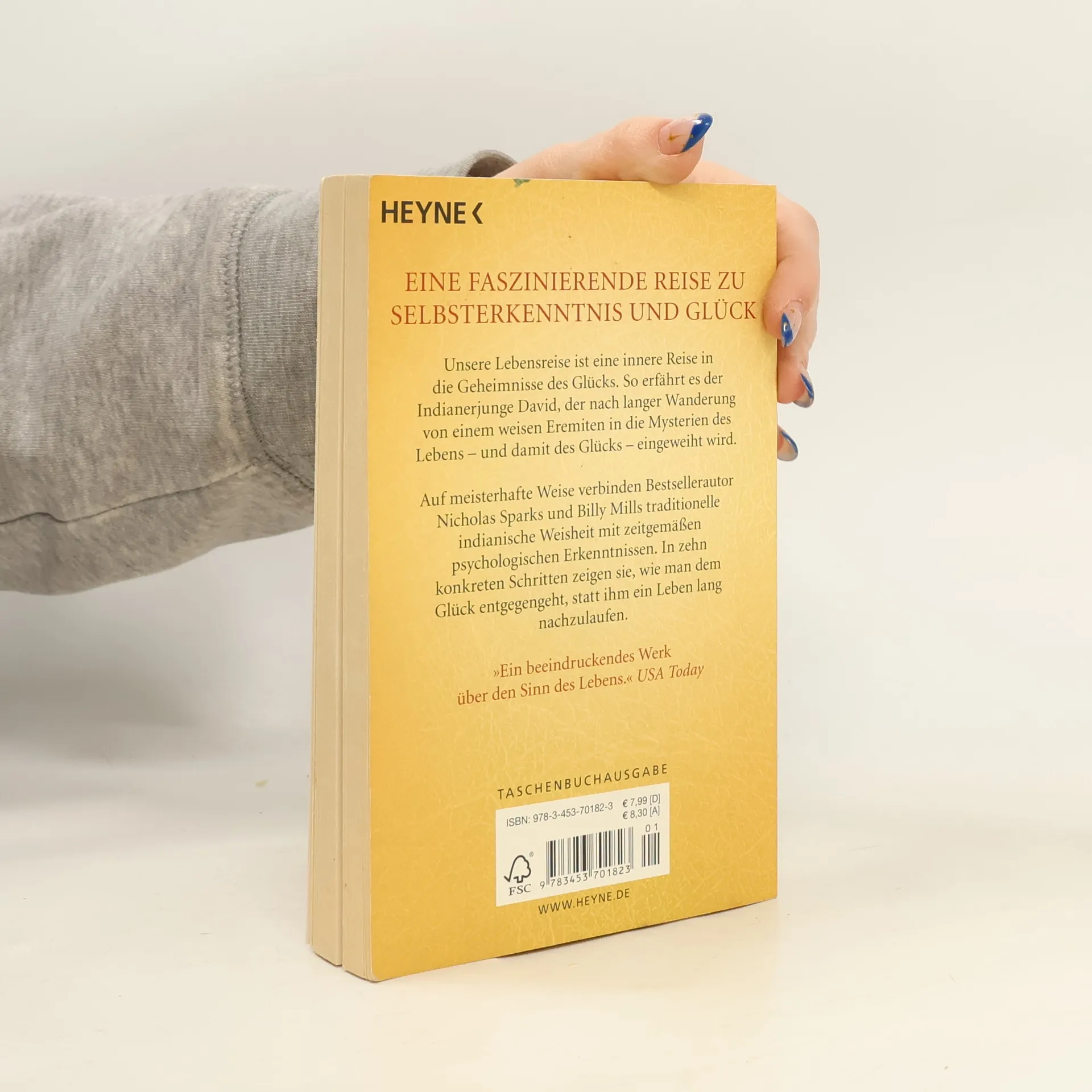 Unsere Lebensreise ist eine innere Reise in die Geheimnisse des Glücks. So erfährt es der Indianerjunge David, der nach langer Wanderung von einem weisen Eremiten in die Mysterien des Lebens – und damit des Glücks – eingeweiht wird. Auf meisterhafte Weise verbinden Bestsellerautor Nicholas Sparks und Billy Mills traditionelle indianische Weisheit mit den Gesetzen des positiven Denkens. In zehn konkreten Schritten erfährt der Leser, wie er mit dem richtigen Bewusstsein dem Glück entgegengeht, statt ihm ein Leben lang nachzulaufen.