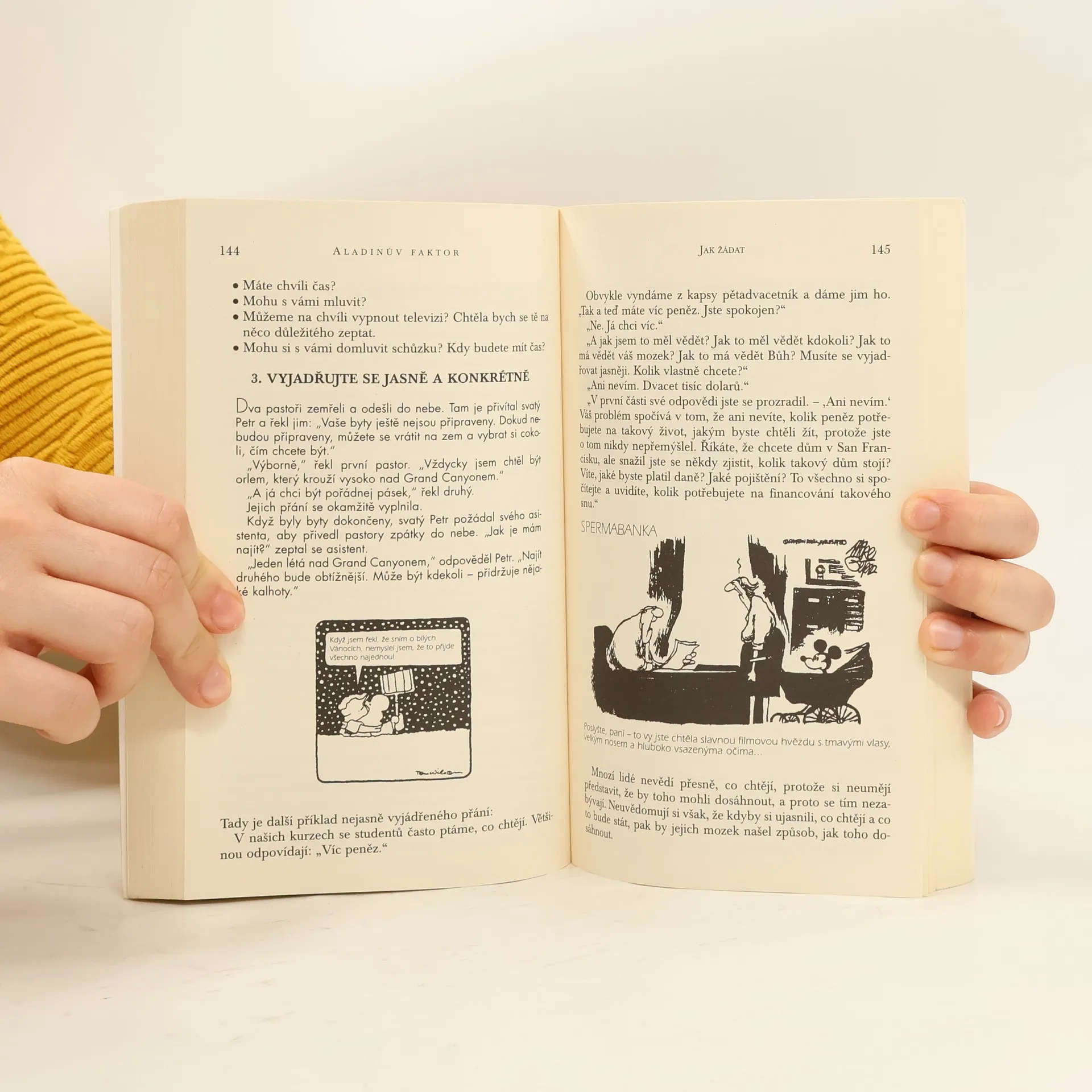 Příběh o Aladinovi ilustruje pět hlavních překážek, které nám brání žádat o to, co chceme: nevědomost, mylný názor, strach, vlastní pýcha a nízká sebeúcta, která nám brání žádat o pomoc, kterou potřebujeme. Na příkladech inspirujících příběhů nás učí jednoduché techniky, jak tyto překážky překonat.