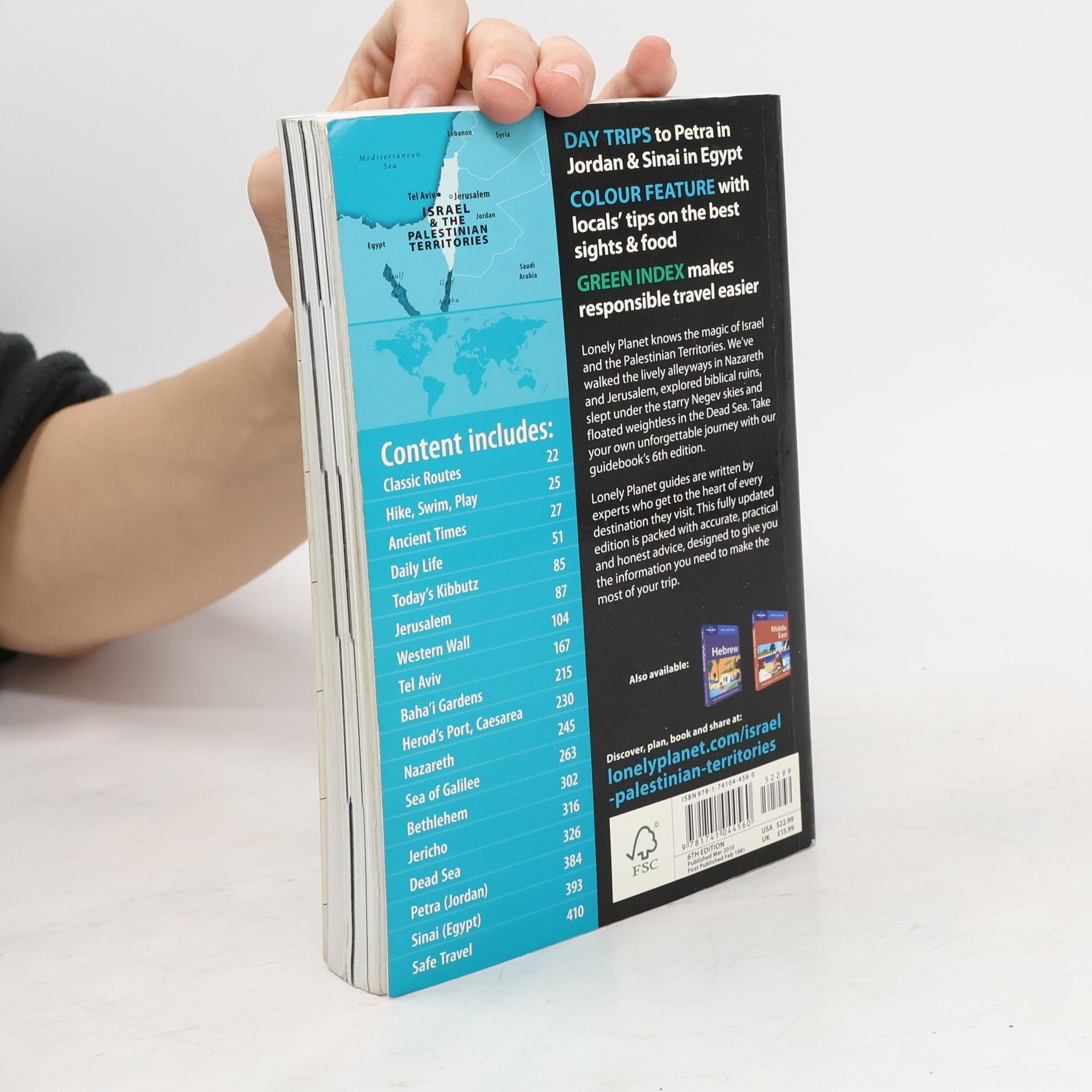 Travel Israel and the Palestinian Territories Travel Guide. Lonely Planet knows the magic of Israel and the Palestinian Territories. Weve walked the lively alleyways in Nazareth and Jerusalem, explored biblical ruins, slept under the starry Negev skies and floated weightless in the Dead Sea. Take your own unforgettable journey with our guidebooks 6th edition. Lonely Planet guides are written by experts who get to the heart of every destination they visit. This fully updated edition is packed with accurate, practical and honest advice, designed to give you the information you need to make the most of your trip. The Israel & the Palestinian Territories Travel Guide Day Trips to Petra in Jordan & Sinai in Egypt Color feature with locals tips on the best sights and food Green Index makes responsible travel easier 8"L x 5"W x 1"H 1 lb.